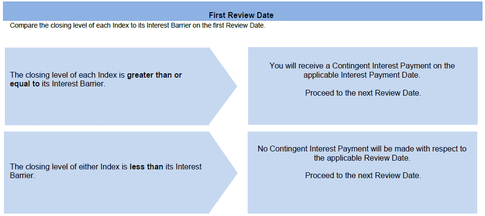 If the notes have not been automatically called, we will make a Contingent Interest Payment with respect to a Review Date only if the closing level of each Index on that Review Date is greater than or equal to its Interest Barrier. If the closing level of either Index on that Review Date is less than its Interest Barrier, no Contingent Interest Payment will be made with respect to that Review Date. Accordingly, if the closing level of either Index on each Review Date is less than its Interest Barrier, you will not receive any interest payments over the term of the notes.