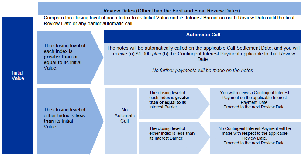 Automatic Call: If the closing level of each Index on any Review Date (other than the first and final Review Dates) is greater than or equal to its Initial Value, the notes will be automatically called for a cash payment, for each $1,000 principal amount note, equal to (a) $1,000 plus (b) the Contingent Interest Payment applicable to that Review Date, payable on the applicable Call Settlement Date. No further payments will be made on the notes. Payment at Maturity: If the notes have not been automatically called and the Final Value of each Index is greater than or equal to its Trigger Value, you will receive a cash payment at maturity, for each $1,000 principal amount note, equal to (a) $1,000 plus (b) the Contingent Interest Payment applicable to the final Review Date. If the notes have not been automatically called and the Final Value of either Index is less than its Trigger Value, your payment at maturity per $1,000 principal amount note will be calculated as follows: $1,000 + ($1,000 × Lesser Performing Index Return) If the notes have not been automatically called and the Final Value of either Index is less than its Trigger Value, you will lose more than 25.00% of your principal amount at maturity and could lose all of your principal amount at maturity. Lesser Performing Index: The Index with the Lesser Performing Index Return Lesser Performing Index Return: The lower of the Index Returns of the Indices Index Return: With respect to each Index, (Final Value – Initial Value) Initial Value: With respect to each Index, the closing level of that Index on the Pricing Date, which was 2,006.159 for the Russell 2000® Index and 5,431.60 for the S&P 500® Index Final Value: With respect to each Index, the closing level of that Index on the final Review Date