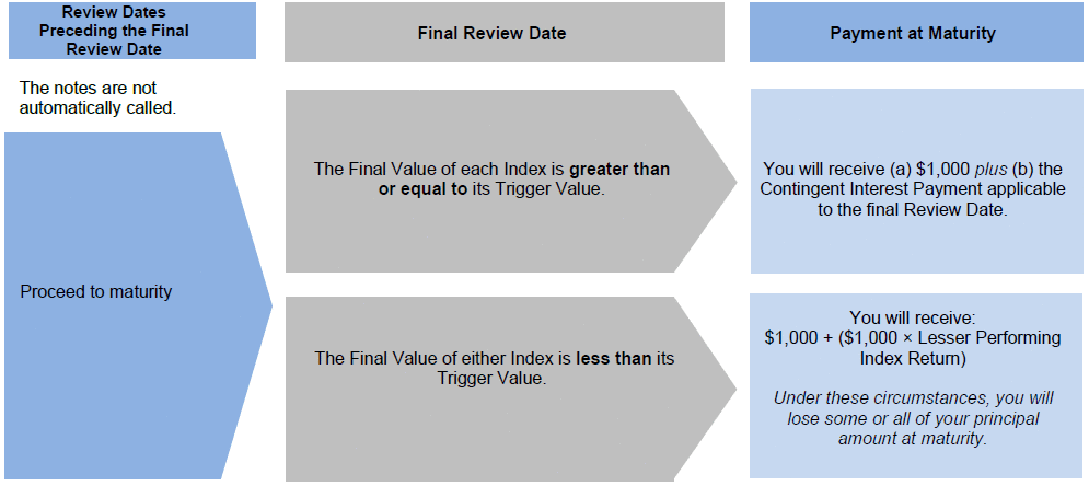 Because the closing level of each Index on the second Review Date is greater than or equal to its Initial Value, the notes will be automatically called for a cash payment, for each $1,000 principal amount note, of $1,018.00 (or $1,000 plus the Contingent Interest Payment applicable to the second Review Date), payable on the applicable Call Settlement Date. The notes are not automatically callable before the second Review Date, even though the closing level of each Index on the first Review Date is greater than its Initial Value. When added to the Contingent Interest Payment received with respect to the prior Review Date, the total amount paid, for each $1,000 principal amount note, is $1,036.00. No further payments will be made on the notes.