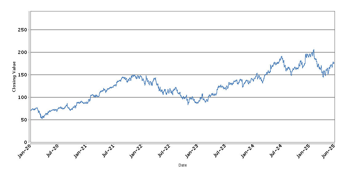 The graph below sets forth the historical performance of Alphabet Inc. based on the daily Closing Value from January 6, 2020 through June 18, 2025. We obtained the Closing Values shown in the graph below from Bloomberg. We have not independently verified the accuracy or completeness of the information obtained from Bloomberg. These historical closing values may have been adjusted to reflect certain corporate actions such as stock splits and reverse stock splits.