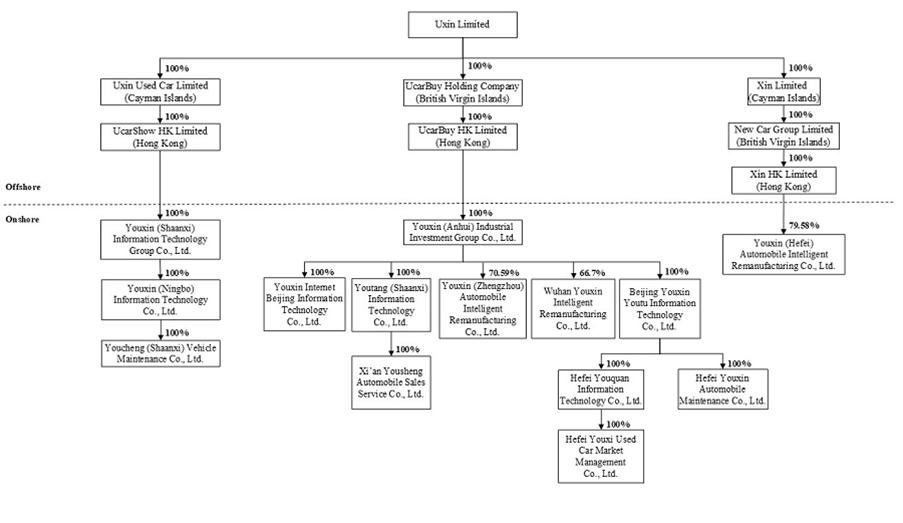 Uxin Limited is not a Chinese operating company but a Cayman Islands holding company with operations primarily conducted by its PRC subsidiaries and, historically, through contractual arrangements with the former VIEs in China. PRC laws and regulations restrict and impose conditions on foreign investment in value-added telecommunication services. In order to comply with PRC regulatory requirements, in the past we primarily operated these businesses in China through Youxin Internet (Beijing) Information Technology Co., Ltd. or Youxin Hulian, and Youxin Yishouche (Beijing) Information Technology Co., Ltd., or Yishouche, which we refer to as the former VIEs in this prospectus. There were historical contractual arrangements among our PRC subsidiaries, the former VIEs and their shareholders, which were effectively terminated on March 31, 2022. As a result of the contractual arrangements, we were able to direct the activities of and derive economic benefits from the former VIEs and were considered the primary beneficiary of the former VIEs for accounting purposes in accordance with Accounting Standards Condition topic 810 under Financial Accounting Standards Board (“FASB ASC 810”). Accordingly, we have consolidated the financial results of the former VIEs in our consolidated financial statements in accordance with U.S. GAAP. Neither Uxin Limited nor its investors have had an equity ownership in, direct foreign investment in, or control, other than as defined under U.S. GAAP, through contractual arrangements with, the former VIEs. The contractual arrangements were not equivalent to an equity ownership in the business of the former VIEs and their subsidiaries in China. As used in this prospectus, “we,” “us,” “our company,” or “our” refers to Uxin Limited and its subsidiaries. Investors in our ADSs are not purchasing equity interest in our subsidiaries or the former VIEs in China but instead are purchasing equity interest in a holding company incorporated in the Cayman Islands, Uxin Limited.