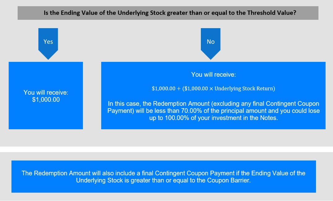 The Redemption Amount will also include a final Contingent Coupon Payment if the Ending Value of the Underlying Stock is greater than or equal to the Coupon Barrier.