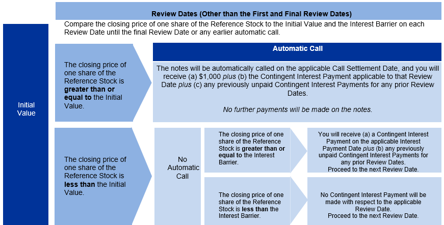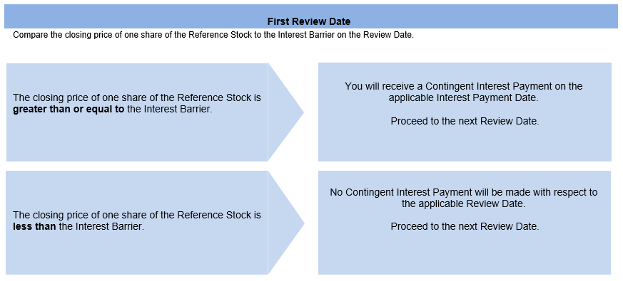 ●If the closing price of one share of the Reference Stock is greater than or equal to the Interest Barrier on any Review Date, investors will receive, in addition to the Contingent Interest Payment with respect to that Review Date, any previously unpaid Contingent Interest Payments for prior Review Dates.