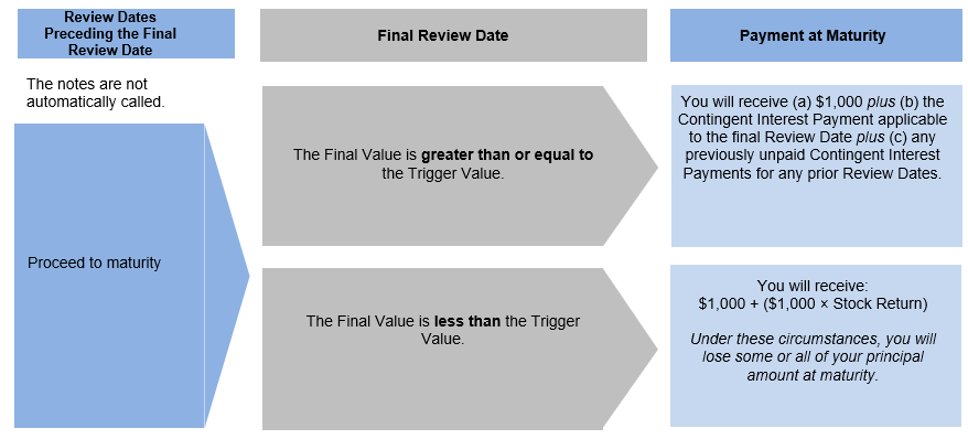 Automatic Call: If the closing price of one share of the Reference Stock on any Review Date (other than the first and final Review Dates) is greater than or equal to the Initial Value, the notes will be automatically called for a cash payment, for each $1,000 principal amount note, equal to (a) $1,000 plus (b) the Contingent Interest Payment applicable to that Review Date plus (c) any previously unpaid Contingent Interest Payments for any prior Review Dates, payable on the applicable Call Settlement Date. No further payments will be made on the notes. Payment at Maturity: If the notes have not been automatically called and the Final Value is greater than or equal to the Trigger Value, you will receive a cash payment at maturity, for each $1,000 principal amount note, equal to (a) $1,000 plus (b) the Contingent Interest Payment applicable to the final Review Date plus (c) any previously unpaid Contingent Interest Payments for any prior Review Dates. If the notes have not been automatically called and the Final Value is less than the Trigger Value, your payment at maturity per $1,000 principal amount note will be calculated as follows: $1,000 + ($1,000 × Stock Return) If the notes have not been automatically called and the Final Value is less than the Trigger Value, you will lose more than 40.00% of your principal amount at maturity and could lose all of your principal amount at maturity. Stock Return: (Final Value – Initial Value) Initial Value: The closing price of one share of the Reference Stock on the Pricing Date, which was $126.40 Final Value: The closing price of one share of the Reference Stock on the final Review Date Stock Adjustment Factor: The Stock Adjustment Factor is referenced in determining the closing price of one share of the Reference Stock and is set equal to 1.0 on the Pricing Date. The Stock Adjustment Factor is subject to adjustment upon the occurrence of certain corporate events affecting the Reference Stock. See “The Underlyings — Reference Stocks — Anti-Dilution Adjustments” and “The Underlyings — Reference Stocks — Reorganization Events” in the accompanying product supplement for further information. |