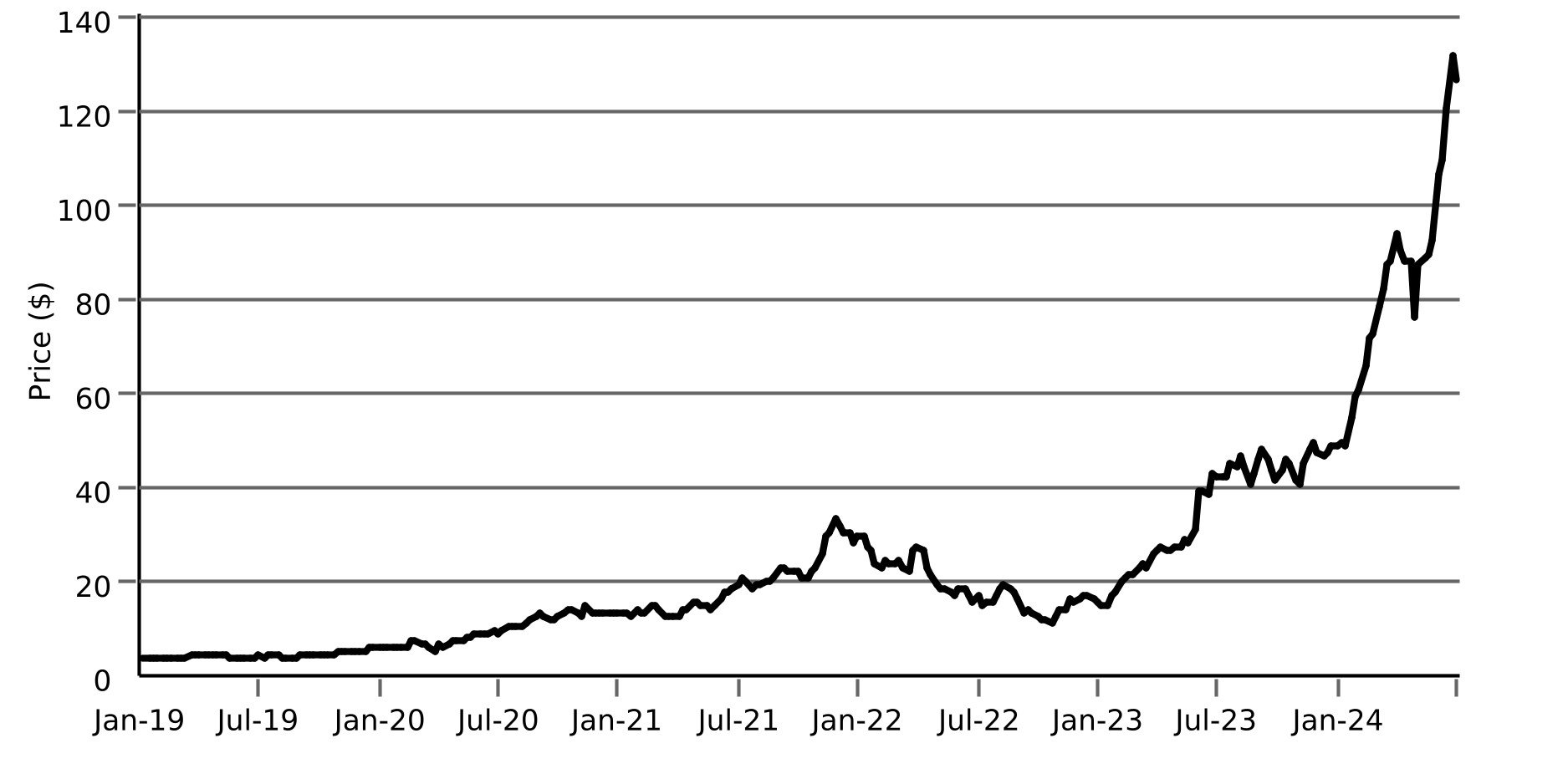 The following graph sets forth the historical performance of the Reference Stock based on the weekly historical closing prices of one share of the Reference Stock from January 4, 2019 through June 21, 2024. The closing price of one share of the Reference Stock on June 26, 2024 was $126.40. We obtained the closing prices above and below from the Bloomberg Professional® service (“Bloomberg”), without independent verification. The closing prices above and below may have been adjusted by Bloomberg for corporate actions, such as stock splits, public offerings, mergers and acquisitions, spin-offs, delistings and bankruptcy.