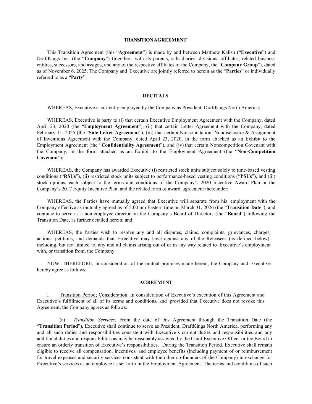 TRANSITION AGREEMENT This Transition Agreement (this “Agreement”) is made by and between Matthew Kalish (“Executive”) and DraftKings Inc. (the “Company”) (together, with its parents, subsidiaries, divisions, affiliates, related business entities, successors, and assigns, and any of the respective affiliates of the Company, the “Company Group”), dated as of November 6, 2025. The Company and Executive are jointly referred to herein as the “Parties” or individually referred to as a “Party”. RECITALS WHEREAS, Executive is currently employed by the Company as President, DraftKings North America; WHEREAS, Executive is party to (i) that certain Executive Employment Agreement with the Company, dated April 23, 2020 (the “Employment Agreement”), (ii) that certain Letter Agreement with the Company, dated February 11, 2025 (the “Side Letter Agreement”), (iii) that certain Nonsolicitation, Nondisclosure & Assignment of Inventions Agreement with the Company, dated April 23, 2020, in the form attached as an Exhibit to the Employment Agreement (the “Confidentiality Agreement”), and (iv) that certain Noncompetition Covenant with the Company, in the form attached as an Exhibit to the Employment Agreement (the “Non-Competition Covenant”); WHEREAS, the Company has awarded Executive (i) restricted stock units subject solely to time-based vesting conditions (“RSUs”), (ii) restricted stock units subject to performance-based vesting conditions (“PSUs”), and (iii) stock options, each subject to the terms and conditions of the Company’s 2020 Incentive Award Plan or the Company’s 2017 Equity Incentive Plan, and the related form of award agreement thereunder; WHEREAS, the Parties have mutually agreed that Executive will separate from his employment with the Company effective as mutually agreed as of 5:00 pm Eastern time on March 31, 2026 (the “Transition Date”), and continue to serve as a non-employee director on the Company’s Board of Directors (the “Board”) following the Transition Date, as further detailed herein; and WHEREAS, the Parties wish to resolve any and all disputes, claims, complaints, grievances, charges, actions, petitions, and demands that Executive may have against any of the Releasees (as defined below), including, but not limited to, any and all claims arising out of or in any way related to Executive’s employment with, or transition from, the Company. NOW, THEREFORE, in consideration of the mutual promises made herein, the Company and Executive hereby agree as follows: AGREEMENT 1. Transition Period; Consideration. In consideration of Executive’s execution of this Agreement and Executive’s fulfillment of all of its terms and conditions, and provided that Executive does not revoke this Agreement, the Company agrees as follows: (a) Transition Services. From the date of this Agreement through the Transition Date (the “Transition Period”), Executive shall continue to serve as President, DraftKings North America, performing any and all such duties and responsibilities consistent with Executive’s current duties and responsibilities and any additional duties and responsibilities as may be reasonably assigned by the Chief Executive Officer or the Board to ensure an orderly transition of Executive’s responsibilities. During the Transition Period, Executive shall remain eligible to receive all compensation, incentives, and employee benefits (including payment of or reimbursement for travel expenses and security services consistent with the other co-founders of the Company) in exchange for Executive’s services as an employee as set forth in the Employment Agreement. The terms and conditions of such
