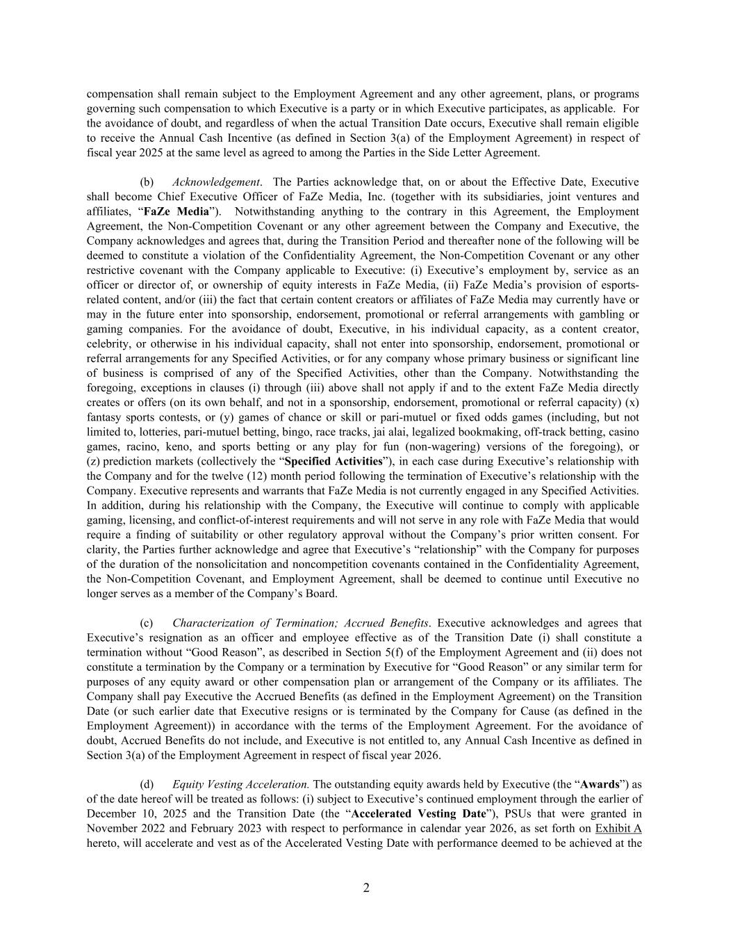 2 compensation shall remain subject to the Employment Agreement and any other agreement, plans, or programs governing such compensation to which Executive is a party or in which Executive participates, as applicable. For the avoidance of doubt, and regardless of when the actual Transition Date occurs, Executive shall remain eligible to receive the Annual Cash Incentive (as defined in Section 3(a) of the Employment Agreement) in respect of fiscal year 2025 at the same level as agreed to among the Parties in the Side Letter Agreement. (b) Acknowledgement. The Parties acknowledge that, on or about the Effective Date, Executive shall become Chief Executive Officer of FaZe Media, Inc. (together with its subsidiaries, joint ventures and affiliates, “FaZe Media”). Notwithstanding anything to the contrary in this Agreement, the Employment Agreement, the Non-Competition Covenant or any other agreement between the Company and Executive, the Company acknowledges and agrees that, during the Transition Period and thereafter none of the following will be deemed to constitute a violation of the Confidentiality Agreement, the Non-Competition Covenant or any other restrictive covenant with the Company applicable to Executive: (i) Executive’s employment by, service as an officer or director of, or ownership of equity interests in FaZe Media, (ii) FaZe Media’s provision of esports- related content, and/or (iii) the fact that certain content creators or affiliates of FaZe Media may currently have or may in the future enter into sponsorship, endorsement, promotional or referral arrangements with gambling or gaming companies. For the avoidance of doubt, Executive, in his individual capacity, as a content creator, celebrity, or otherwise in his individual capacity, shall not enter into sponsorship, endorsement, promotional or referral arrangements for any Specified Activities, or for any company whose primary business or significant line of business is comprised of any of the Specified Activities, other than the Company. Notwithstanding the foregoing, exceptions in clauses (i) through (iii) above shall not apply if and to the extent FaZe Media directly creates or offers (on its own behalf, and not in a sponsorship, endorsement, promotional or referral capacity) (x) fantasy sports contests, or (y) games of chance or skill or pari-mutuel or fixed odds games (including, but not limited to, lotteries, pari-mutuel betting, bingo, race tracks, jai alai, legalized bookmaking, off-track betting, casino games, racino, keno, and sports betting or any play for fun (non-wagering) versions of the foregoing), or (z) prediction markets (collectively the “Specified Activities”), in each case during Executive’s relationship with the Company and for the twelve (12) month period following the termination of Executive’s relationship with the Company. Executive represents and warrants that FaZe Media is not currently engaged in any Specified Activities. In addition, during his relationship with the Company, the Executive will continue to comply with applicable gaming, licensing, and conflict-of-interest requirements and will not serve in any role with FaZe Media that would require a finding of suitability or other regulatory approval without the Company’s prior written consent. For clarity, the Parties further acknowledge and agree that Executive’s “relationship” with the Company for purposes of the duration of the nonsolicitation and noncompetition covenants contained in the Confidentiality Agreement, the Non-Competition Covenant, and Employment Agreement, shall be deemed to continue until Executive no longer serves as a member of the Company’s Board. (c) Characterization of Termination; Accrued Benefits. Executive acknowledges and agrees that Executive’s resignation as an officer and employee effective as of the Transition Date (i) shall constitute a termination without “Good Reason”, as described in Section 5(f) of the Employment Agreement and (ii) does not constitute a termination by the Company or a termination by Executive for “Good Reason” or any similar term for purposes of any equity award or other compensation plan or arrangement of the Company or its affiliates. The Company shall pay Executive the Accrued Benefits (as defined in the Employment Agreement) on the Transition Date (or such earlier date that Executive resigns or is terminated by the Company for Cause (as defined in the Employment Agreement)) in accordance with the terms of the Employment Agreement. For the avoidance of doubt, Accrued Benefits do not include, and Executive is not entitled to, any Annual Cash Incentive as defined in Section 3(a) of the Employment Agreement in respect of fiscal year 2026. (d) Equity Vesting Acceleration. The outstanding equity awards held by Executive (the “Awards”) as of the date hereof will be treated as follows: (i) subject to Executive’s continued employment through the earlier of December 10, 2025 and the Transition Date (the “Accelerated Vesting Date”), PSUs that were granted in November 2022 and February 2023 with respect to performance in calendar year 2026, as set forth on Exhibit A hereto, will accelerate and vest as of the Accelerated Vesting Date with performance deemed to be achieved at the