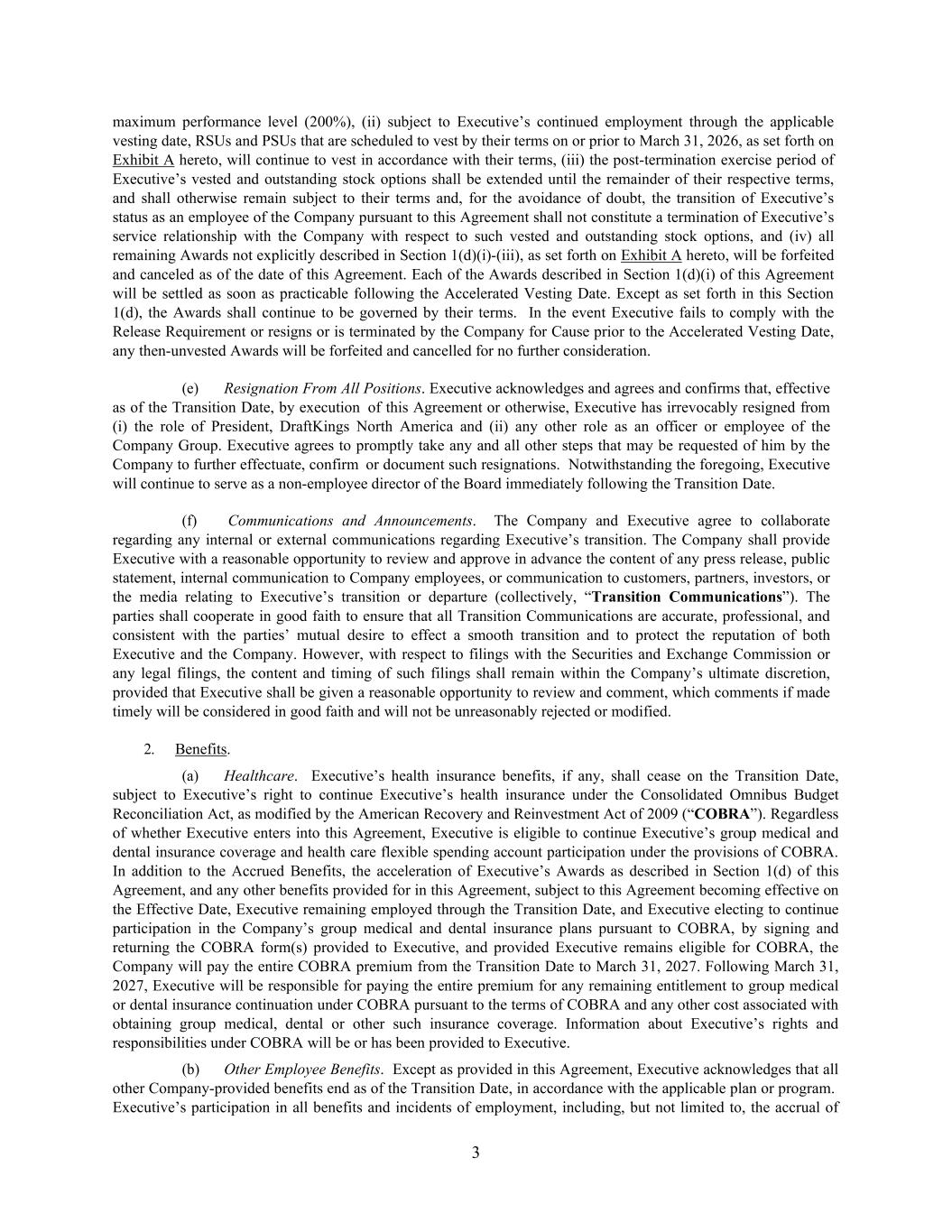 3 maximum performance level (200%), (ii) subject to Executive’s continued employment through the applicable vesting date, RSUs and PSUs that are scheduled to vest by their terms on or prior to March 31, 2026, as set forth on Exhibit A hereto, will continue to vest in accordance with their terms, (iii) the post-termination exercise period of Executive’s vested and outstanding stock options shall be extended until the remainder of their respective terms, and shall otherwise remain subject to their terms and, for the avoidance of doubt, the transition of Executive’s status as an employee of the Company pursuant to this Agreement shall not constitute a termination of Executive’s service relationship with the Company with respect to such vested and outstanding stock options, and (iv) all remaining Awards not explicitly described in Section 1(d)(i)-(iii), as set forth on Exhibit A hereto, will be forfeited and canceled as of the date of this Agreement. Each of the Awards described in Section 1(d)(i) of this Agreement will be settled as soon as practicable following the Accelerated Vesting Date. Except as set forth in this Section 1(d), the Awards shall continue to be governed by their terms. In the event Executive fails to comply with the Release Requirement or resigns or is terminated by the Company for Cause prior to the Accelerated Vesting Date, any then-unvested Awards will be forfeited and cancelled for no further consideration. (e) Resignation From All Positions. Executive acknowledges and agrees and confirms that, effective as of the Transition Date, by execution of this Agreement or otherwise, Executive has irrevocably resigned from (i) the role of President, DraftKings North America and (ii) any other role as an officer or employee of the Company Group. Executive agrees to promptly take any and all other steps that may be requested of him by the Company to further effectuate, confirm or document such resignations. Notwithstanding the foregoing, Executive will continue to serve as a non-employee director of the Board immediately following the Transition Date. (f) Communications and Announcements. The Company and Executive agree to collaborate regarding any internal or external communications regarding Executive’s transition. The Company shall provide Executive with a reasonable opportunity to review and approve in advance the content of any press release, public statement, internal communication to Company employees, or communication to customers, partners, investors, or the media relating to Executive’s transition or departure (collectively, “Transition Communications”). The parties shall cooperate in good faith to ensure that all Transition Communications are accurate, professional, and consistent with the parties’ mutual desire to effect a smooth transition and to protect the reputation of both Executive and the Company. However, with respect to filings with the Securities and Exchange Commission or any legal filings, the content and timing of such filings shall remain within the Company’s ultimate discretion, provided that Executive shall be given a reasonable opportunity to review and comment, which comments if made timely will be considered in good faith and will not be unreasonably rejected or modified. 2. Benefits. (a) Healthcare. Executive’s health insurance benefits, if any, shall cease on the Transition Date, subject to Executive’s right to continue Executive’s health insurance under the Consolidated Omnibus Budget Reconciliation Act, as modified by the American Recovery and Reinvestment Act of 2009 (“COBRA”). Regardless of whether Executive enters into this Agreement, Executive is eligible to continue Executive’s group medical and dental insurance coverage and health care flexible spending account participation under the provisions of COBRA. In addition to the Accrued Benefits, the acceleration of Executive’s Awards as described in Section 1(d) of this Agreement, and any other benefits provided for in this Agreement, subject to this Agreement becoming effective on the Effective Date, Executive remaining employed through the Transition Date, and Executive electing to continue participation in the Company’s group medical and dental insurance plans pursuant to COBRA, by signing and returning the COBRA form(s) provided to Executive, and provided Executive remains eligible for COBRA, the Company will pay the entire COBRA premium from the Transition Date to March 31, 2027. Following March 31, 2027, Executive will be responsible for paying the entire premium for any remaining entitlement to group medical or dental insurance continuation under COBRA pursuant to the terms of COBRA and any other cost associated with obtaining group medical, dental or other such insurance coverage. Information about Executive’s rights and responsibilities under COBRA will be or has been provided to Executive. (b) Other Employee Benefits. Except as provided in this Agreement, Executive acknowledges that all other Company-provided benefits end as of the Transition Date, in accordance with the applicable plan or program. Executive’s participation in all benefits and incidents of employment, including, but not limited to, the accrual of