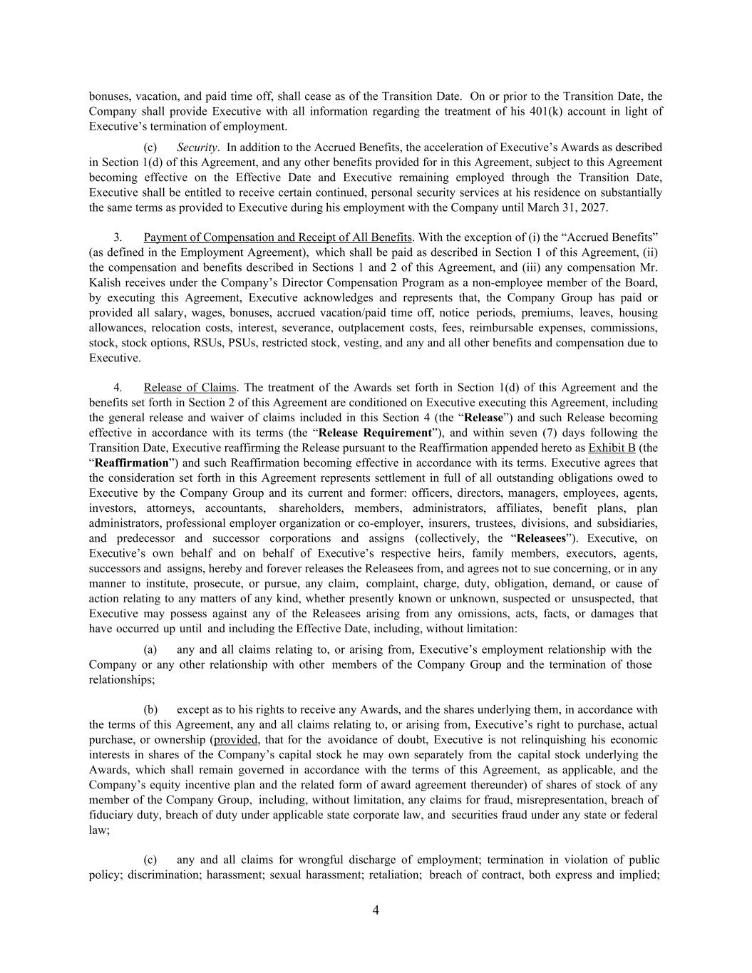 4 bonuses, vacation, and paid time off, shall cease as of the Transition Date. On or prior to the Transition Date, the Company shall provide Executive with all information regarding the treatment of his 401(k) account in light of Executive’s termination of employment. (c) Security. In addition to the Accrued Benefits, the acceleration of Executive’s Awards as described in Section 1(d) of this Agreement, and any other benefits provided for in this Agreement, subject to this Agreement becoming effective on the Effective Date and Executive remaining employed through the Transition Date, Executive shall be entitled to receive certain continued, personal security services at his residence on substantially the same terms as provided to Executive during his employment with the Company until March 31, 2027. 3. Payment of Compensation and Receipt of All Benefits. With the exception of (i) the “Accrued Benefits” (as defined in the Employment Agreement), which shall be paid as described in Section 1 of this Agreement, (ii) the compensation and benefits described in Sections 1 and 2 of this Agreement, and (iii) any compensation Mr. Kalish receives under the Company’s Director Compensation Program as a non-employee member of the Board, by executing this Agreement, Executive acknowledges and represents that, the Company Group has paid or provided all salary, wages, bonuses, accrued vacation/paid time off, notice periods, premiums, leaves, housing allowances, relocation costs, interest, severance, outplacement costs, fees, reimbursable expenses, commissions, stock, stock options, RSUs, PSUs, restricted stock, vesting, and any and all other benefits and compensation due to Executive. 4. Release of Claims. The treatment of the Awards set forth in Section 1(d) of this Agreement and the benefits set forth in Section 2 of this Agreement are conditioned on Executive executing this Agreement, including the general release and waiver of claims included in this Section 4 (the “Release”) and such Release becoming effective in accordance with its terms (the “Release Requirement”), and within seven (7) days following the Transition Date, Executive reaffirming the Release pursuant to the Reaffirmation appended hereto as Exhibit B (the “Reaffirmation”) and such Reaffirmation becoming effective in accordance with its terms. Executive agrees that the consideration set forth in this Agreement represents settlement in full of all outstanding obligations owed to Executive by the Company Group and its current and former: officers, directors, managers, employees, agents, investors, attorneys, accountants, shareholders, members, administrators, affiliates, benefit plans, plan administrators, professional employer organization or co-employer, insurers, trustees, divisions, and subsidiaries, and predecessor and successor corporations and assigns (collectively, the “Releasees”). Executive, on Executive’s own behalf and on behalf of Executive’s respective heirs, family members, executors, agents, successors and assigns, hereby and forever releases the Releasees from, and agrees not to sue concerning, or in any manner to institute, prosecute, or pursue, any claim, complaint, charge, duty, obligation, demand, or cause of action relating to any matters of any kind, whether presently known or unknown, suspected or unsuspected, that Executive may possess against any of the Releasees arising from any omissions, acts, facts, or damages that have occurred up until and including the Effective Date, including, without limitation: (a) any and all claims relating to, or arising from, Executive’s employment relationship with the Company or any other relationship with other members of the Company Group and the termination of those relationships; (b) except as to his rights to receive any Awards, and the shares underlying them, in accordance with the terms of this Agreement, any and all claims relating to, or arising from, Executive’s right to purchase, actual purchase, or ownership (provided, that for the avoidance of doubt, Executive is not relinquishing his economic interests in shares of the Company’s capital stock he may own separately from the capital stock underlying the Awards, which shall remain governed in accordance with the terms of this Agreement, as applicable, and the Company’s equity incentive plan and the related form of award agreement thereunder) of shares of stock of any member of the Company Group, including, without limitation, any claims for fraud, misrepresentation, breach of fiduciary duty, breach of duty under applicable state corporate law, and securities fraud under any state or federal law; (c) any and all claims for wrongful discharge of employment; termination in violation of public policy; discrimination; harassment; sexual harassment; retaliation; breach of contract, both express and implied;