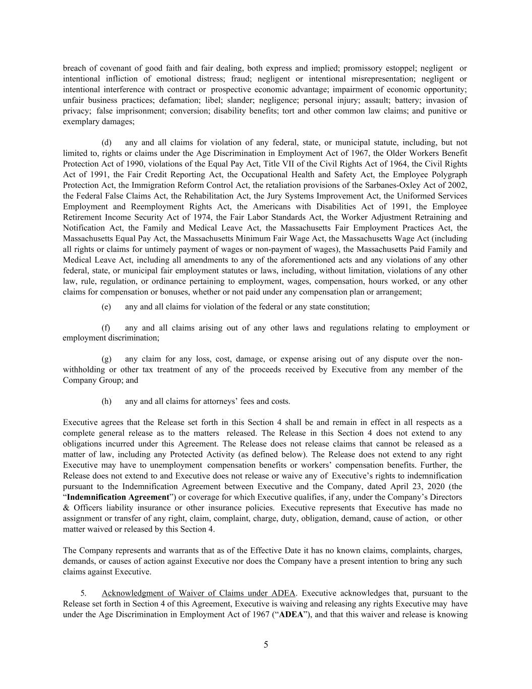 5 breach of covenant of good faith and fair dealing, both express and implied; promissory estoppel; negligent or intentional infliction of emotional distress; fraud; negligent or intentional misrepresentation; negligent or intentional interference with contract or prospective economic advantage; impairment of economic opportunity; unfair business practices; defamation; libel; slander; negligence; personal injury; assault; battery; invasion of privacy; false imprisonment; conversion; disability benefits; tort and other common law claims; and punitive or exemplary damages; (d) any and all claims for violation of any federal, state, or municipal statute, including, but not limited to, rights or claims under the Age Discrimination in Employment Act of 1967, the Older Workers Benefit Protection Act of 1990, violations of the Equal Pay Act, Title VII of the Civil Rights Act of 1964, the Civil Rights Act of 1991, the Fair Credit Reporting Act, the Occupational Health and Safety Act, the Employee Polygraph Protection Act, the Immigration Reform Control Act, the retaliation provisions of the Sarbanes-Oxley Act of 2002, the Federal False Claims Act, the Rehabilitation Act, the Jury Systems Improvement Act, the Uniformed Services Employment and Reemployment Rights Act, the Americans with Disabilities Act of 1991, the Employee Retirement Income Security Act of 1974, the Fair Labor Standards Act, the Worker Adjustment Retraining and Notification Act, the Family and Medical Leave Act, the Massachusetts Fair Employment Practices Act, the Massachusetts Equal Pay Act, the Massachusetts Minimum Fair Wage Act, the Massachusetts Wage Act (including all rights or claims for untimely payment of wages or non-payment of wages), the Massachusetts Paid Family and Medical Leave Act, including all amendments to any of the aforementioned acts and any violations of any other federal, state, or municipal fair employment statutes or laws, including, without limitation, violations of any other law, rule, regulation, or ordinance pertaining to employment, wages, compensation, hours worked, or any other claims for compensation or bonuses, whether or not paid under any compensation plan or arrangement; (e) any and all claims for violation of the federal or any state constitution; (f) any and all claims arising out of any other laws and regulations relating to employment or employment discrimination; (g) any claim for any loss, cost, damage, or expense arising out of any dispute over the non- withholding or other tax treatment of any of the proceeds received by Executive from any member of the Company Group; and (h) any and all claims for attorneys’ fees and costs. Executive agrees that the Release set forth in this Section 4 shall be and remain in effect in all respects as a complete general release as to the matters released. The Release in this Section 4 does not extend to any obligations incurred under this Agreement. The Release does not release claims that cannot be released as a matter of law, including any Protected Activity (as defined below). The Release does not extend to any right Executive may have to unemployment compensation benefits or workers’ compensation benefits. Further, the Release does not extend to and Executive does not release or waive any of Executive’s rights to indemnification pursuant to the Indemnification Agreement between Executive and the Company, dated April 23, 2020 (the “Indemnification Agreement”) or coverage for which Executive qualifies, if any, under the Company’s Directors & Officers liability insurance or other insurance policies. Executive represents that Executive has made no assignment or transfer of any right, claim, complaint, charge, duty, obligation, demand, cause of action, or other matter waived or released by this Section 4. The Company represents and warrants that as of the Effective Date it has no known claims, complaints, charges, demands, or causes of action against Executive nor does the Company have a present intention to bring any such claims against Executive. 5. Acknowledgment of Waiver of Claims under ADEA. Executive acknowledges that, pursuant to the Release set forth in Section 4 of this Agreement, Executive is waiving and releasing any rights Executive may have under the Age Discrimination in Employment Act of 1967 (“ADEA”), and that this waiver and release is knowing