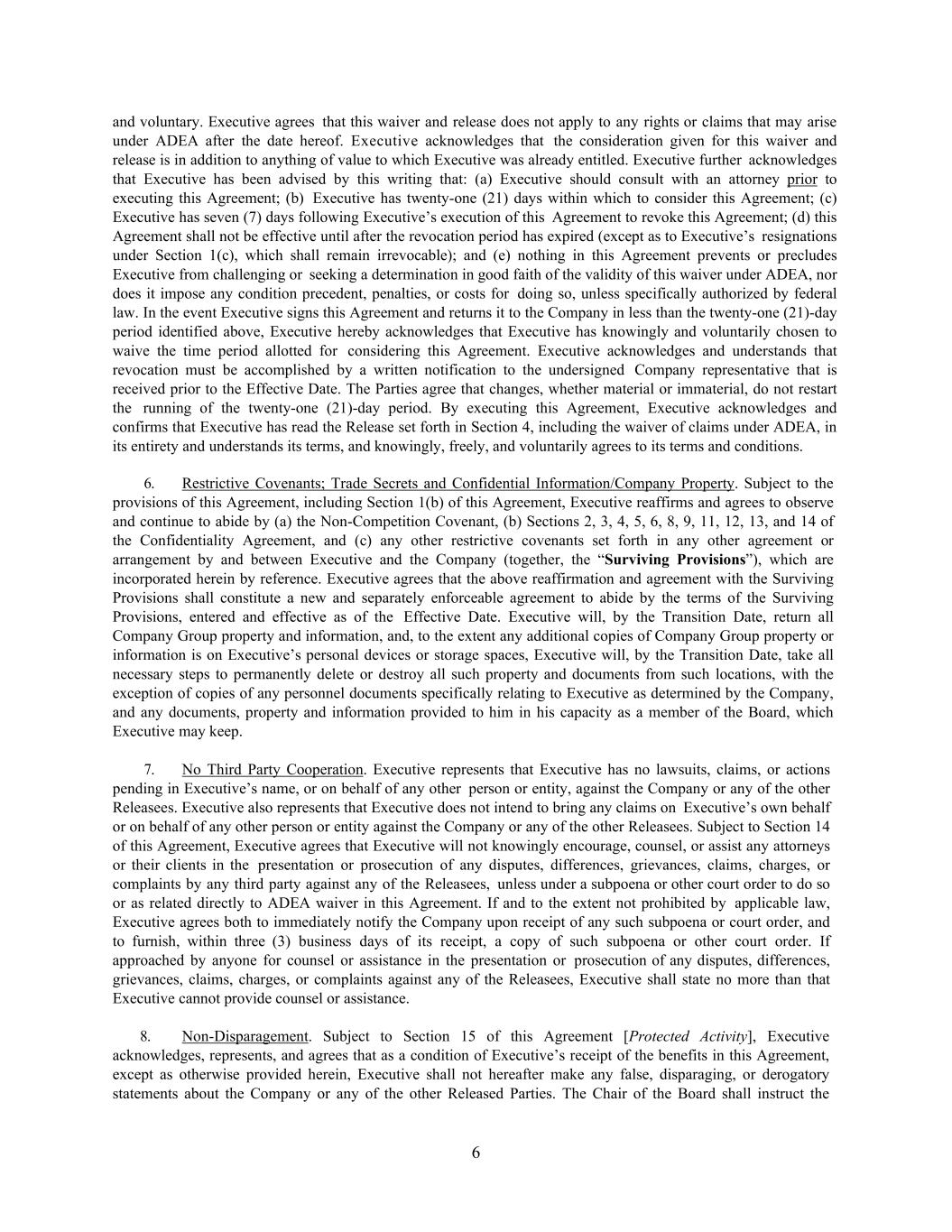 6 and voluntary. Executive agrees that this waiver and release does not apply to any rights or claims that may arise under ADEA after the date hereof. Executive acknowledges that the consideration given for this waiver and release is in addition to anything of value to which Executive was already entitled. Executive further acknowledges that Executive has been advised by this writing that: (a) Executive should consult with an attorney prior to executing this Agreement; (b) Executive has twenty-one (21) days within which to consider this Agreement; (c) Executive has seven (7) days following Executive’s execution of this Agreement to revoke this Agreement; (d) this Agreement shall not be effective until after the revocation period has expired (except as to Executive’s resignations under Section 1(c), which shall remain irrevocable); and (e) nothing in this Agreement prevents or precludes Executive from challenging or seeking a determination in good faith of the validity of this waiver under ADEA, nor does it impose any condition precedent, penalties, or costs for doing so, unless specifically authorized by federal law. In the event Executive signs this Agreement and returns it to the Company in less than the twenty-one (21)-day period identified above, Executive hereby acknowledges that Executive has knowingly and voluntarily chosen to waive the time period allotted for considering this Agreement. Executive acknowledges and understands that revocation must be accomplished by a written notification to the undersigned Company representative that is received prior to the Effective Date. The Parties agree that changes, whether material or immaterial, do not restart the running of the twenty-one (21)-day period. By executing this Agreement, Executive acknowledges and confirms that Executive has read the Release set forth in Section 4, including the waiver of claims under ADEA, in its entirety and understands its terms, and knowingly, freely, and voluntarily agrees to its terms and conditions. 6. Restrictive Covenants; Trade Secrets and Confidential Information/Company Property. Subject to the provisions of this Agreement, including Section 1(b) of this Agreement, Executive reaffirms and agrees to observe and continue to abide by (a) the Non-Competition Covenant, (b) Sections 2, 3, 4, 5, 6, 8, 9, 11, 12, 13, and 14 of the Confidentiality Agreement, and (c) any other restrictive covenants set forth in any other agreement or arrangement by and between Executive and the Company (together, the “Surviving Provisions”), which are incorporated herein by reference. Executive agrees that the above reaffirmation and agreement with the Surviving Provisions shall constitute a new and separately enforceable agreement to abide by the terms of the Surviving Provisions, entered and effective as of the Effective Date. Executive will, by the Transition Date, return all Company Group property and information, and, to the extent any additional copies of Company Group property or information is on Executive’s personal devices or storage spaces, Executive will, by the Transition Date, take all necessary steps to permanently delete or destroy all such property and documents from such locations, with the exception of copies of any personnel documents specifically relating to Executive as determined by the Company, and any documents, property and information provided to him in his capacity as a member of the Board, which Executive may keep. 7. No Third Party Cooperation. Executive represents that Executive has no lawsuits, claims, or actions pending in Executive’s name, or on behalf of any other person or entity, against the Company or any of the other Releasees. Executive also represents that Executive does not intend to bring any claims on Executive’s own behalf or on behalf of any other person or entity against the Company or any of the other Releasees. Subject to Section 14 of this Agreement, Executive agrees that Executive will not knowingly encourage, counsel, or assist any attorneys or their clients in the presentation or prosecution of any disputes, differences, grievances, claims, charges, or complaints by any third party against any of the Releasees, unless under a subpoena or other court order to do so or as related directly to ADEA waiver in this Agreement. If and to the extent not prohibited by applicable law, Executive agrees both to immediately notify the Company upon receipt of any such subpoena or court order, and to furnish, within three (3) business days of its receipt, a copy of such subpoena or other court order. If approached by anyone for counsel or assistance in the presentation or prosecution of any disputes, differences, grievances, claims, charges, or complaints against any of the Releasees, Executive shall state no more than that Executive cannot provide counsel or assistance. 8. Non-Disparagement. Subject to Section 15 of this Agreement [Protected Activity], Executive acknowledges, represents, and agrees that as a condition of Executive’s receipt of the benefits in this Agreement, except as otherwise provided herein, Executive shall not hereafter make any false, disparaging, or derogatory statements about the Company or any of the other Released Parties. The Chair of the Board shall instruct the