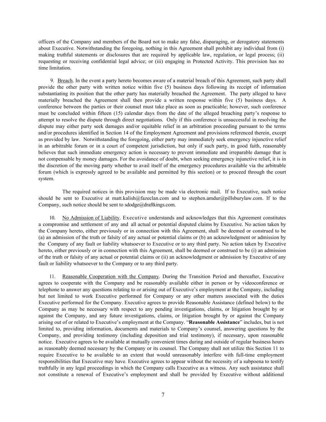 7 officers of the Company and members of the Board not to make any false, disparaging, or derogatory statements about Executive. Notwithstanding the foregoing, nothing in this Agreement shall prohibit any individual from (i) making truthful statements or disclosures that are required by applicable law, regulation, or legal process; (ii) requesting or receiving confidential legal advice; or (iii) engaging in Protected Activity. This provision has no time limitation. 9. Breach. In the event a party hereto becomes aware of a material breach of this Agreement, such party shall provide the other party with written notice within five (5) business days following its receipt of information substantiating its position that the other party has materially breached the Agreement. The party alleged to have materially breached the Agreement shall then provide a written response within five (5) business days. A conference between the parties or their counsel must take place as soon as practicable; however, such conference must be concluded within fifteen (15) calendar days from the date of the alleged breaching party’s response to attempt to resolve the dispute through direct negotiations. Only if this conference is unsuccessful in resolving the dispute may either party seek damages and/or equitable relief in an arbitration proceeding pursuant to the terms and/or procedures identified in Section 14 of the Employment Agreement and provisions referenced therein, except as provided by law. Notwithstanding the foregoing, either party may immediately seek emergency injunctive relief in an arbitrable forum or in a court of competent jurisdiction, but only if such party, in good faith, reasonably believes that such immediate emergency action is necessary to prevent immediate and irreparable damage that is not compensable by money damages. For the avoidance of doubt, when seeking emergency injunctive relief, it is in the discretion of the moving party whether to avail itself of the emergency procedures available via the arbitrable forum (which is expressly agreed to be available and permitted by this section) or to proceed through the court system. The required notices in this provision may be made via electronic mail. If to Executive, such notice should be sent to Executive at matt.kalish@fazeclan.com and to stephen.amdur@pillsburylaw.com. If to the Company, such notice should be sent to sdodge@draftkings.com. 10. No Admission of Liability. Executive understands and acknowledges that this Agreement constitutes a compromise and settlement of any and all actual or potential disputed claims by Executive. No action taken by the Company hereto, either previously or in connection with this Agreement, shall be deemed or construed to be (a) an admission of the truth or falsity of any actual or potential claims or (b) an acknowledgment or admission by the Company of any fault or liability whatsoever to Executive or to any third party. No action taken by Executive hereto, either previously or in connection with this Agreement, shall be deemed or construed to be (i) an admission of the truth or falsity of any actual or potential claims or (ii) an acknowledgment or admission by Executive of any fault or liability whatsoever to the Company or to any third party. 11. Reasonable Cooperation with the Company. During the Transition Period and thereafter, Executive agrees to cooperate with the Company and be reasonably available either in person or by videoconference or telephone to answer any questions relating to or arising out of Executive’s employment at the Company, including but not limited to work Executive performed for Company or any other matters associated with the duties Executive performed for the Company. Executive agrees to provide Reasonable Assistance (defined below) to the Company as may be necessary with respect to any pending investigations, claims, or litigation brought by or against the Company, and any future investigations, claims, or litigation brought by or against the Company arising out of or related to Executive’s employment at the Company. “Reasonable Assistance” includes, but is not limited to, providing information, documents and materials to Company’s counsel, answering questions by the Company, and providing testimony (including deposition and trial testimony), if necessary, upon reasonable notice. Executive agrees to be available at mutually convenient times during and outside of regular business hours as reasonably deemed necessary by the Company or its counsel. The Company shall not utilize this Section 11 to require Executive to be available to an extent that would unreasonably interfere with full-time employment responsibilities that Executive may have. Executive agrees to appear without the necessity of a subpoena to testify truthfully in any legal proceedings in which the Company calls Executive as a witness. Any such assistance shall not constitute a renewal of Executive’s employment and shall be provided by Executive without additional