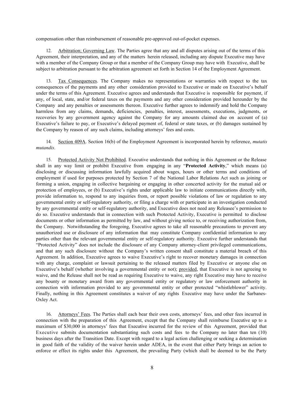 8 compensation other than reimbursement of reasonable pre-approved out-of-pocket expenses. 12. Arbitration; Governing Law. The Parties agree that any and all disputes arising out of the terms of this Agreement, their interpretation, and any of the matters herein released, including any dispute Executive may have with a member of the Company Group or that a member of the Company Group may have with Executive, shall be subject to arbitration pursuant to the arbitration agreement set forth in Section 14 of the Employment Agreement. 13. Tax Consequences. The Company makes no representations or warranties with respect to the tax consequences of the payments and any other consideration provided to Executive or made on Executive’s behalf under the terms of this Agreement. Executive agrees and understands that Executive is responsible for payment, if any, of local, state, and/or federal taxes on the payments and any other consideration provided hereunder by the Company and any penalties or assessments thereon. Executive further agrees to indemnify and hold the Company harmless from any claims, demands, deficiencies, penalties, interest, assessments, executions, judgments, or recoveries by any government agency against the Company for any amounts claimed due on account of (a) Executive’s failure to pay, or Executive’s delayed payment of, federal or state taxes, or (b) damages sustained by the Company by reason of any such claims, including attorneys’ fees and costs. 14. Section 409A. Section 16(b) of the Employment Agreement is incorporated herein by reference, mutatis mutandis. 15. Protected Activity Not Prohibited. Executive understands that nothing in this Agreement or the Release shall in any way limit or prohibit Executive from engaging in any “Protected Activity,” which means (a) disclosing or discussing information lawfully acquired about wages, hours or other terms and conditions of employment if used for purposes protected by Section 7 of the National Labor Relations Act such as joining or forming a union, engaging in collective bargaining or engaging in other concerted activity for the mutual aid or protection of employees, or (b) Executive’s rights under applicable law to initiate communications directly with, provide information to, respond to any inquiries from, or report possible violations of law or regulation to any governmental entity or self-regulatory authority, or filing a charge with or participate in an investigation conducted by any governmental entity or self-regulatory authority, and Executive does not need any Releasee’s permission to do so. Executive understands that in connection with such Protected Activity, Executive is permitted to disclose documents or other information as permitted by law, and without giving notice to, or receiving authorization from, the Company. Notwithstanding the foregoing, Executive agrees to take all reasonable precautions to prevent any unauthorized use or disclosure of any information that may constitute Company confidential information to any parties other than the relevant governmental entity or self-regulatory authority. Executive further understands that “Protected Activity” does not include the disclosure of any Company attorney-client privileged communications, and that any such disclosure without the Company’s written consent shall constitute a material breach of this Agreement. In addition, Executive agrees to waive Executive’s right to recover monetary damages in connection with any charge, complaint or lawsuit pertaining to the released matters filed by Executive or anyone else on Executive’s behalf (whether involving a governmental entity or not); provided, that Executive is not agreeing to waive, and the Release shall not be read as requiring Executive to waive, any right Executive may have to receive any bounty or monetary award from any governmental entity or regulatory or law enforcement authority in connection with information provided to any governmental entity or other protected “whistleblower” activity. Finally, nothing in this Agreement constitutes a waiver of any rights Executive may have under the Sarbanes- Oxley Act. 16. Attorneys’ Fees. The Parties shall each bear their own costs, attorneys’ fees, and other fees incurred in connection with the preparation of this Agreement, except that the Company shall reimburse Executive up to a maximum of $30,000 in attorneys’ fees that Executive incurred for the review of this Agreement, provided that Executive submits documentation substantiating such costs and fees to the Company no later than ten (10) business days after the Transition Date. Except with regard to a legal action challenging or seeking a determination in good faith of the validity of the waiver herein under ADEA, in the event that either Party brings an action to enforce or effect its rights under this Agreement, the prevailing Party (which shall be deemed to be the Party