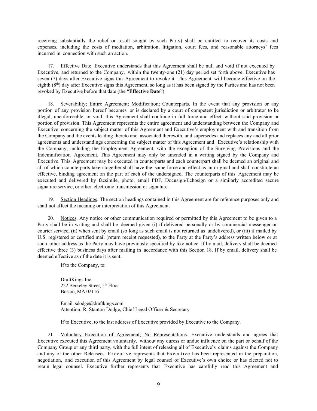 9 receiving substantially the relief or result sought by such Party) shall be entitled to recover its costs and expenses, including the costs of mediation, arbitration, litigation, court fees, and reasonable attorneys’ fees incurred in connection with such an action. 17. Effective Date. Executive understands that this Agreement shall be null and void if not executed by Executive, and returned to the Company, within the twenty-one (21) day period set forth above. Executive has seven (7) days after Executive signs this Agreement to revoke it. This Agreement will become effective on the eighth (8th) day after Executive signs this Agreement, so long as it has been signed by the Parties and has not been revoked by Executive before that date (the “Effective Date”). 18. Severability; Entire Agreement; Modification; Counterparts. In the event that any provision or any portion of any provision hereof becomes or is declared by a court of competent jurisdiction or arbitrator to be illegal, unenforceable, or void, this Agreement shall continue in full force and effect without said provision or portion of provision. This Agreement represents the entire agreement and understanding between the Company and Executive concerning the subject matter of this Agreement and Executive’s employment with and transition from the Company and the events leading thereto and associated therewith, and supersedes and replaces any and all prior agreements and understandings concerning the subject matter of this Agreement and Executive’s relationship with the Company, including the Employment Agreement, with the exception of the Surviving Provisions and the Indemnification Agreement. This Agreement may only be amended in a writing signed by the Company and Executive. This Agreement may be executed in counterparts and each counterpart shall be deemed an original and all of which counterparts taken together shall have the same force and effect as an original and shall constitute an effective, binding agreement on the part of each of the undersigned. The counterparts of this Agreement may be executed and delivered by facsimile, photo, email PDF, Docusign/Echosign or a similarly accredited secure signature service, or other electronic transmission or signature. 19. Section Headings. The section headings contained in this Agreement are for reference purposes only and shall not affect the meaning or interpretation of this Agreement. 20. Notices. Any notice or other communication required or permitted by this Agreement to be given to a Party shall be in writing and shall be deemed given (i) if delivered personally or by commercial messenger or courier service, (ii) when sent by email (so long as such email is not returned as undelivered), or (iii) if mailed by U.S. registered or certified mail (return receipt requested), to the Party at the Party’s address written below or at such other address as the Party may have previously specified by like notice. If by mail, delivery shall be deemed effective three (3) business days after mailing in accordance with this Section 18. If by email, delivery shall be deemed effective as of the date it is sent. If to the Company, to: DraftKings Inc. 222 Berkeley Street, 5th Floor Boston, MA 02116 Email: sdodge@draftkings.com Attention: R. Stanton Dodge, Chief Legal Officer & Secretary If to Executive, to the last address of Executive provided by Executive to the Company. 21. Voluntary Execution of Agreement; No Representations. Executive understands and agrees that Executive executed this Agreement voluntarily, without any duress or undue influence on the part or behalf of the Company Group or any third party, with the full intent of releasing all of Executive’s claims against the Company and any of the other Releasees. Executive represents that Executive has been represented in the preparation, negotiation, and execution of this Agreement by legal counsel of Executive’s own choice or has elected not to retain legal counsel. Executive further represents that Executive has carefully read this Agreement and