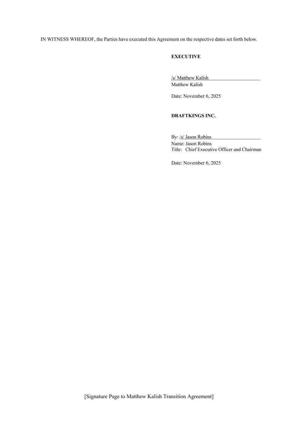 [Signature Page to Matthew Kalish Transition Agreement] IN WITNESS WHEREOF, the Parties have executed this Agreement on the respective dates set forth below. EXECUTIVE /s/ Matthew Kalish Matthew Kalish Date: November 6, 2025 DRAFTKINGS INC. By: /s/ Jason Robins Name: Jason Robins Title: Chief Executive Officer and Chairman Date: November 6, 2025