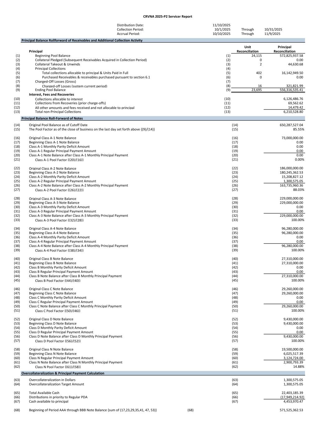 CRVNA 2025-P2 Servicer Report Distribution Date: 11/10/2025 Collection Period: 10/1/2025 Through 10/31/2025 Accrual Period: 10/10/2025 Through 11/9/2025 Principal Balance Rollforward of Receivables and Additional Collection Activity Unit Principal Principal Reconciliation Reconciliation (1) Beginning Pool Balance (1) 24,115 572,825,937.58 (2) Collateral Pledged (Subsequent Receivables Acquired in Collection Period) (2) 0 0.00 (3) Collateral Takeout & Unwinds (3) 2 44,630.68 (4) Principal Collections (4) (5) Total collections allocable to principal & Units Paid in Full (5) 402 16,142,949.50 (6) Purchased Receivables & receivables purchased pursuant to section 6.1 (6) 0 0.00 (7) Charged-Off Losses (Gross) (7) (8) Charged-off Losses (system current period) (8) 16 321,821.99 (9) Ending Pool Balance (9) 23,695 556,316,535.41 Interest, Fees and Recoveries (10) Collections allocable to interest (10) 6,126,486.76 (11) Collections from Recoveries (prior charge-offs) (11) 69,562.62 (12) All other amounts and fees received and not allocable to principal (12) 14,479.42 (13) Total non-Principal Collections (13) 6,210,528.80 Principal Balance Roll-Forward of Notes (14) Original Pool Balance as of Cutoff Date (14) 650,287,527.04 (15) The Pool Factor as of the close of business on the last day set forth above {(9)/(14)} (15) 85.55% (16) Original Class A-1 Note Balance (16) 73,000,000.00 (17) Beginning Class A-1 Note Balance (17) 0.00 (18) Class A-1 Monthly Parity Deficit Amount (18) 0.00 (19) Class A-1 Regular Principal Payment Amount (19) 0.00 (20) Class A-1 Note Balance after Class A-1 Monthly Principal Payment (20) 0.00 (21) Class A-1 Pool Factor {(20)/(16)} (21) 0.00% (22) Original Class A-2 Note Balance (22) 186,000,000.00 (23) Beginning Class A-2 Note Balance (23) 180,245,362.53 (24) Class A-2 Monthly Parity Deficit Amount (24) 15,208,827.12 (25) Class A-2 Regular Principal Payment Amount (25) 1,300,575.05 (26) Class A-2 Note Balance after Class A-2 Monthly Principal Payment (26) 163,735,960.36 (27) Class A-2 Pool Factor {(26)/(22)} (27) 88.03% (28) Original Class A-3 Note Balance (28) 229,000,000.00 (29) Beginning Class A-3 Note Balance (29) 229,000,000.00 (30) Class A-3 Monthly Parity Deficit Amount (30) 0.00 (31) Class A-3 Regular Principal Payment Amount (31) 0.00 (32) Class A-3 Note Balance after Class A-3 Monthly Principal Payment (32) 229,000,000.00 (33) Class A-3 Pool Factor {(32)/(28)} (33) 100.00% (34) Original Class A-4 Note Balance (34) 96,280,000.00 (35) Beginning Class A-4 Note Balance (35) 96,280,000.00 (36) Class A-4 Monthly Parity Deficit Amount (36) 0.00 (37) Class A-4 Regular Principal Payment Amount (37) 0.00 (38) Class A-4 Note Balance after Class A-4 Monthly Principal Payment (38) 96,280,000.00 (39) Class A-4 Pool Factor {(38)/(34)} (39) 100.00% (40) Original Class B Note Balance (40) 27,310,000.00 (41) Beginning Class B Note Balance (41) 27,310,000.00 (42) Class B Monthly Parity Deficit Amount (42) 0.00 (43) Class B Regular Principal Payment Amount (43) 0.00 (44) Class B Note Balance after Class B Monthly Principal Payment (44) 27,310,000.00 (45) Class B Pool Factor {(44)/(40)} (45) 100.00% (46) Original Class C Note Balance (46) 29,260,000.00 (47) Beginning Class C Note Balance (47) 29,260,000.00 (48) Class C Monthly Parity Deficit Amount (48) 0.00 (49) Class C Regular Principal Payment Amount (49) 0.00 (50) Class C Note Balance after Class C Monthly Principal Payment (50) 29,260,000.00 (51) Class C Pool Factor {(50)/(46)} (51) 100.00% (52) Original Class D Note Balance (52) 9,430,000.00 (53) Beginning Class D Note Balance (53) 9,430,000.00 (54) Class D Monthly Parity Deficit Amount (54) 0.00 (55) Class D Regular Principal Payment Amount (55) 0.00 (56) Class D Note Balance after Class D Monthly Principal Payment (56) 9,430,000.00 (57) Class D Pool Factor {(56)/(52)} (57) 100.00% (58) Original Class N Note Balance (58) 19,500,000.00 (59) Beginning Class N Note Balance (59) 6,025,517.39 (60) Class N Regular Principal Payment Amount (60) 3,124,724.00 (61) Class N Note Balance after Class N Monthly Principal Payment (61) 2,900,793.39 (62) Class N Pool Factor {(61)/(58)} (62) 14.88% Overcollateralization & Principal Payment Calculation (63) Overcollateralization in Dollars (63) 1,300,575.05 (64) Overcollateralization Target Amount (64) 1,300,575.05 (65) Total Available Cash (65) 22,403,185.39 (66) Distributions in priority to Regular PDA (66) (17,949,214.92) (67) Cash available to principal (67) 4,453,970.47 (68) Beginning of Period AAA through BBB Note Balance {sum of (17,23,29,35,41, 47, 53)} (68) 571,525,362.53