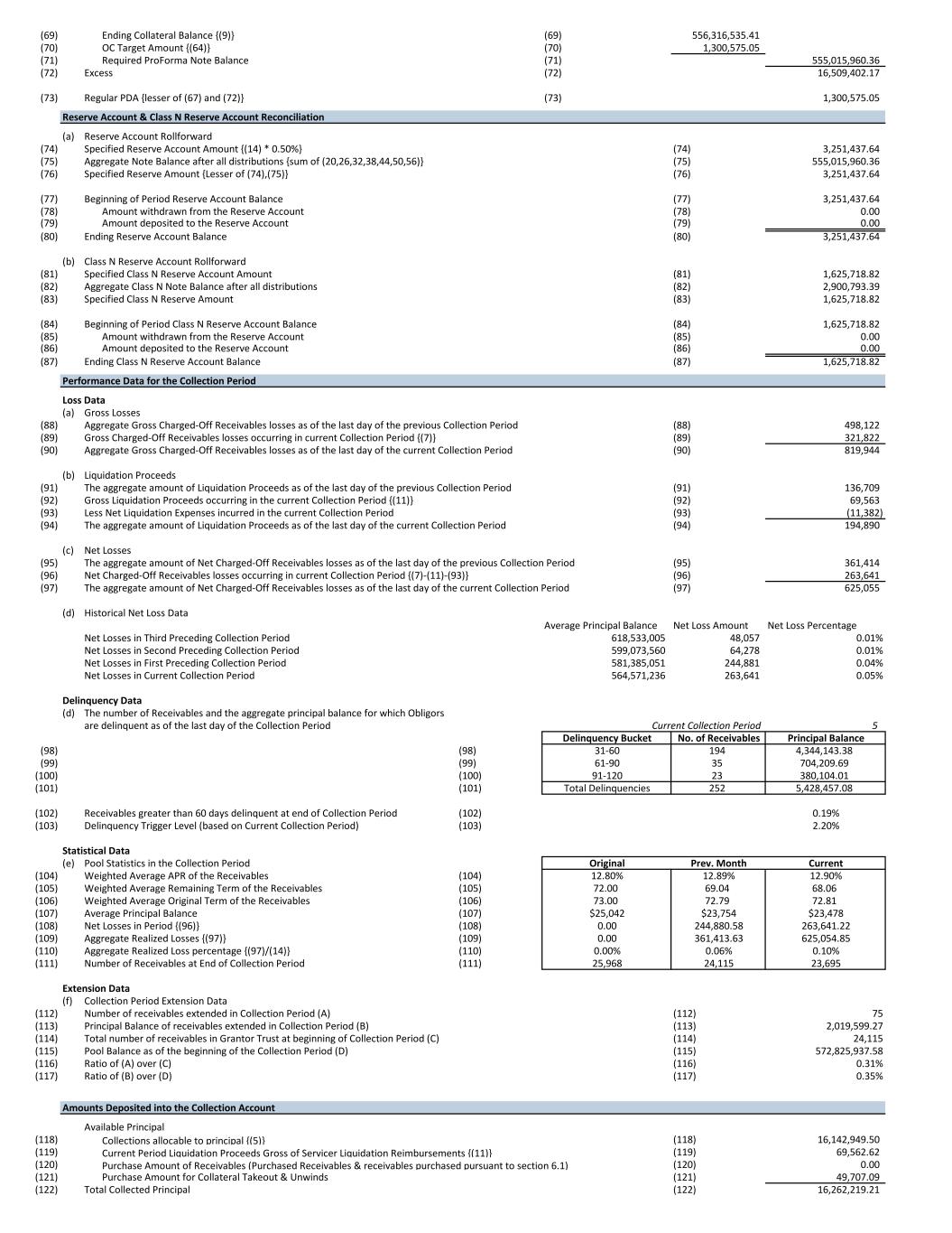(69) Ending Collateral Balance {(9)} (69) 556,316,535.41 (70) OC Target Amount {(64)} (70) 1,300,575.05 (71) Required ProForma Note Balance (71) 555,015,960.36 (72) Excess (72) 16,509,402.17 (73) Regular PDA {lesser of (67) and (72)} (73) 1,300,575.05 Reserve Account & Class N Reserve Account Reconciliation (a) Reserve Account Rollforward (74) Specified Reserve Account Amount {(14) * 0.50%} (74) 3,251,437.64 (75) Aggregate Note Balance after all distributions {sum of (20,26,32,38,44,50,56)} (75) 555,015,960.36 (76) Specified Reserve Amount {Lesser of (74),(75)} (76) 3,251,437.64 (77) Beginning of Period Reserve Account Balance (77) 3,251,437.64 (78) Amount withdrawn from the Reserve Account (78) 0.00 (79) Amount deposited to the Reserve Account (79) 0.00 (80) Ending Reserve Account Balance (80) 3,251,437.64 (b) Class N Reserve Account Rollforward (81) Specified Class N Reserve Account Amount (81) 1,625,718.82 (82) Aggregate Class N Note Balance after all distributions (82) 2,900,793.39 (83) Specified Class N Reserve Amount (83) 1,625,718.82 (84) Beginning of Period Class N Reserve Account Balance (84) 1,625,718.82 (85) Amount withdrawn from the Reserve Account (85) 0.00 (86) Amount deposited to the Reserve Account (86) 0.00 (87) Ending Class N Reserve Account Balance (87) 1,625,718.82 Performance Data for the Collection Period Loss Data (a) Gross Losses (88) Aggregate Gross Charged-Off Receivables losses as of the last day of the previous Collection Period (88) 498,122 (89) Gross Charged-Off Receivables losses occurring in current Collection Period {(7)} (89) 321,822 (90) Aggregate Gross Charged-Off Receivables losses as of the last day of the current Collection Period (90) 819,944 (b) Liquidation Proceeds (91) The aggregate amount of Liquidation Proceeds as of the last day of the previous Collection Period (91) 136,709 (92) Gross Liquidation Proceeds occurring in the current Collection Period {(11)} (92) 69,563 (93) Less Net Liquidation Expenses incurred in the current Collection Period (93) (11,382) (94) The aggregate amount of Liquidation Proceeds as of the last day of the current Collection Period (94) 194,890 (c) Net Losses (95) The aggregate amount of Net Charged-Off Receivables losses as of the last day of the previous Collection Period (95) 361,414 (96) Net Charged-Off Receivables losses occurring in current Collection Period {(7)-(11)-(93)} (96) 263,641 (97) The aggregate amount of Net Charged-Off Receivables losses as of the last day of the current Collection Period (97) 625,055 (d) Historical Net Loss Data Average Principal Balance Net Loss Amount Net Loss Percentage Net Losses in Third Preceding Collection Period 618,533,005 48,057 0.01% Net Losses in Second Preceding Collection Period 599,073,560 64,278 0.01% Net Losses in First Preceding Collection Period 581,385,051 244,881 0.04% Net Losses in Current Collection Period 564,571,236 263,641 0.05% Delinquency Data (d) The number of Receivables and the aggregate principal balance for which Obligors are delinquent as of the last day of the Collection Period Current Collection Period 5 Delinquency Bucket No. of Receivables Principal Balance (98) (98) 31-60 194 4,344,143.38 (99) (99) 61-90 35 704,209.69 (100) (100) 91-120 23 380,104.01 (101) (101) Total Delinquencies 252 5,428,457.08 (102) Receivables greater than 60 days delinquent at end of Collection Period (102) 0.19% (103) Delinquency Trigger Level (based on Current Collection Period) (103) 2.20% Statistical Data (e) Pool Statistics in the Collection Period Original Prev. Month Current (104) Weighted Average APR of the Receivables (104) 12.80% 12.89% 12.90% (105) Weighted Average Remaining Term of the Receivables (105) 72.00 69.04 68.06 (106) Weighted Average Original Term of the Receivables (106) 73.00 72.79 72.81 (107) Average Principal Balance (107) $25,042 $23,754 $23,478 (108) Net Losses in Period {(96)} (108) 0.00 244,880.58 263,641.22 (109) Aggregate Realized Losses {(97)} (109) 0.00 361,413.63 625,054.85 (110) Aggregate Realized Loss percentage {(97)/(14)} (110) 0.00% 0.06% 0.10% (111) Number of Receivables at End of Collection Period (111) 25,968 24,115 23,695 Extension Data (f) Collection Period Extension Data (112) Number of receivables extended in Collection Period (A) (112) 75 (113) Principal Balance of receivables extended in Collection Period (B) (113) 2,019,599.27 (114) Total number of receivables in Grantor Trust at beginning of Collection Period (C) (114) 24,115 (115) Pool Balance as of the beginning of the Collection Period (D) (115) 572,825,937.58 (116) Ratio of (A) over (C) (116) 0.31% (117) Ratio of (B) over (D) (117) 0.35% Amounts Deposited into the Collection Account Available Principal (118) Collections allocable to principal {(5)} (118) 16,142,949.50 (119) Current Period Liquidation Proceeds Gross of Servicer Liquidation Reimbursements {(11)} (119) 69,562.62 (120) Purchase Amount of Receivables (Purchased Receivables & receivables purchased pursuant to section 6.1) (120) 0.00 (121) Purchase Amount for Collateral Takeout & Unwinds (121) 49,707.09 (122) Total Collected Principal (122) 16,262,219.21