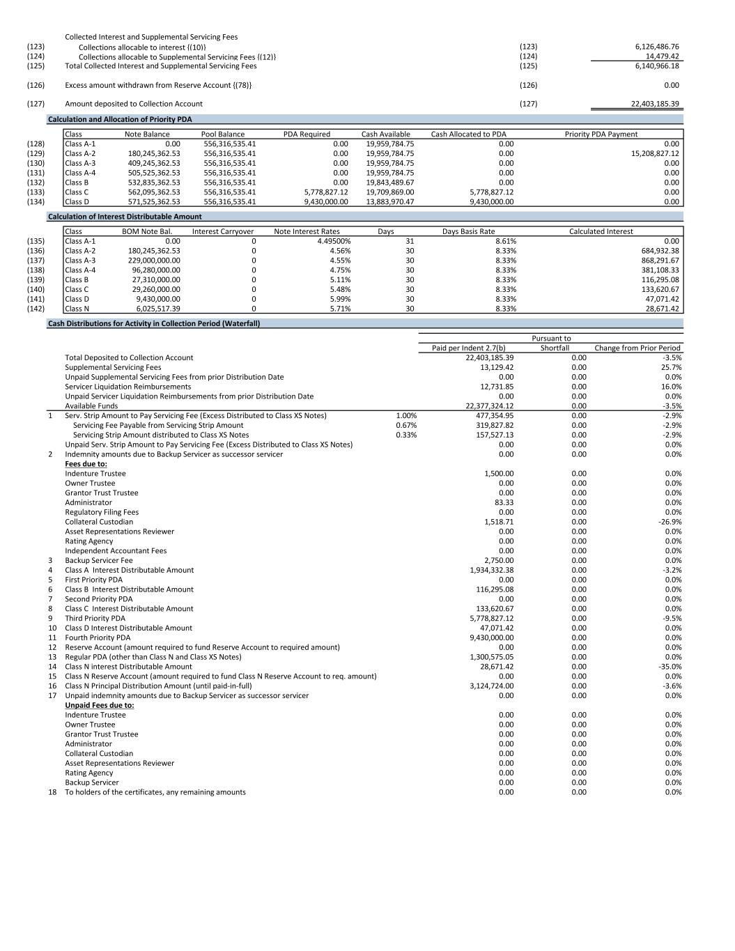 Collected Interest and Supplemental Servicing Fees (123) Collections allocable to interest {(10)} (123) 6,126,486.76 (124) Collections allocable to Supplemental Servicing Fees {(12)} (124) 14,479.42 (125) Total Collected Interest and Supplemental Servicing Fees (125) 6,140,966.18 (126) Excess amount withdrawn from Reserve Account {(78)} (126) 0.00 (127) Amount deposited to Collection Account (127) 22,403,185.39 Calculation and Allocation of Priority PDA Class Note Balance Pool Balance PDA Required Cash Available Cash Allocated to PDA Priority PDA Payment (128) Class A-1 0.00 556,316,535.41 0.00 19,959,784.75 0.00 0.00 (129) Class A-2 180,245,362.53 556,316,535.41 0.00 19,959,784.75 0.00 15,208,827.12 (130) Class A-3 409,245,362.53 556,316,535.41 0.00 19,959,784.75 0.00 0.00 (131) Class A-4 505,525,362.53 556,316,535.41 0.00 19,959,784.75 0.00 0.00 (132) Class B 532,835,362.53 556,316,535.41 0.00 19,843,489.67 0.00 0.00 (133) Class C 562,095,362.53 556,316,535.41 5,778,827.12 19,709,869.00 5,778,827.12 0.00 (134) Class D 571,525,362.53 556,316,535.41 9,430,000.00 13,883,970.47 9,430,000.00 0.00 Calculation of Interest Distributable Amount Class BOM Note Bal. Interest Carryover Note Interest Rates Days Days Basis Rate Calculated Interest (135) Class A-1 0.00 0 4.49500% 31 8.61% 0.00 (136) Class A-2 180,245,362.53 0 4.56% 30 8.33% 684,932.38 (137) Class A-3 229,000,000.00 0 4.55% 30 8.33% 868,291.67 (138) Class A-4 96,280,000.00 0 4.75% 30 8.33% 381,108.33 (139) Class B 27,310,000.00 0 5.11% 30 8.33% 116,295.08 (140) Class C 29,260,000.00 0 5.48% 30 8.33% 133,620.67 (141) Class D 9,430,000.00 0 5.99% 30 8.33% 47,071.42 (142) Class N 6,025,517.39 0 5.71% 30 8.33% 28,671.42 Cash Distributions for Activity in Collection Period (Waterfall) Pursuant to Paid per Indent 2.7(b) Shortfall Change from Prior Period Total Deposited to Collection Account 22,403,185.39 0.00 -3.5% Supplemental Servicing Fees 13,129.42 0.00 25.7% Unpaid Supplemental Servicing Fees from prior Distribution Date 0.00 0.00 0.0% Servicer Liquidation Reimbursements 12,731.85 0.00 16.0% Unpaid Servicer Liquidation Reimbursements from prior Distribution Date 0.00 0.00 0.0% Available Funds 22,377,324.12 0.00 -3.5% 1 Serv. Strip Amount to Pay Servicing Fee (Excess Distributed to Class XS Notes) 1.00% 477,354.95 0.00 -2.9% Servicing Fee Payable from Servicing Strip Amount 0.67% 319,827.82 0.00 -2.9% Servicing Strip Amount distributed to Class XS Notes 0.33% 157,527.13 0.00 -2.9% Unpaid Serv. Strip Amount to Pay Servicing Fee (Excess Distributed to Class XS Notes) 0.00 0.00 0.0% 2 Indemnity amounts due to Backup Servicer as successor servicer 0.00 0.00 0.0% Fees due to: Indenture Trustee 1,500.00 0.00 0.0% Owner Trustee 0.00 0.00 0.0% Grantor Trust Trustee 0.00 0.00 0.0% Administrator 83.33 0.00 0.0% Regulatory Filing Fees 0.00 0.00 0.0% Collateral Custodian 1,518.71 0.00 -26.9% Asset Representations Reviewer 0.00 0.00 0.0% Rating Agency 0.00 0.00 0.0% Independent Accountant Fees 0.00 0.00 0.0% 3 Backup Servicer Fee 2,750.00 0.00 0.0% 4 Class A Interest Distributable Amount 1,934,332.38 0.00 -3.2% 5 First Priority PDA 0.00 0.00 0.0% 6 Class B Interest Distributable Amount 116,295.08 0.00 0.0% 7 Second Priority PDA 0.00 0.00 0.0% 8 Class C Interest Distributable Amount 133,620.67 0.00 0.0% 9 Third Priority PDA 5,778,827.12 0.00 -9.5% 10 Class D Interest Distributable Amount 47,071.42 0.00 0.0% 11 Fourth Priority PDA 9,430,000.00 0.00 0.0% 12 Reserve Account (amount required to fund Reserve Account to required amount) 0.00 0.00 0.0% 13 Regular PDA (other than Class N and Class XS Notes) 1,300,575.05 0.00 0.0% 14 Class N interest Distributable Amount 28,671.42 0.00 -35.0% 15 Class N Reserve Account (amount required to fund Class N Reserve Account to req. amount) 0.00 0.00 0.0% 16 Class N Principal Distribution Amount (until paid-in-full) 3,124,724.00 0.00 -3.6% 17 Unpaid indemnity amounts due to Backup Servicer as successor servicer 0.00 0.00 0.0% Unpaid Fees due to: Indenture Trustee 0.00 0.00 0.0% Owner Trustee 0.00 0.00 0.0% Grantor Trust Trustee 0.00 0.00 0.0% Administrator 0.00 0.00 0.0% Collateral Custodian 0.00 0.00 0.0% Asset Representations Reviewer 0.00 0.00 0.0% Rating Agency 0.00 0.00 0.0% Backup Servicer 0.00 0.00 0.0% 18 To holders of the certificates, any remaining amounts 0.00 0.00 0.0%