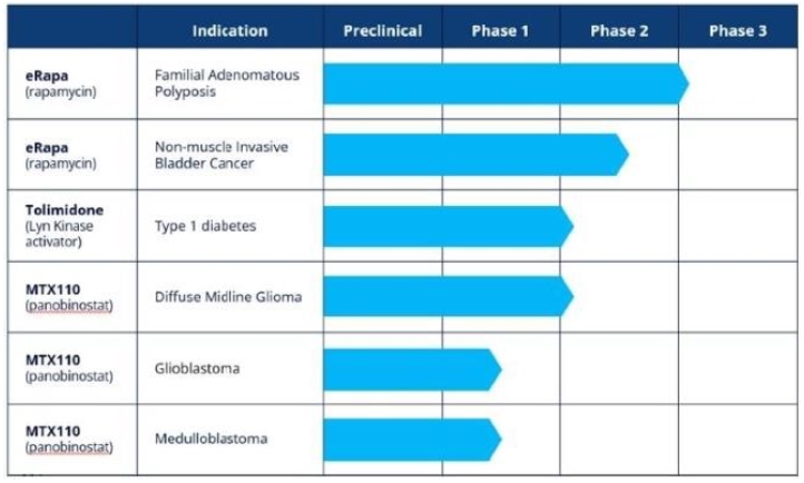 MTX110, which is being studied in aggressive rare/orphan brain cancer indications including recurrent glioblastoma, diffuse midline glioma, or DMG, and medulloblastoma, is a liquid formulation of the histone deacetylase, panobinostat. Our proprietary formulation enables delivery of the product via convection-enhanced delivery at potentially chemotherapeutic doses directly to the site of the tumor, by-passing the blood-brain barrier and avoiding systemic toxicity. We completed recruitment of the first cohort of patients in an ongoing Phase 1 study of MTX110 in recurrent glioblastoma. We have also completed and announced the results of two Phase 1 studies in DMG. Due to resource constraints, MTX110 has been de-prioritized.