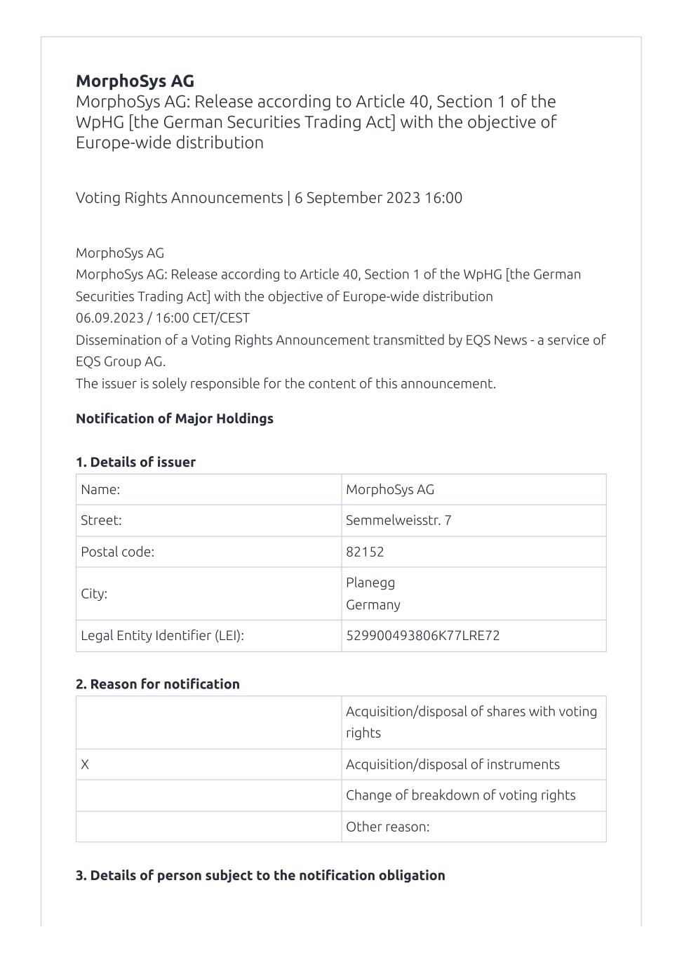 Voting Rights Announcements | 6 September 2023 16:01 MorphoSys AG MorphoSys AG: Release according to Article 40, Section 1 of the WpHG [the German Securities Trading Act] with the objective of Europe-wide distribution 06.09.2023 / 16:01 CET/CEST Dissemination of a Voting Rights Announcement transmitted by EQS News - a service of EQS Group AG. The issuer is solely responsible for the content of this announcement. Notification of Major Holdings 1. Details of issuer 2. Reason for notification 3. Details of person subject to the notification obligation MorphoSys AG MorphoSys AG: Release according to Article 40, Section 1 of the WpHG [the German Securities Trading Act] with the objective of Europe-wide distribution Name: MorphoSys AG Street: Semmelweisstr. 7 Postal code: 82152 City: Planegg Germany Legal Entity Identifier (LEI): 529900493806K77LRE72 Acquisition/disposal of shares with voting rights X Acquisition/disposal of instruments Change of breakdown of voting rights Other reason: