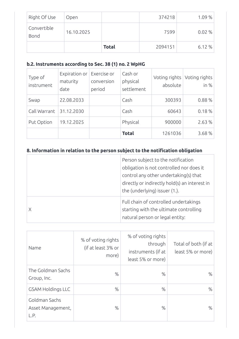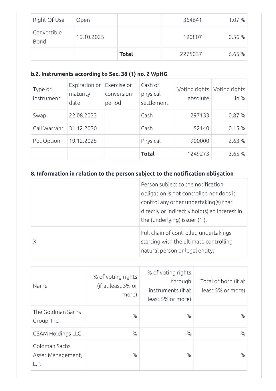 b.2. Instruments according to Sec. 38 (1) no. 2 WpHG 8. Information in relation to the person subject to the notification obligation Right Of Use Open 374218 1.09 % Convertible Bond 16.10.2025 7599 0.02 % Total 2094151 6.12 % Type of instrument Expiration or maturity date Exercise or conversion period Cash or physical settlement Voting rights absolute Voting rights in % Swap 22.08.2033 Cash 300393 0.88 % Call Warrant 31.12.2030 Cash 60643 0.18 % Put Option 19.12.2025 Physical 900000 2.63 % Total 1261036 3.68 % Person subject to the notification obligation is not controlled nor does it control any other undertaking(s) that directly or indirectly hold(s) an interest in the (underlying) issuer (1.). X Full chain of controlled undertakings starting with the ultimate controlling natural person or legal entity: Name % of voting rights (if at least 3% or more) % of voting rights through instruments (if at least 5% or more) Total of both (if at least 5% or more) The Goldman Sachs Group, Inc. % % % GSAM Holdings LLC % % % Goldman Sachs Asset Management, L.P. % % %