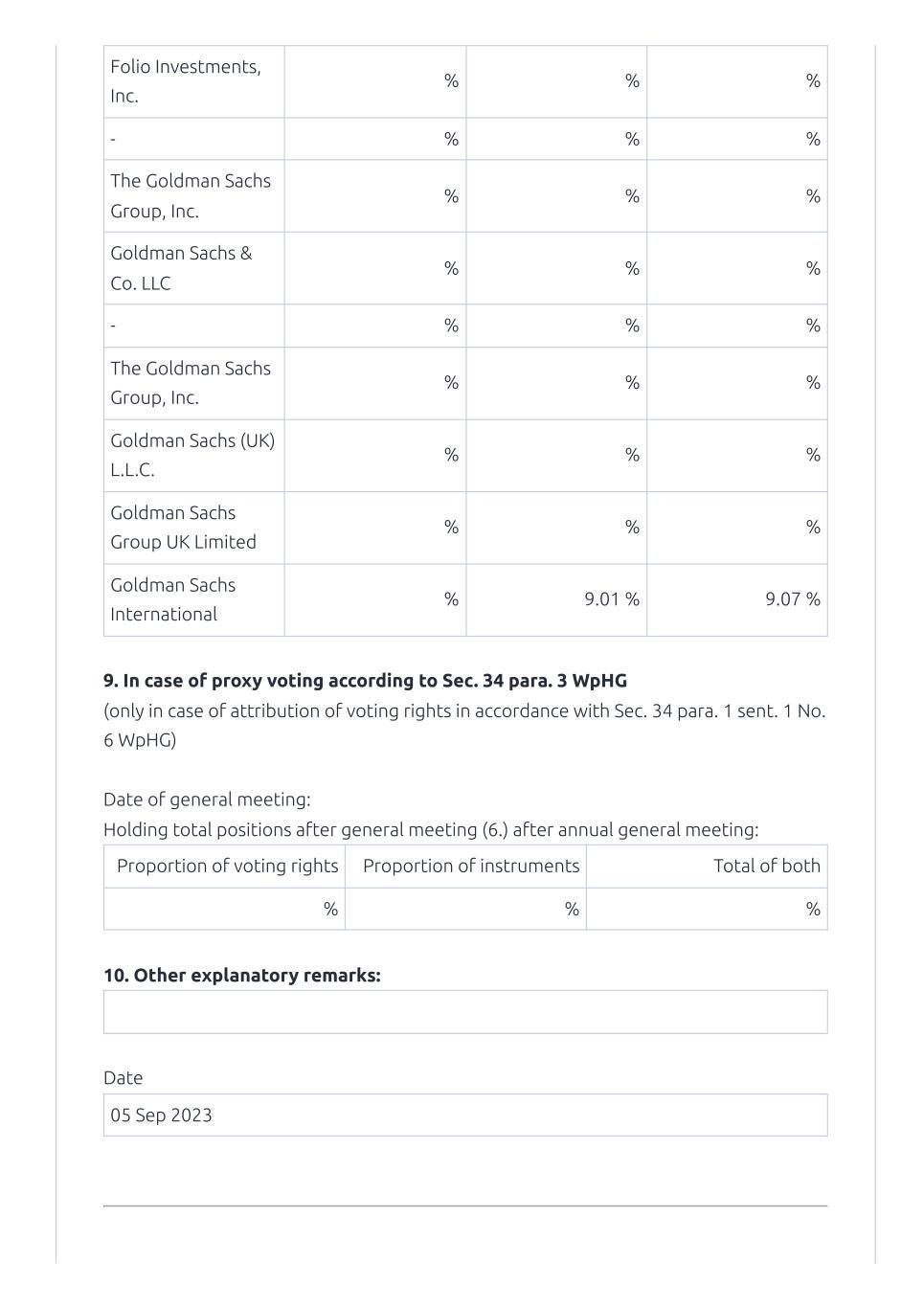 9. In case of proxy voting according to Sec. 34 para. 3 WpHG (only in case of attribution of voting rights in accordance with Sec. 34 para. 1 sent. 1 No. 6 WpHG) Date of general meeting: Holding total positions after general meeting (6.) after annual general meeting: 10. Other explanatory remarks: Date Folio Investments, Inc. % % % - % % % The Goldman Sachs Group, Inc. % % % Goldman Sachs & Co. LLC % % % - % % % The Goldman Sachs Group, Inc. % % % Goldman Sachs (UK) L.L.C. % % % Goldman Sachs Group UK Limited % % % Goldman Sachs International % 9.01 % 9.07 % Proportion of voting rights Proportion of instruments Total of both % % % 05 Sep 2023