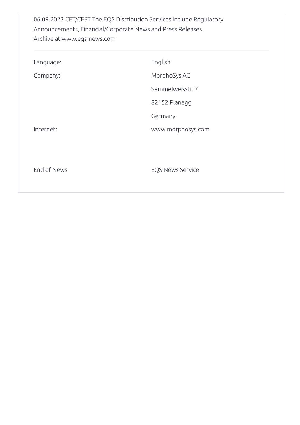 06.09.2023 CET/CEST The EQS Distribution Services include Regulatory Announcements, Financial/Corporate News and Press Releases. Archive at www.eqs-news.com Language: English Company: MorphoSys AG Semmelweisstr. 7 82152 Planegg Germany Internet: www.morphosys.com End of News EQS News Service