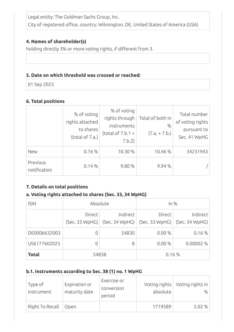4. Names of shareholder(s) holding directly 3% or more voting rights, if different from 3. 5. Date on which threshold was crossed or reached: 6. Total positions 7. Details on total positions a. Voting rights attached to shares (Sec. 33, 34 WpHG) b.1. Instruments according to Sec. 38 (1) no. 1 WpHG Legal entity: The Goldman Sachs Group, Inc. City of registered office, country: Wilmington, DE, United States of America (USA) 31 Aug 2023 % of voting rights attached to shares (total of 7.a.) % of voting rights through instruments (total of 7.b.1 + 7.b.2) Total of both in % (7.a. + 7.b.) Total number of voting rights pursuant to Sec. 41 WpHG New 0.14 % 9.80 % 9.94 % 34231943 Previous notification 0.12 % 10.32 % 10.43 % / ISIN Absolute In % Direct (Sec. 33 WpHG) Indirect (Sec. 34 WpHG) Direct (Sec. 33 WpHG) Indirect (Sec. 34 WpHG) DE0006632003 0 47200 0.00 % 0.14 % US6177602025 0 8 0.00 % 0.00002 % Total 47208 0.14 % Type of instrument Expiration or maturity date Exercise or conversion period Voting rights absolute Voting rights in % Right To Recall Open 1712334 5.002 %