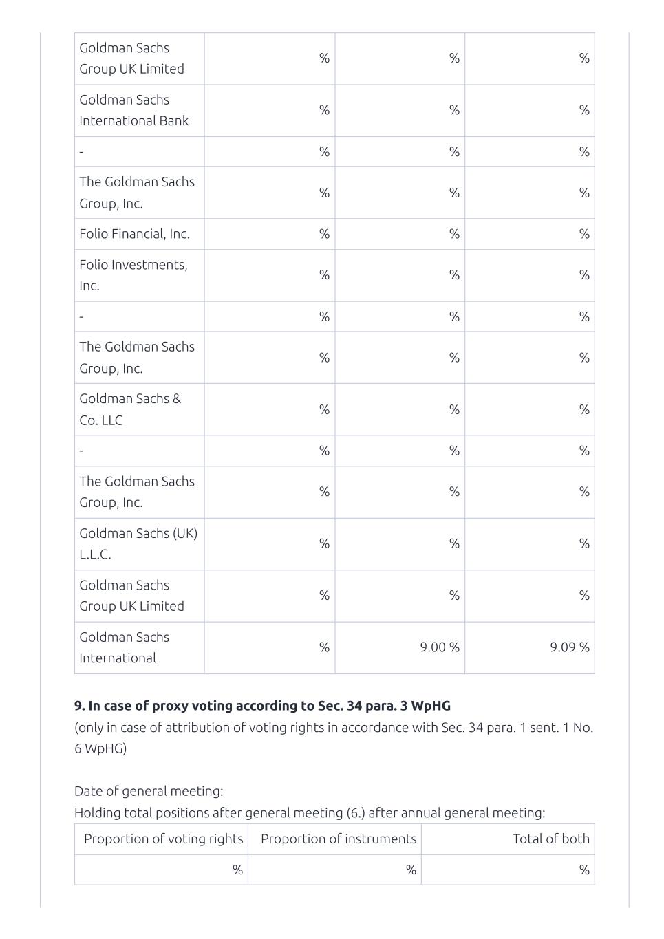9. In case of proxy voting according to Sec. 34 para. 3 WpHG (only in case of attribution of voting rights in accordance with Sec. 34 para. 1 sent. 1 No. 6 WpHG) Date of general meeting: Holding total positions after general meeting (6.) after annual general meeting: Goldman Sachs Group UK Limited % % % Goldman Sachs International Bank % % % - % % % The Goldman Sachs Group, Inc. % % % Folio Financial, Inc. % % % Folio Investments, Inc. % % % - % % % The Goldman Sachs Group, Inc. % % % Goldman Sachs & Co. LLC % % % - % % % The Goldman Sachs Group, Inc. % % % Goldman Sachs (UK) L.L.C. % % % Goldman Sachs Group UK Limited % % % Goldman Sachs International % 9.00 % 9.09 % Proportion of voting rights Proportion of instruments Total of both % % %