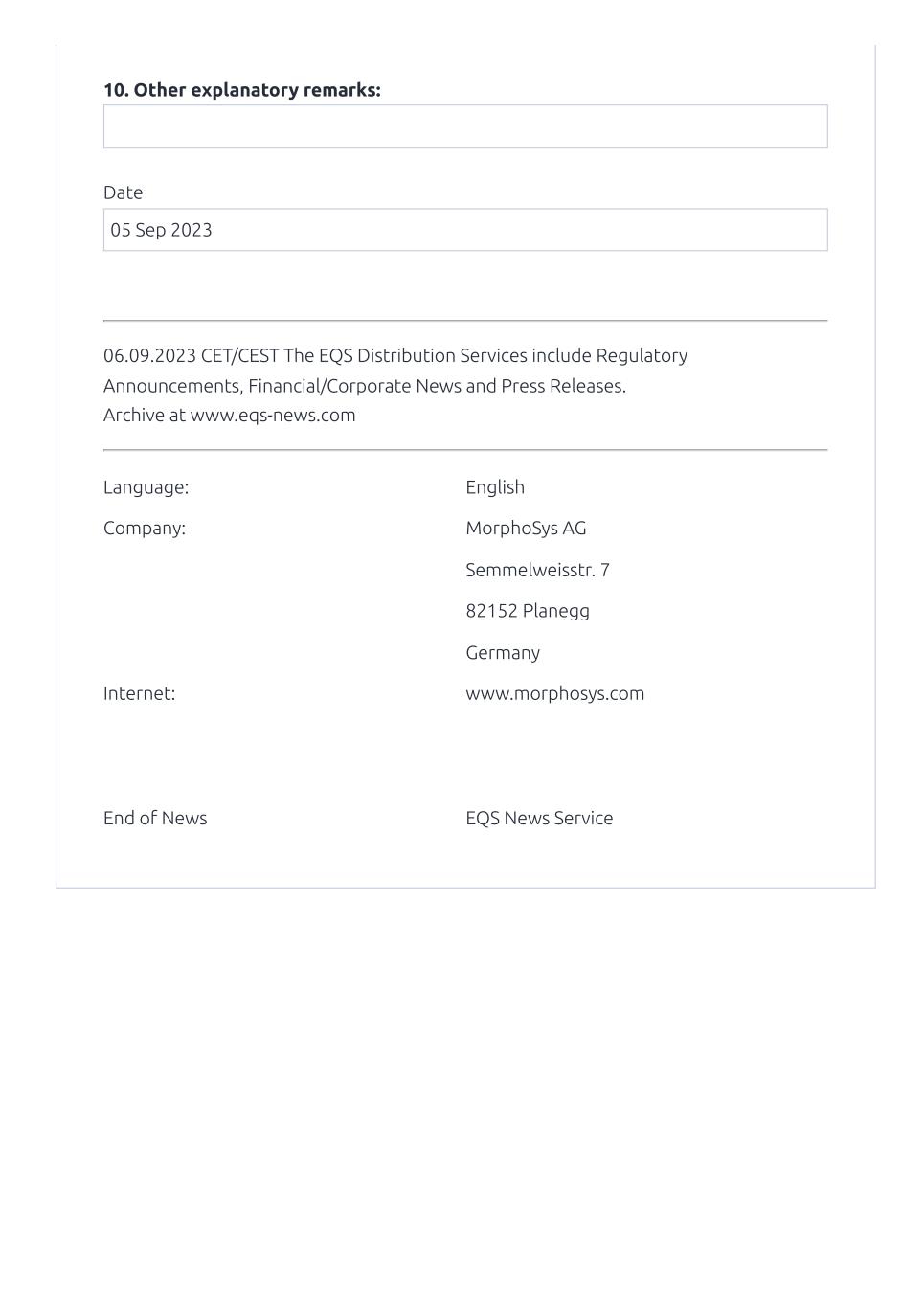 10. Other explanatory remarks: Date 06.09.2023 CET/CEST The EQS Distribution Services include Regulatory Announcements, Financial/Corporate News and Press Releases. Archive at www.eqs-news.com Language: English Company: MorphoSys AG Semmelweisstr. 7 82152 Planegg Germany Internet: www.morphosys.com End of News EQS News Service 05 Sep 2023