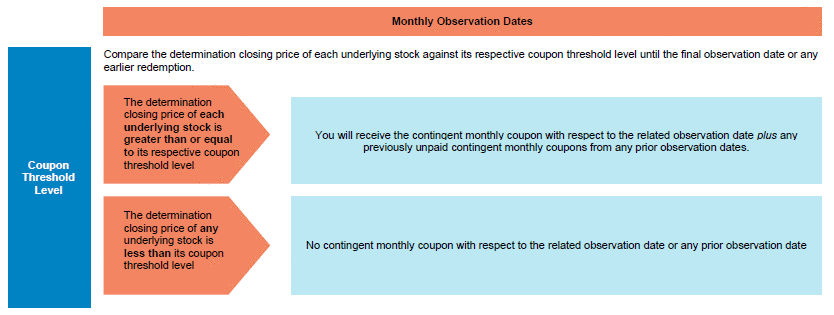 A contingent monthly coupon at an annual rate of at least 9.60% (corresponding to approximately $8.00 per month per security, to be determined on the pricing date) plus any previously unpaid contingent monthly coupons from any prior observation dates will be paid on the securities on each coupon payment date but only if the determination closing price of each underlying stock is at or above its respective coupon threshold level on the related observation date; provided, however, in the case of any such payment of a previously unpaid contingent monthly coupon, no additional interest will accrue or be payable in respect of such unpaid contingent monthly coupon from and after the end of the original interest period for such unpaid contingent monthly coupon. You will not receive such unpaid contingent monthly coupons if the determination closing price of any underlying stock is less than its respective coupon threshold level on each subsequent observation date. If, on any observation date, the determination closing price of any underlying stock is less than its respective coupon threshold level, no contingent monthly coupon will be paid with respect to that observation date. It is possible that one or more underlying stocks will remain below their respective coupon threshold levels for extended periods of time or even throughout the entire 1.5-year term of the securities so that you will receive few or no contingent monthly coupons. |
