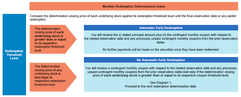 The securities are not subject to early redemption until three months after the original issue date. Following this 3-month non-call period, if, on any redemption determination date, beginning on August 14, 2023, the determination closing price of each underlying stock is greater than or equal to its respective redemption threshold level, the securities will be automatically redeemed for an early redemption payment on the related early redemption date. No further payments will be made on the securities once they have been redeemed. The securities will not be redeemed early on any early redemption date if the determination closing price of any underlying stock is below its respective redemption threshold level on the related redemption determination date. |
