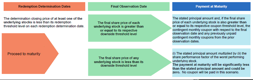 If the securities are not redeemed prior to maturity, investors will receive a payment at maturity determined as follows: ●If the final share price of each underlying stock is greater than or equal to its respective downside threshold level: the stated principal amount and, if the final share price of each underlying stock is also greater than or equal to its respective coupon threshold level, the contingent monthly coupon with respect to the final observation date and any previously unpaid contingent monthly coupons from the prior observation dates ●If the final share price of any underlying stock is less than its respective downside threshold level: (i) the stated principal amount multiplied by (ii) the share performance factor of the worst performing underlying stock Under these circumstances, the payment at maturity will be significantly less than the stated principal amount of $1,000, and will represent a loss of more than 50%, and possibly all, of your investment. |
