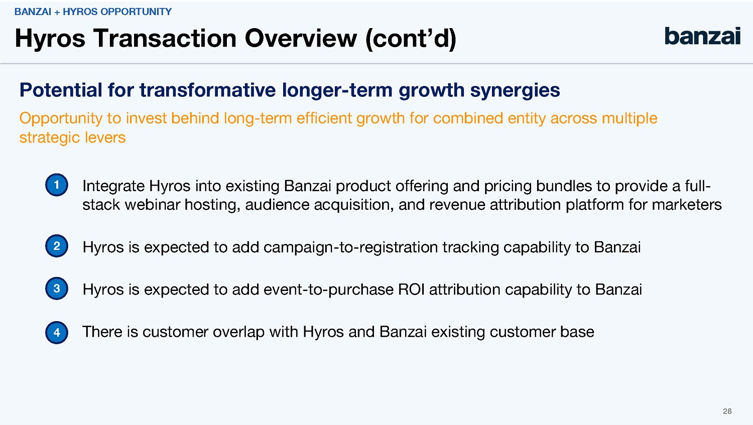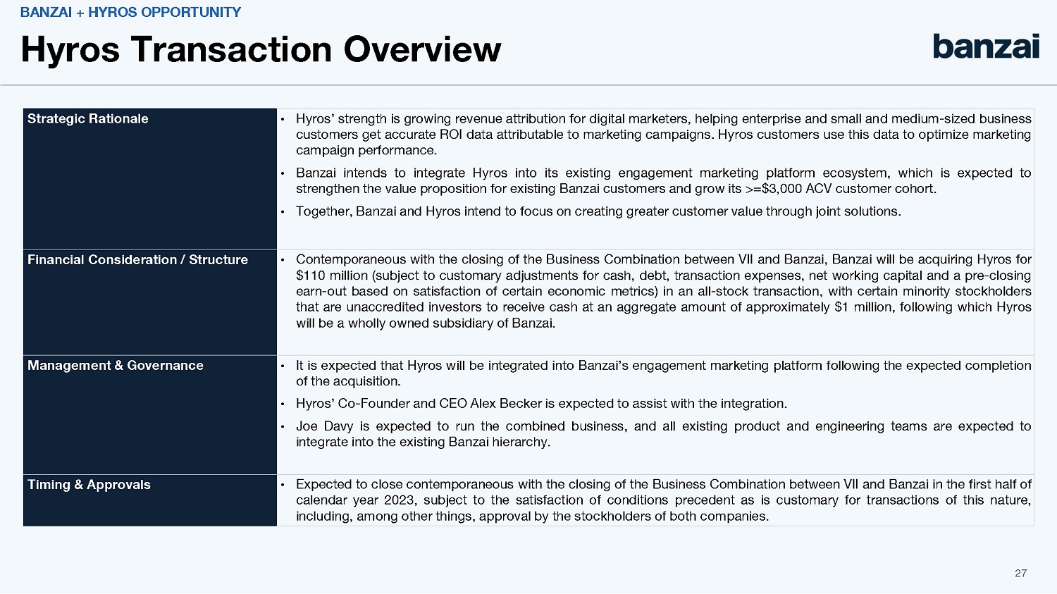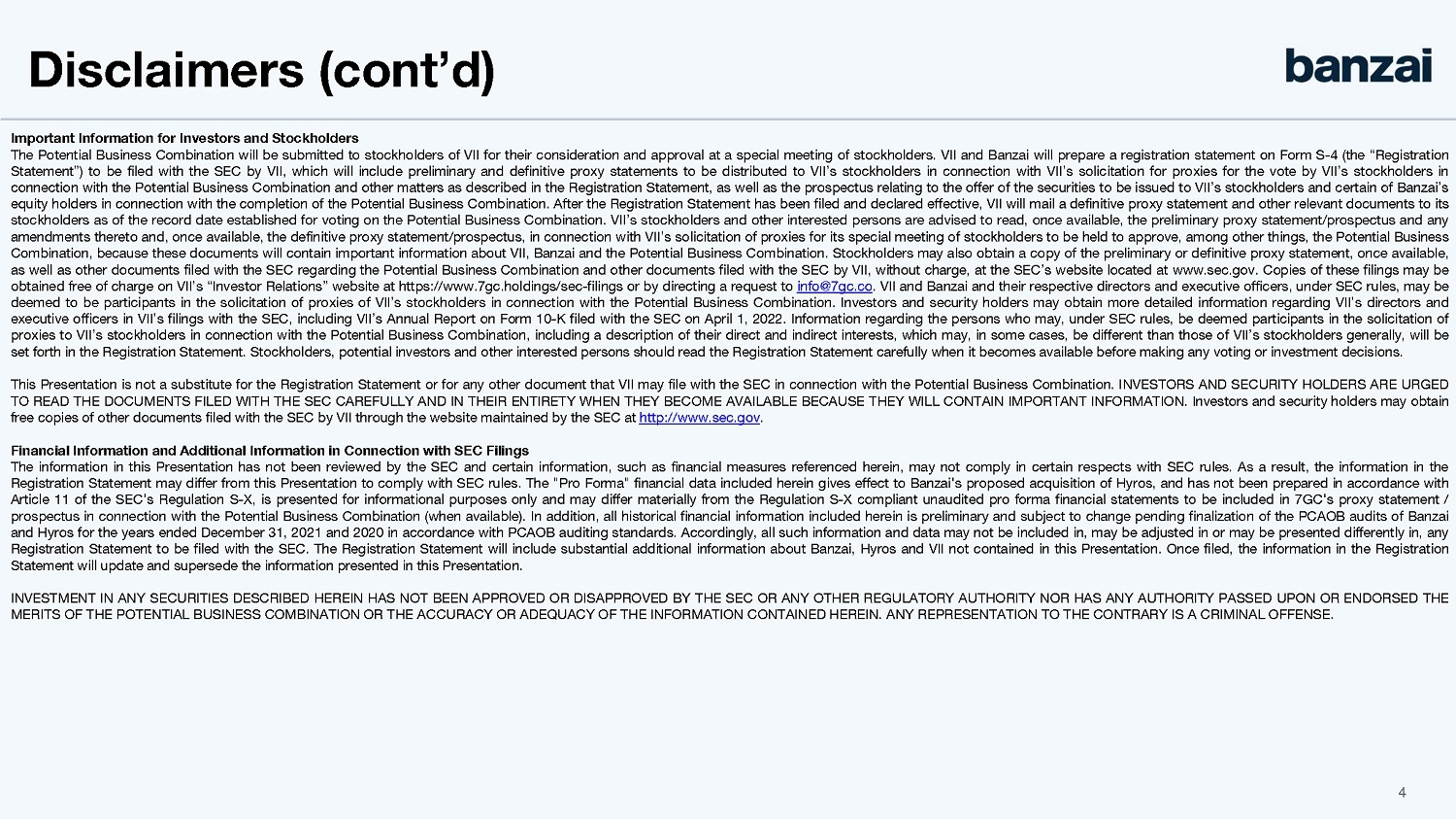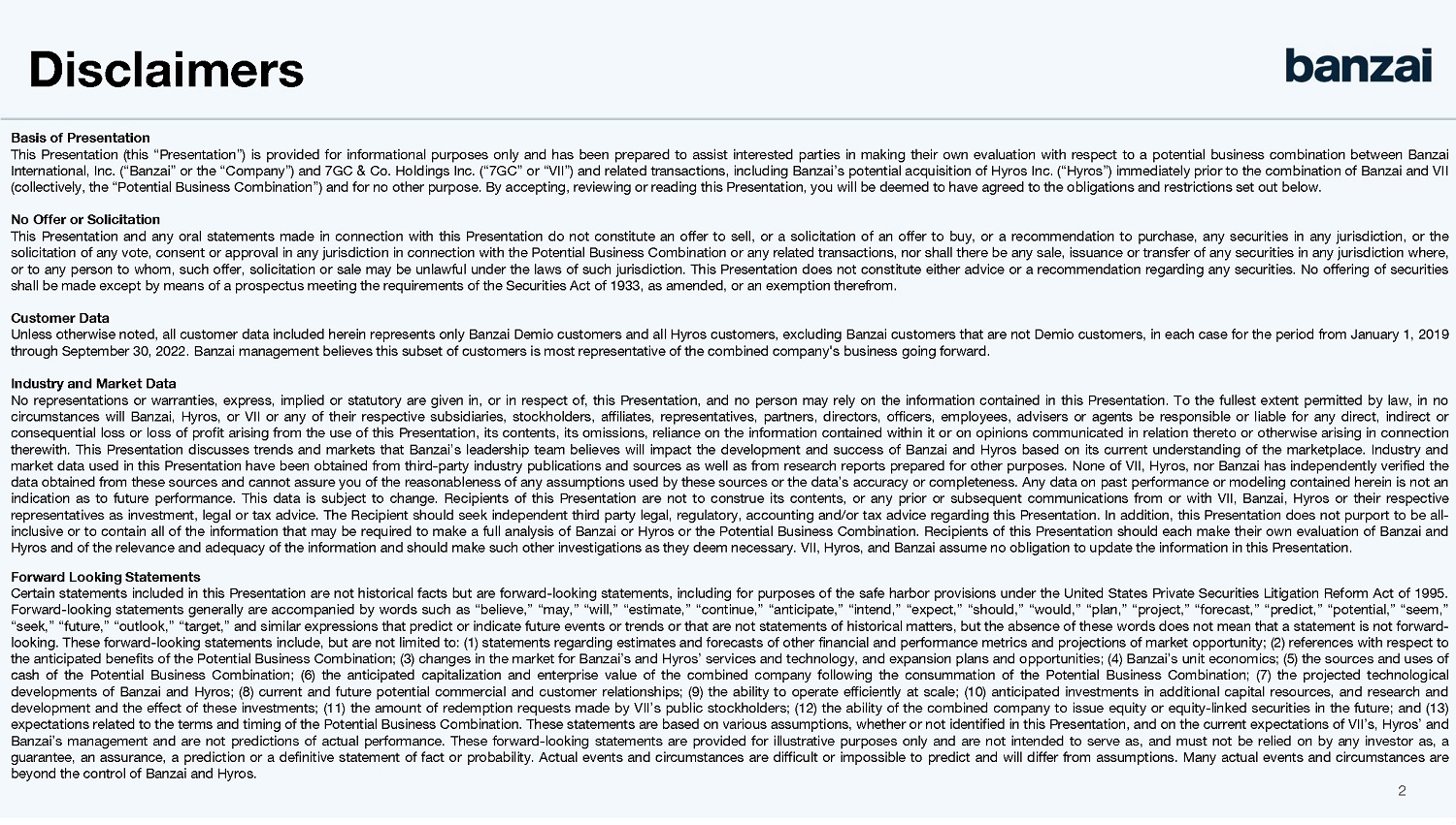 For a period of 90 days following the closing date of the Hyros Acquisition, and after consummation of the Business Combination, if 7GC reasonably determines that it has sufficient cash on its balance sheet, after taking into account all then-outstanding liabilities of 7GC (including any liabilities incurred by or on behalf of 7GC and its affiliates in connection with the Business Combination), then the Stockholder Representative will have the right to require that 7GC redeem, from each Hyros stockholder who received shares of Banzai common stock at the closing of the Hyros Acquisition and then 7GC New Class A Shares as a Pre-Closing Holder at the Closing, a number of shares of 7GC up to a specified maximum per stockholder for payment of an amount in cash calculated in accordance with the Hyros Purchase Agreement. The maximum aggregate cash amount that could be payable by 7GC in connection with such a redemption is expected to be approximately $86.9 million, subject to adjustment for any adjustments made at closing to cash, working capital, and other components of aggregate consideration under, and in each case calculated in accordance with the terms of, the Hyros Purchase Agreement. Any such redeemed shares will be deemed forfeited by the redeeming stockholder and cancelled by 7GC. The Hyros Purchase Agreement contains customary representations and warranties of the parties thereto, which survive for two years following the closing of the Hyros Acquisition. The consummation of the transactions contemplated by the Hyros Purchase Agreement (the “Hyros Transactions”) is subject to customary closing conditions, including (i) approval of the Hyros Transactions by (A) the holders of a majority of the shares of Hyros’ common stock and (B) the holders of a majority of the shares of the Company’s capital stock, (ii) the expiration or termination of the waiting period under the Hart-Scott-Rodino Antitrust Improvements Act of 1976, as amended, and (iii) no order, statute, rule or regulation enjoining or prohibiting the consummation of the Hyros Transactions being in force.
