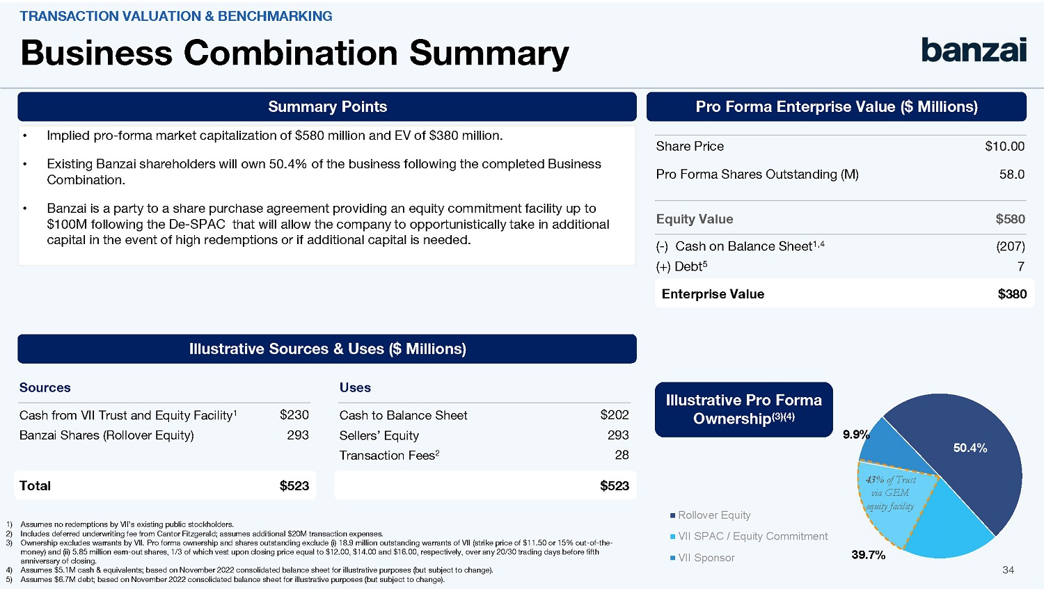 The Business Combination values the combined company resulting from the completion of the Business Combination at a pro forma enterprise value of approximately $380 million. Under the terms of the Merger Agreement, the consideration to be paid to security holders of the Company prior to the First Effective Time (the “Pre-Closing Holders”) in the First Merger is $293,000,000, subject to certain adjustments contained in the Merger Agreement, including a reduction of $7,672,000 and addition of the 7GC Transaction Expenses (as defined in the Merger Agreement) in excess of the deferred underwriting fees from 7GC’s initial public offering and $10,000,000, in each case as more specifically set forth in the Merger Agreement. The consideration will be paid in stock, comprised of shares of 7GC’s Class A common stock, par value $0.0001 per share (the “7GC New Class A Shares”), which will have one vote per share, and 7GC’s Class B common stock, par value $0.0001 per share (the “7GC New Class B Shares”), which will have ten votes per share, in each case, as such classes of common stock exist as of immediately following the First Effective Time (as defined below), and in cash in lieu of any fractional 7GC New Class A Shares or 7GC New Class B Shares that would otherwise be owed to any Pre-Closing Holder, as well as restricted 7GC New Class A Shares subject to the vesting and forfeiture provisions provided for in the Merger Agreement and described under “Earn Out Shares” below (collectively, the “Earn Out Shares”).