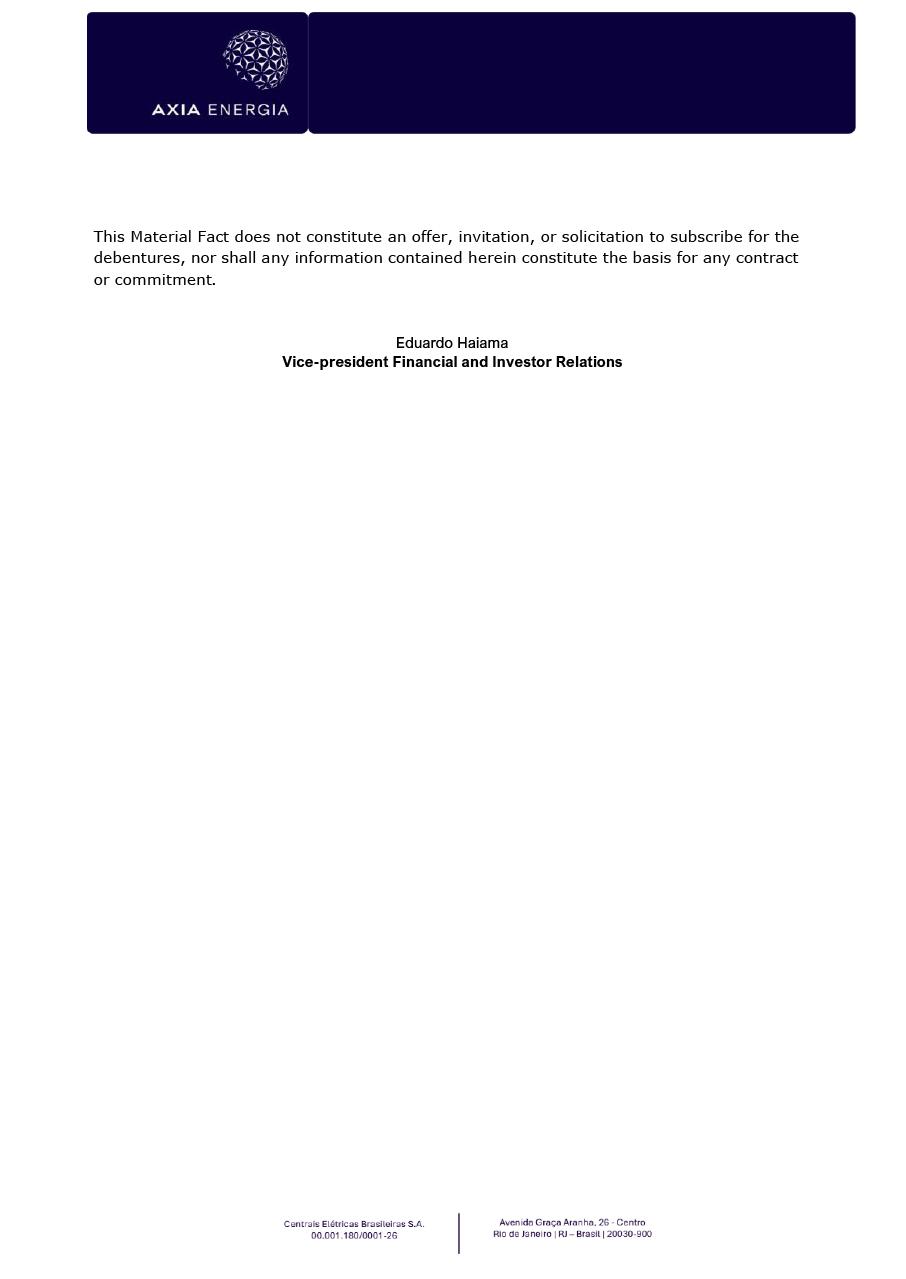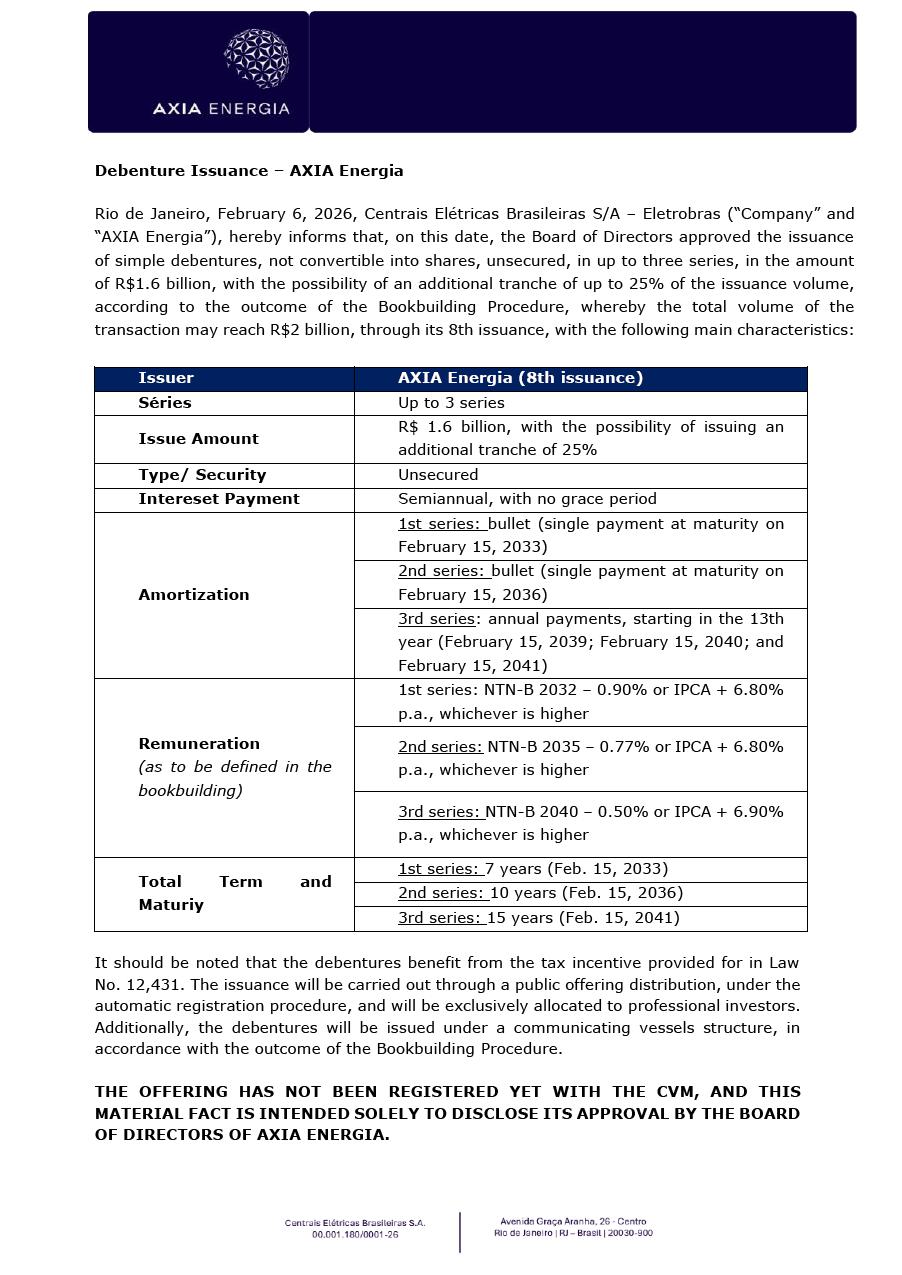 Debenture Issuance – AXIA Energia Rio de Janeiro, February 6, 2026, Centrais Elétricas Brasileiras S/A – Eletrobras (“Company” and “AXIA Energia”), hereby informs that, on this date, the Board of Directors approved the issuance of simple debentures, not convertible into shares, unsecured, in up to three series, in the amount of R$1.6 billion, with the possibility of an additional tranche of up to 25% of the issuance volume, according to the outcome of the Bookbuilding Procedure, whereby the total volume of the transaction may reach R$2 billion, through its 8th issuance, with the following main characteristics: Issuer AXIA Energia (8th issuance) Séries Up to 3 series Issue Amount R$ 1.6 billion, with the possibility of issuing an additional tranche of 25% Type/ Security Unsecured Intereset Payment Semiannual, with no grace period Amortization 1st series: bullet (single payment at maturity on February 15, 2033) 2nd series: bullet (single payment at maturity on February 15, 2036) 3rd series: annual payments, starting in the 13th year (February 15, 2039; February 15, 2040; and February 15, 2041) Remuneration (as to be defined in the bookbuilding) 1st series: NTN-B 2032 – 0.90% or IPCA + 6.80% p.a., whichever is higher 2nd series: NTN-B 2035 – 0.77% or IPCA + 6.80% p.a., whichever is higher 3rd series: NTN-B 2040 – 0.50% or IPCA + 6.90% p.a., whichever is higher Total Term and Maturiy 1st series: 7 years (Feb. 15, 2033) 2nd series: 10 years (Feb. 15, 2036) 3rd series: 15 years (Feb. 15, 2041) It should be noted that the debentures benefit from the tax incentive provided for in Law No. 12,431. The issuance will be carried out through a public offering distribution, under the automatic registration procedure, and will be exclusively allocated to professional investors. Additionally, the debentures will be issued under a communicating vessels structure, in accordance with the outcome of the Bookbuilding Procedure. THE OFFERING HAS NOT BEEN REGISTERED YET WITH THE CVM, AND THIS MATERIAL FACT IS INTENDED SOLELY TO DISCLOSE ITS APPROVAL BY THE BOARD OF DIRECTORS OF AXIA ENERGIA. This Material Fact does not constitute an offer, invitation, or solicitation to subscribe for the debentures, nor shall any information contained herein constitute the basis for any contract or commitment. Eduardo Haiama Vice-president Financial and Investor Relations