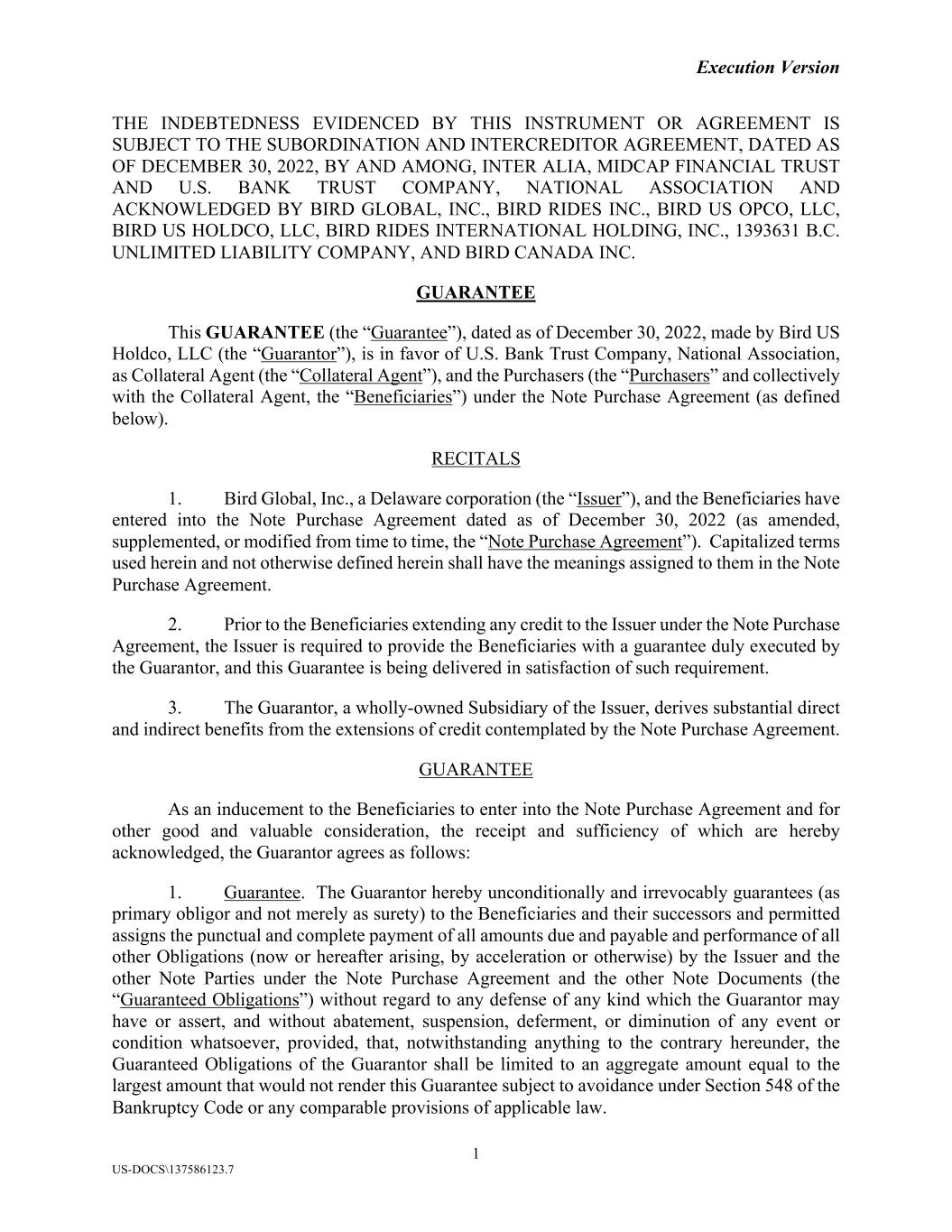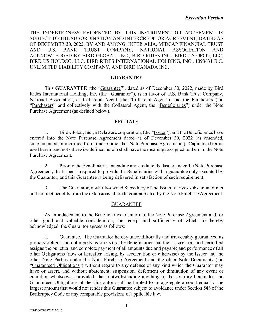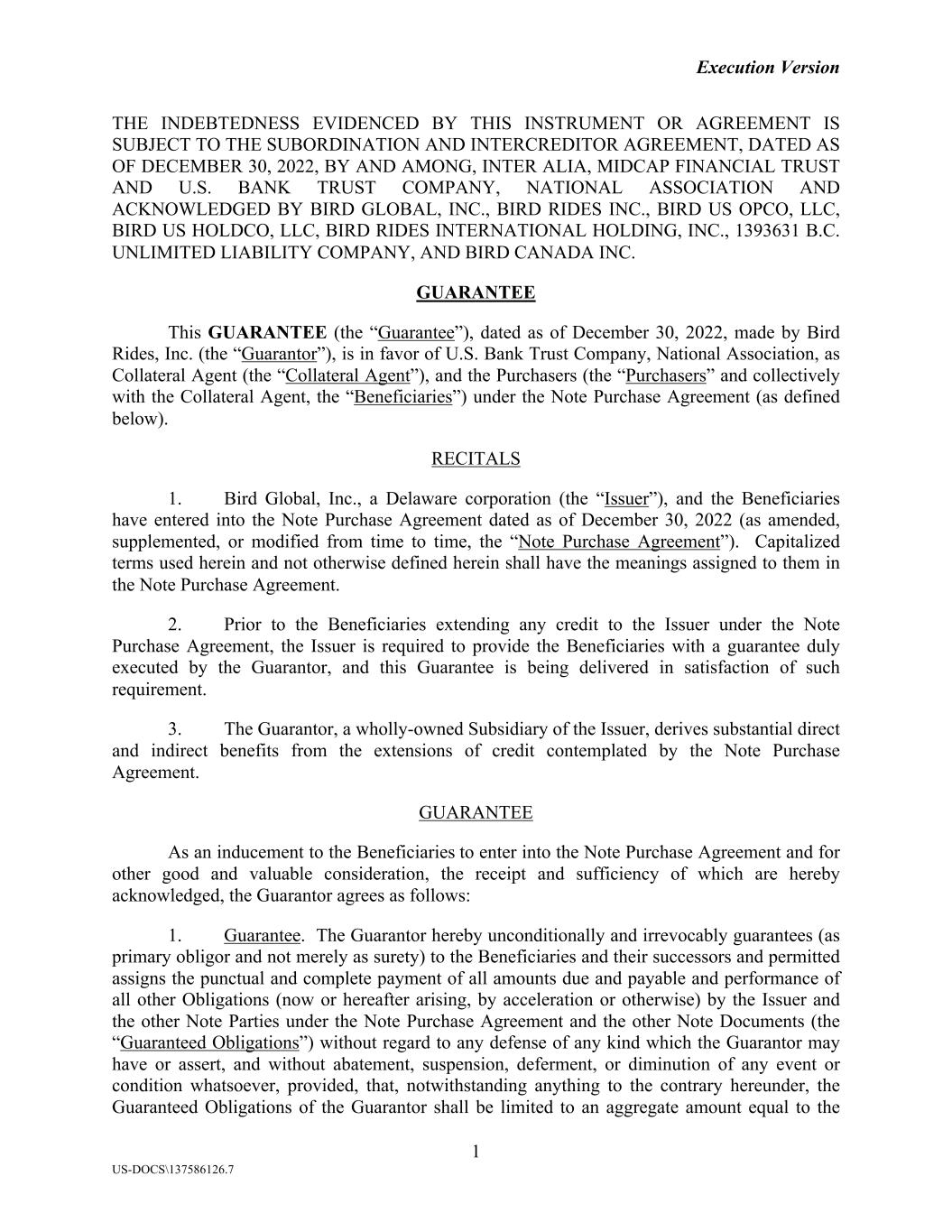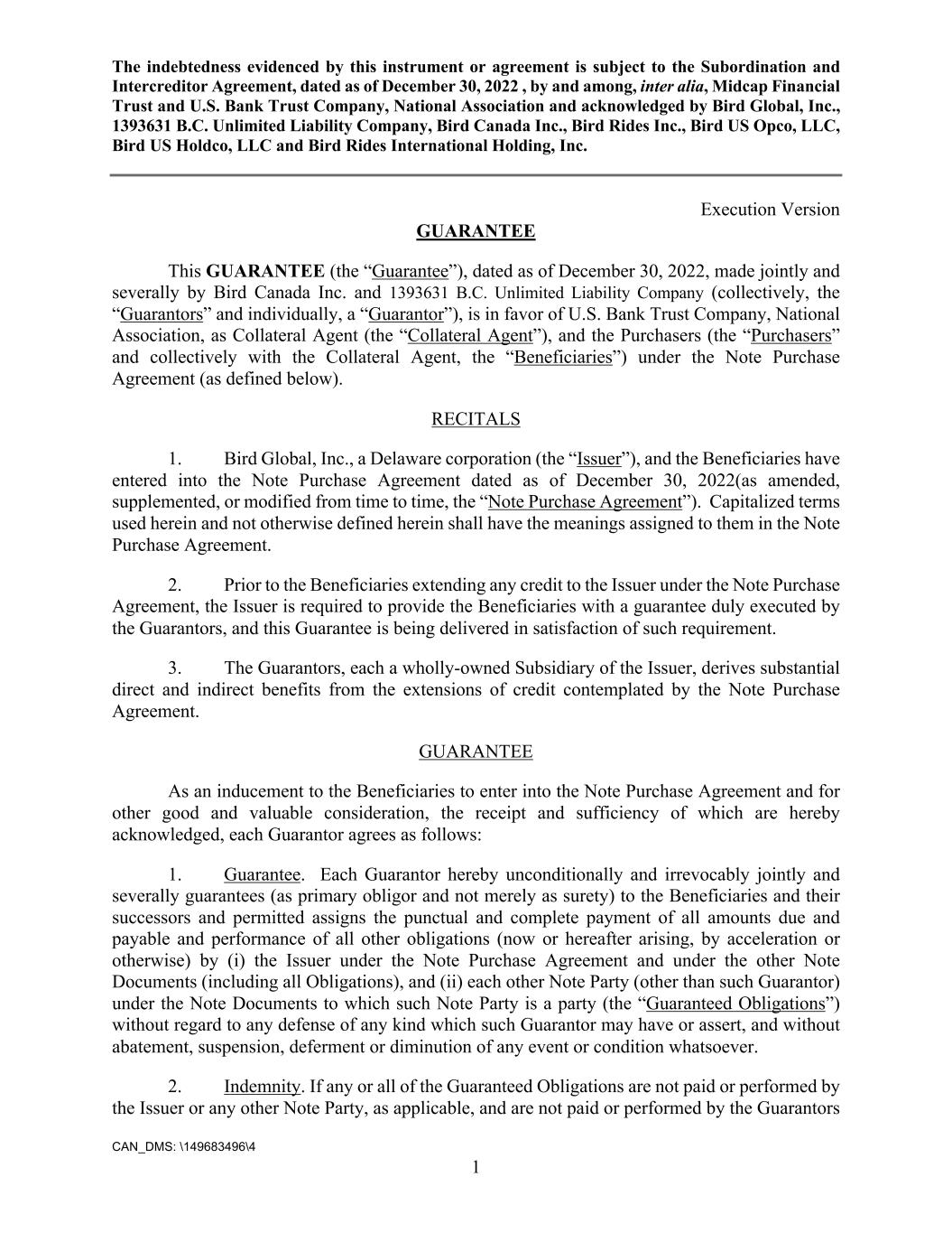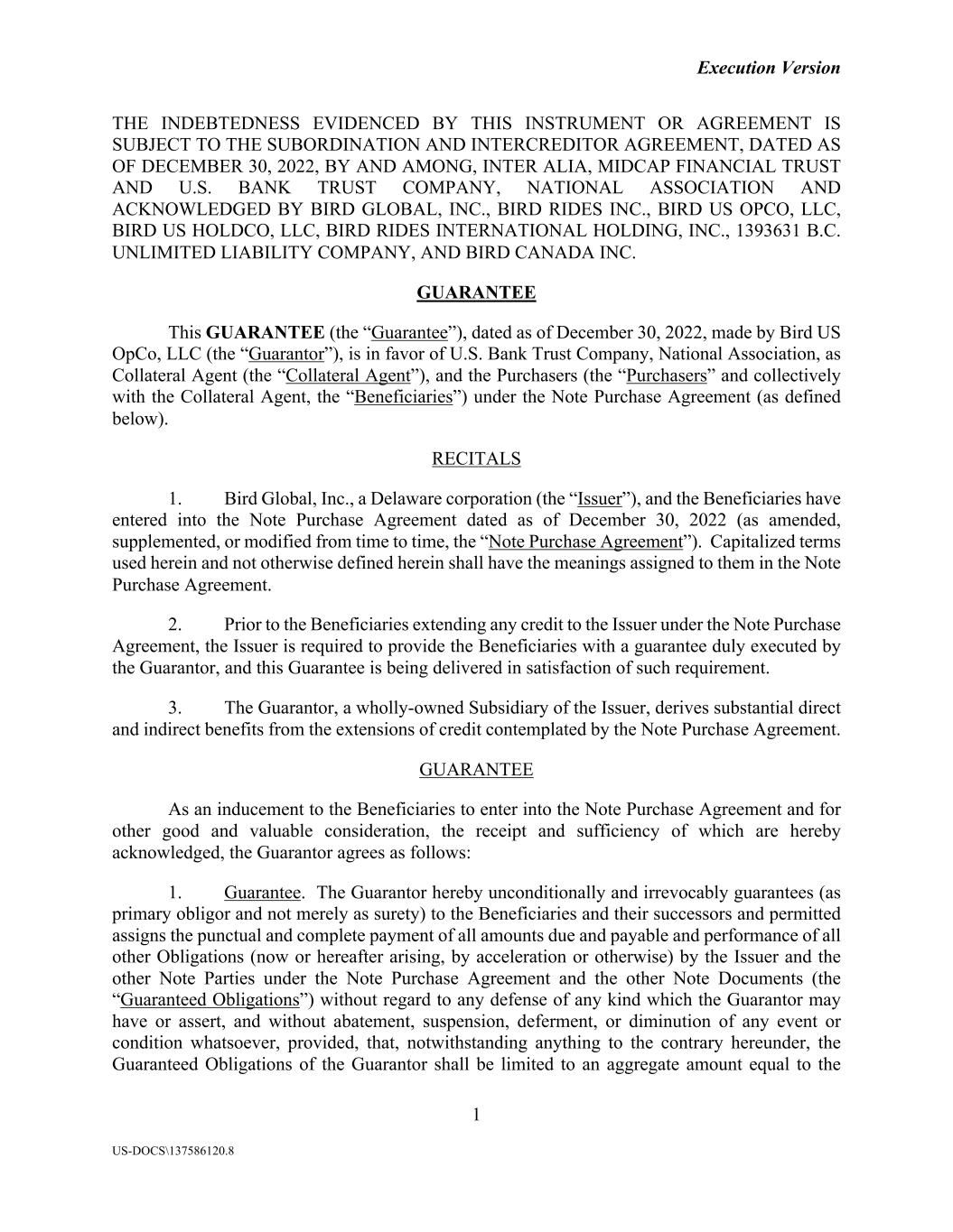 that certain guarantee, dated as of the Closing Date (the “Opco Guarantee”), by Bird Opco in favor of the Collateral Agent and the Note Purchasers, (ii) Bird US Holdco, LLC, an indirect subsidiary of the Company (“Bird Holdco”), pursuant to that certain guarantee, dated as of the Closing Date (the “Holdco Guarantee”), by Bird Holdco in favor of the Collateral Agent and the Note Purchasers, (iii) Bird Rides International Holding, Inc., an indirect subsidiary of the Company (“Bird Rides International”), pursuant to that certain guarantee, dated as of the Closing Date (the “Bird Rides International Guarantee”), by Bird Rides International in favor of the Collateral Agent and the Note Purchasers, and (iv) Bird Canada and the Purchaser, pursuant to that certain guarantee, dated as of the Closing Date (the “Bird Canada Guarantee”), by Bird Canada and the Purchaser in favor of the Collateral Agent and the Note Purchasers. The Notes are guaranteed on a senior unsecured basis by Bird Rides, Inc., a direct wholly owned subsidiary of the Company (“Bird Rides”), pursuant to that certain guarantee, dated as of the Closing Date (the “Bird Rides Guarantee”), by Bird Rides in favor of the Collateral Agent and the Note Purchasers. The obligations of the Notes are secured, pursuant to the Note Purchase Agreement, the Opco Guarantee, the Holdco Guarantee and the Bird Rides International Guarantee, as well as pursuant to (x) that certain pledge agreement, dated as of the Closing Date (the “Canadian Pledge Agreement”), among the Company and the Collateral Agent and (y) that certain pledge and collateral agreement, dated as of the Closing Date (the “Canadian Collateral Agreement”), among Bird Canada, the Purchaser and the Collateral Agent, (i) on a first-priority basis by all of the equity of Bird Rides, Bird Canada and the Purchaser, as well as substantially all assets of Bird Canada and the Purchaser and (ii) on a second-priority basis, subordinated to the secured obligations of the Amended Loan Agreement (as defined below), by all of the equity of Bird Opco, substantially all assets of Bird Holdco and Bird Opco and 65% of the equity of Bird Rides Europe B.V., an indirect subsidiary of the Company.