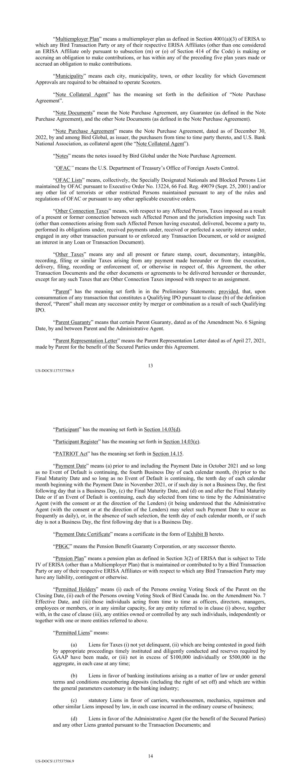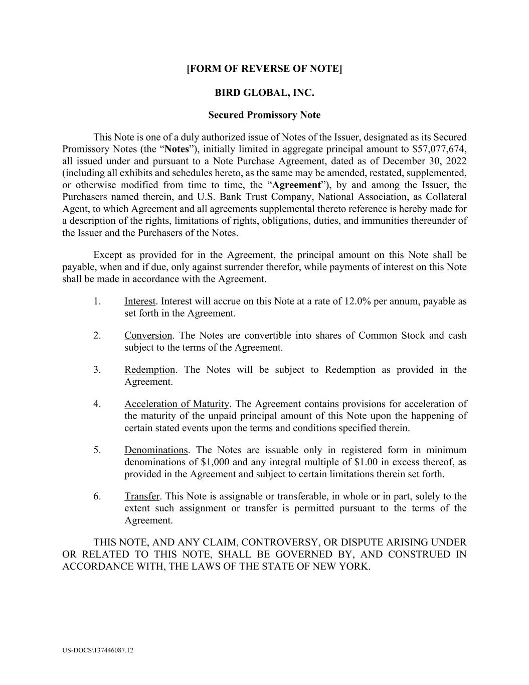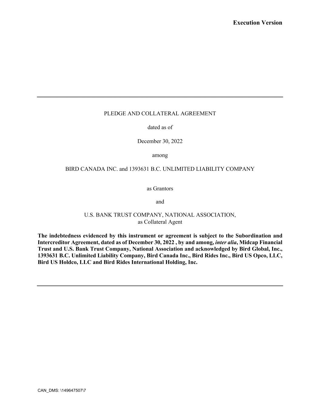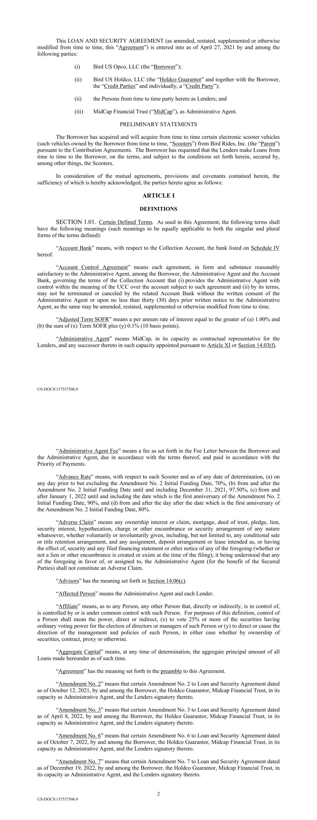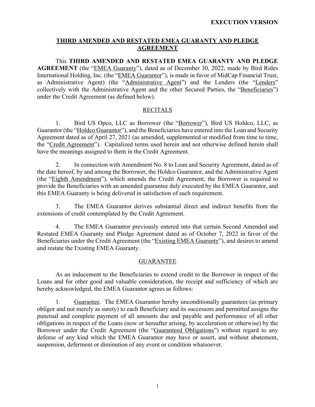 that certain guarantee, dated as of the Closing Date (the “Opco Guarantee”), by Bird Opco in favor of the Collateral Agent and the Note Purchasers, (ii) Bird US Holdco, LLC, an indirect subsidiary of the Company (“Bird Holdco”), pursuant to that certain guarantee, dated as of the Closing Date (the “Holdco Guarantee”), by Bird Holdco in favor of the Collateral Agent and the Note Purchasers, (iii) Bird Rides International Holding, Inc., an indirect subsidiary of the Company (“Bird Rides International”), pursuant to that certain guarantee, dated as of the Closing Date (the “Bird Rides International Guarantee”), by Bird Rides International in favor of the Collateral Agent and the Note Purchasers, and (iv) Bird Canada and the Purchaser, pursuant to that certain guarantee, dated as of the Closing Date (the “Bird Canada Guarantee”), by Bird Canada and the Purchaser in favor of the Collateral Agent and the Note Purchasers. The Notes are guaranteed on a senior unsecured basis by Bird Rides, Inc., a direct wholly owned subsidiary of the Company (“Bird Rides”), pursuant to that certain guarantee, dated as of the Closing Date (the “Bird Rides Guarantee”), by Bird Rides in favor of the Collateral Agent and the Note Purchasers. The obligations of the Notes are secured, pursuant to the Note Purchase Agreement, the Opco Guarantee, the Holdco Guarantee and the Bird Rides International Guarantee, as well as pursuant to (x) that certain pledge agreement, dated as of the Closing Date (the “Canadian Pledge Agreement”), among the Company and the Collateral Agent and (y) that certain pledge and collateral agreement, dated as of the Closing Date (the “Canadian Collateral Agreement”), among Bird Canada, the Purchaser and the Collateral Agent, (i) on a first-priority basis by all of the equity of Bird Rides, Bird Canada and the Purchaser, as well as substantially all assets of Bird Canada and the Purchaser and (ii) on a second-priority basis, subordinated to the secured obligations of the Amended Loan Agreement (as defined below), by all of the equity of Bird Opco, substantially all assets of Bird Holdco and Bird Opco and 65% of the equity of Bird Rides Europe B.V., an indirect subsidiary of the Company.