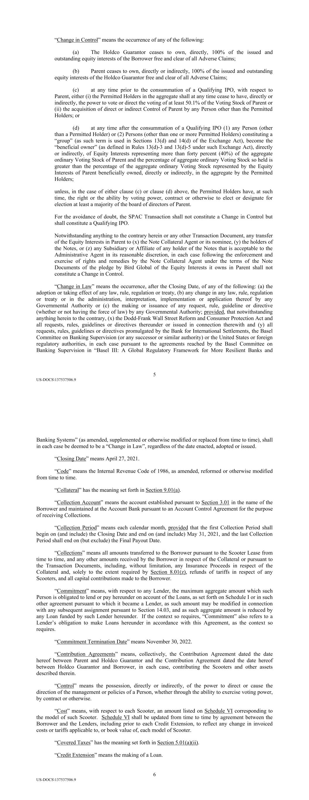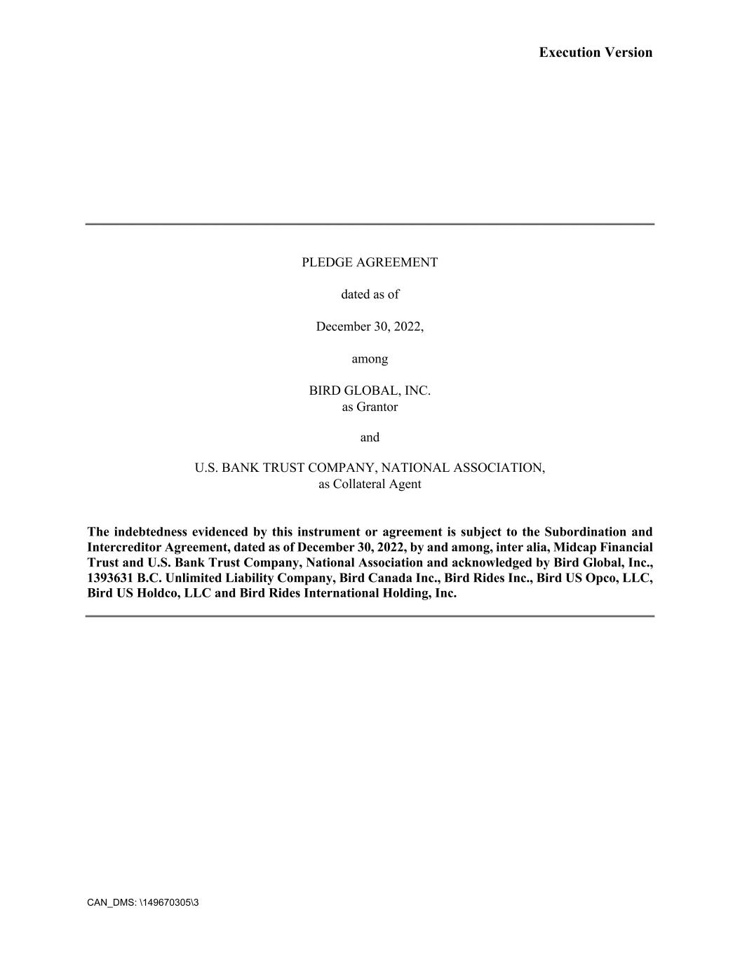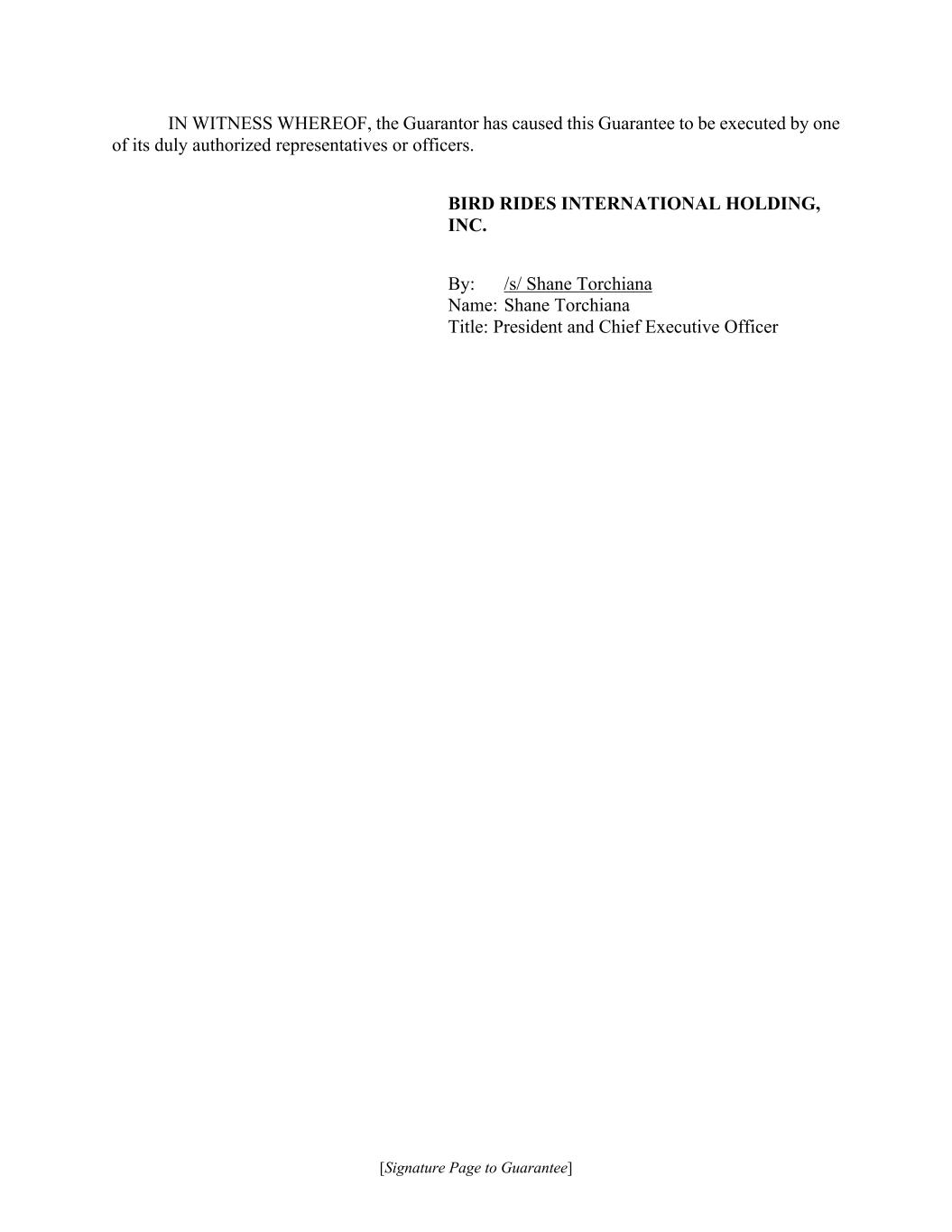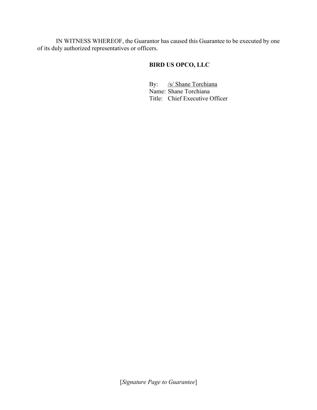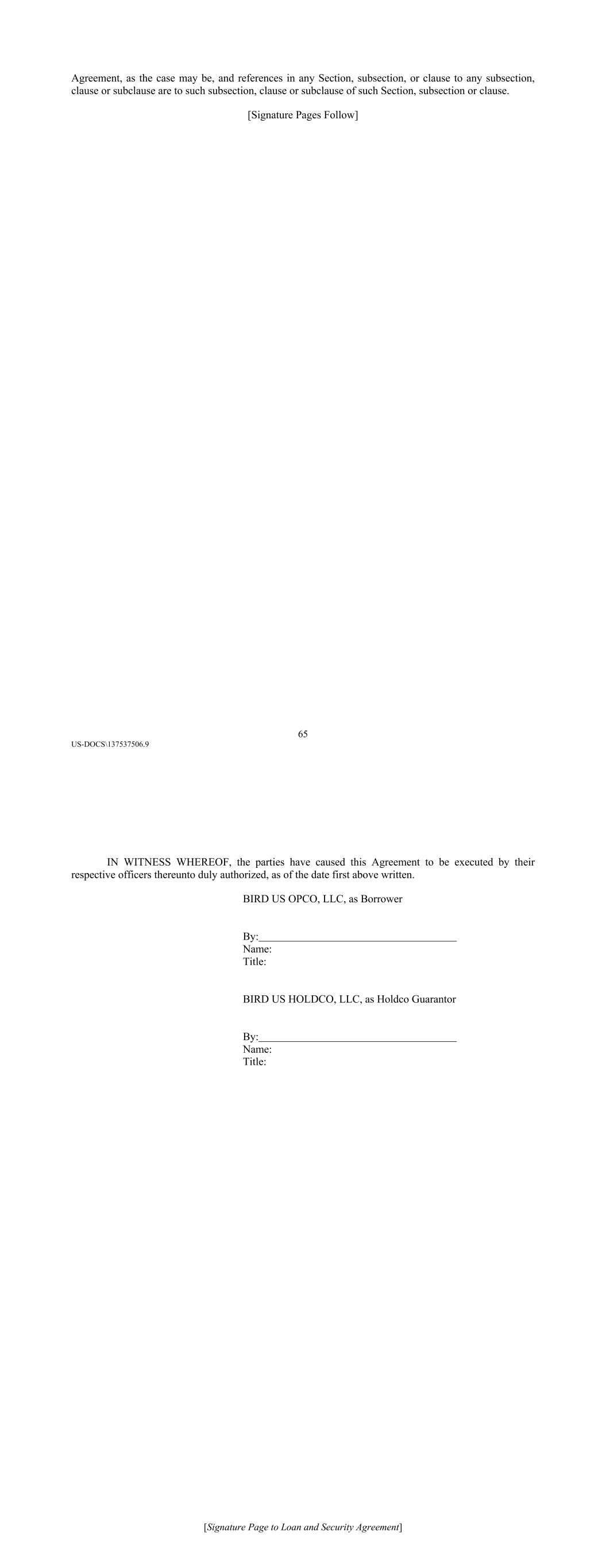 that certain guarantee, dated as of the Closing Date (the “Opco Guarantee”), by Bird Opco in favor of the Collateral Agent and the Note Purchasers, (ii) Bird US Holdco, LLC, an indirect subsidiary of the Company (“Bird Holdco”), pursuant to that certain guarantee, dated as of the Closing Date (the “Holdco Guarantee”), by Bird Holdco in favor of the Collateral Agent and the Note Purchasers, (iii) Bird Rides International Holding, Inc., an indirect subsidiary of the Company (“Bird Rides International”), pursuant to that certain guarantee, dated as of the Closing Date (the “Bird Rides International Guarantee”), by Bird Rides International in favor of the Collateral Agent and the Note Purchasers, and (iv) Bird Canada and the Purchaser, pursuant to that certain guarantee, dated as of the Closing Date (the “Bird Canada Guarantee”), by Bird Canada and the Purchaser in favor of the Collateral Agent and the Note Purchasers. The Notes are guaranteed on a senior unsecured basis by Bird Rides, Inc., a direct wholly owned subsidiary of the Company (“Bird Rides”), pursuant to that certain guarantee, dated as of the Closing Date (the “Bird Rides Guarantee”), by Bird Rides in favor of the Collateral Agent and the Note Purchasers. The obligations of the Notes are secured, pursuant to the Note Purchase Agreement, the Opco Guarantee, the Holdco Guarantee and the Bird Rides International Guarantee, as well as pursuant to (x) that certain pledge agreement, dated as of the Closing Date (the “Canadian Pledge Agreement”), among the Company and the Collateral Agent and (y) that certain pledge and collateral agreement, dated as of the Closing Date (the “Canadian Collateral Agreement”), among Bird Canada, the Purchaser and the Collateral Agent, (i) on a first-priority basis by all of the equity of Bird Rides, Bird Canada and the Purchaser, as well as substantially all assets of Bird Canada and the Purchaser and (ii) on a second-priority basis, subordinated to the secured obligations of the Amended Loan Agreement (as defined below), by all of the equity of Bird Opco, substantially all assets of Bird Holdco and Bird Opco and 65% of the equity of Bird Rides Europe B.V., an indirect subsidiary of the Company.
