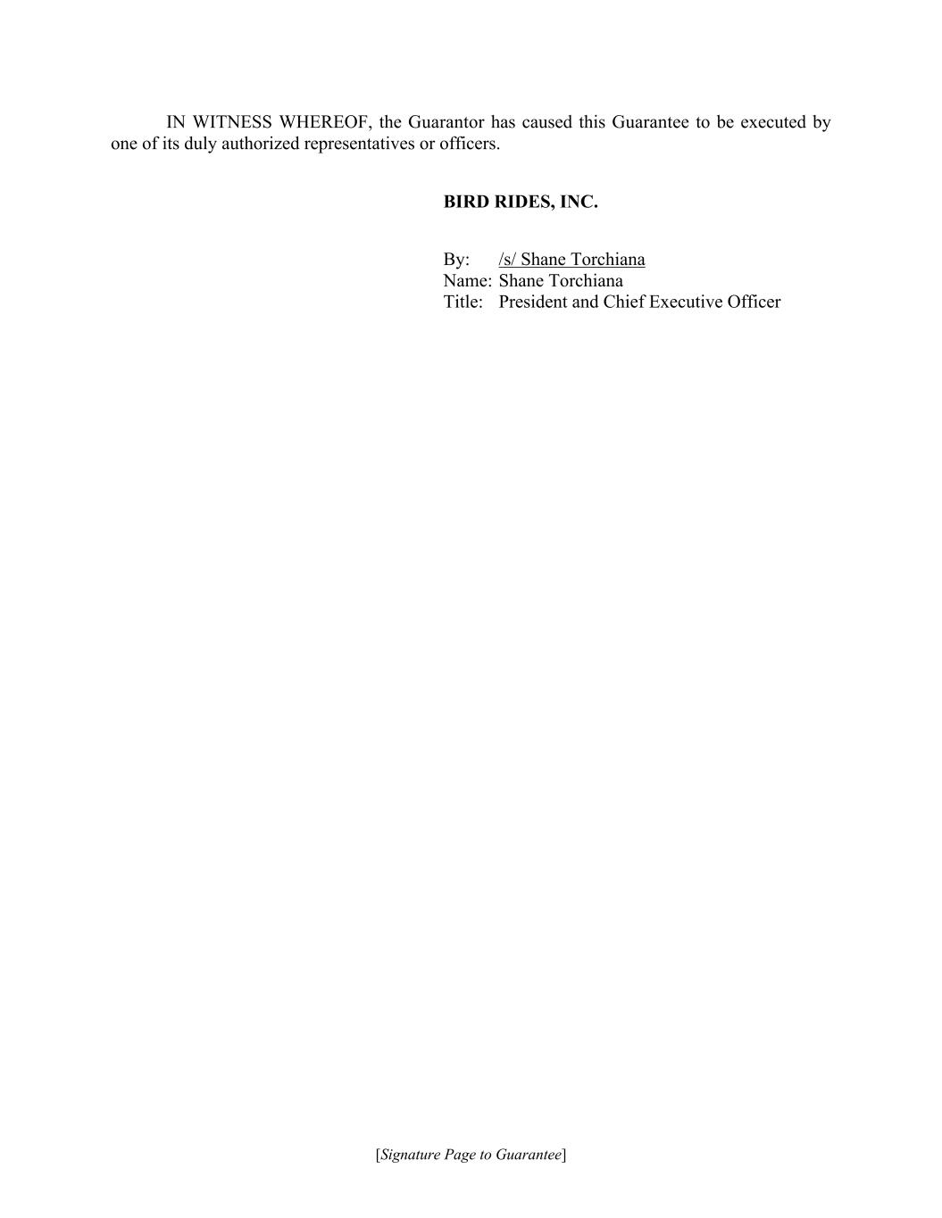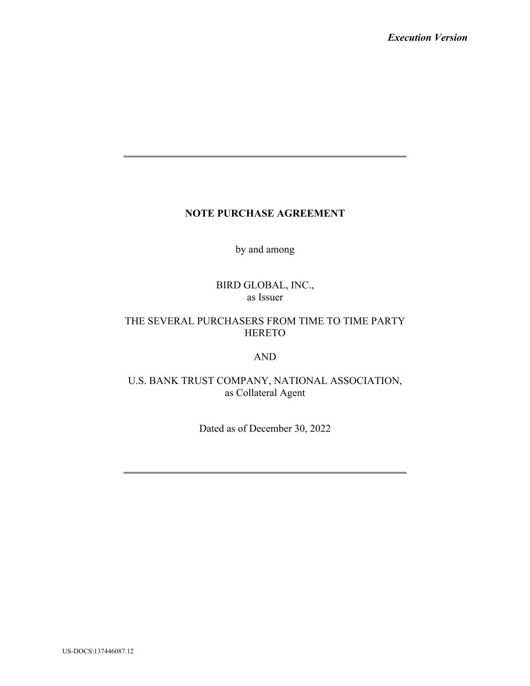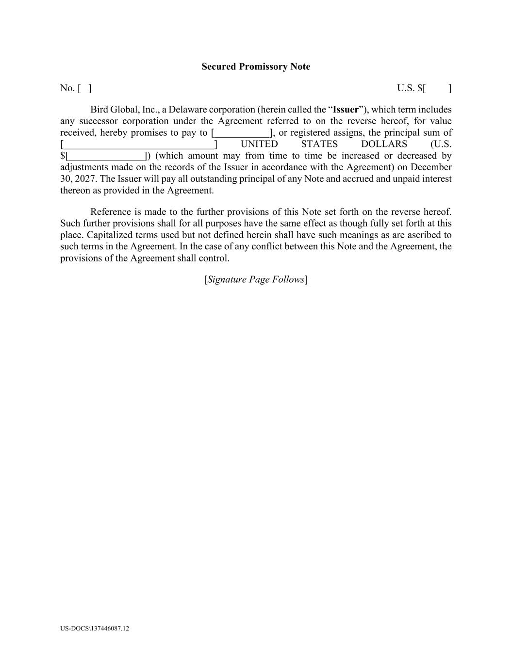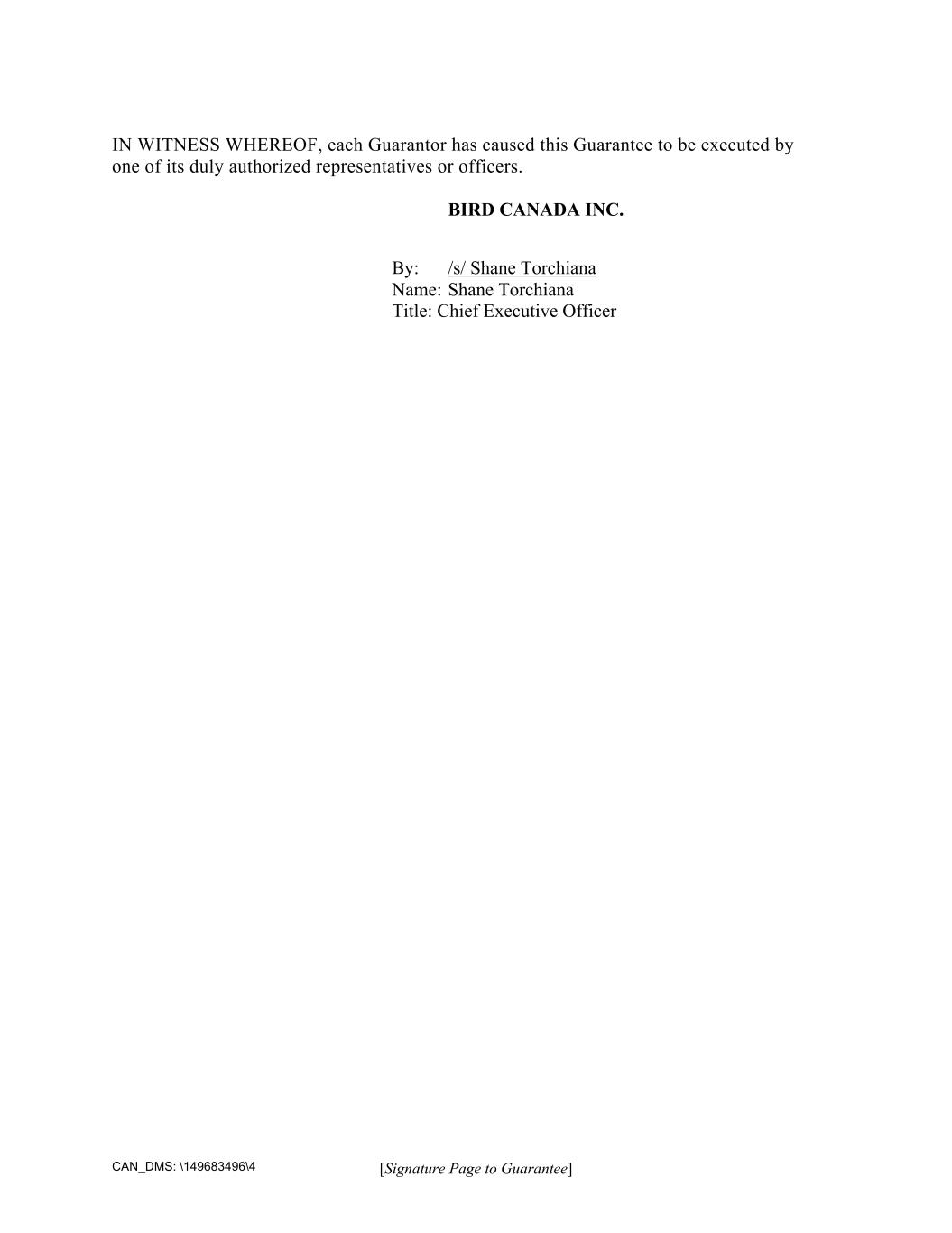 that certain guarantee, dated as of the Closing Date (the “Opco Guarantee”), by Bird Opco in favor of the Collateral Agent and the Note Purchasers, (ii) Bird US Holdco, LLC, an indirect subsidiary of the Company (“Bird Holdco”), pursuant to that certain guarantee, dated as of the Closing Date (the “Holdco Guarantee”), by Bird Holdco in favor of the Collateral Agent and the Note Purchasers, (iii) Bird Rides International Holding, Inc., an indirect subsidiary of the Company (“Bird Rides International”), pursuant to that certain guarantee, dated as of the Closing Date (the “Bird Rides International Guarantee”), by Bird Rides International in favor of the Collateral Agent and the Note Purchasers, and (iv) Bird Canada and the Purchaser, pursuant to that certain guarantee, dated as of the Closing Date (the “Bird Canada Guarantee”), by Bird Canada and the Purchaser in favor of the Collateral Agent and the Note Purchasers. The Notes are guaranteed on a senior unsecured basis by Bird Rides, Inc., a direct wholly owned subsidiary of the Company (“Bird Rides”), pursuant to that certain guarantee, dated as of the Closing Date (the “Bird Rides Guarantee”), by Bird Rides in favor of the Collateral Agent and the Note Purchasers. The obligations of the Notes are secured, pursuant to the Note Purchase Agreement, the Opco Guarantee, the Holdco Guarantee and the Bird Rides International Guarantee, as well as pursuant to (x) that certain pledge agreement, dated as of the Closing Date (the “Canadian Pledge Agreement”), among the Company and the Collateral Agent and (y) that certain pledge and collateral agreement, dated as of the Closing Date (the “Canadian Collateral Agreement”), among Bird Canada, the Purchaser and the Collateral Agent, (i) on a first-priority basis by all of the equity of Bird Rides, Bird Canada and the Purchaser, as well as substantially all assets of Bird Canada and the Purchaser and (ii) on a second-priority basis, subordinated to the secured obligations of the Amended Loan Agreement (as defined below), by all of the equity of Bird Opco, substantially all assets of Bird Holdco and Bird Opco and 65% of the equity of Bird Rides Europe B.V., an indirect subsidiary of the Company.