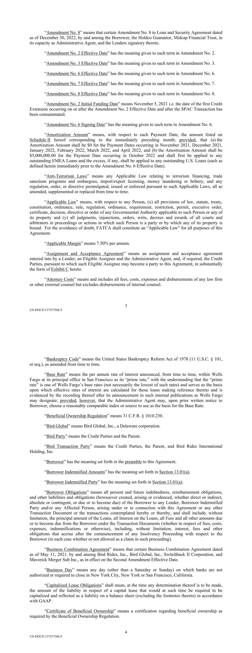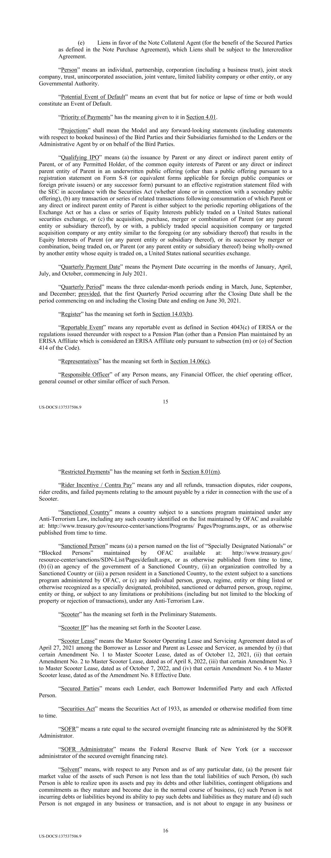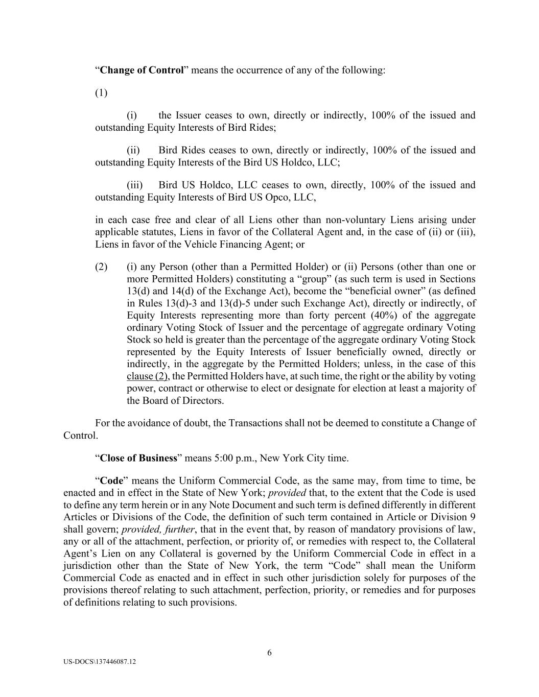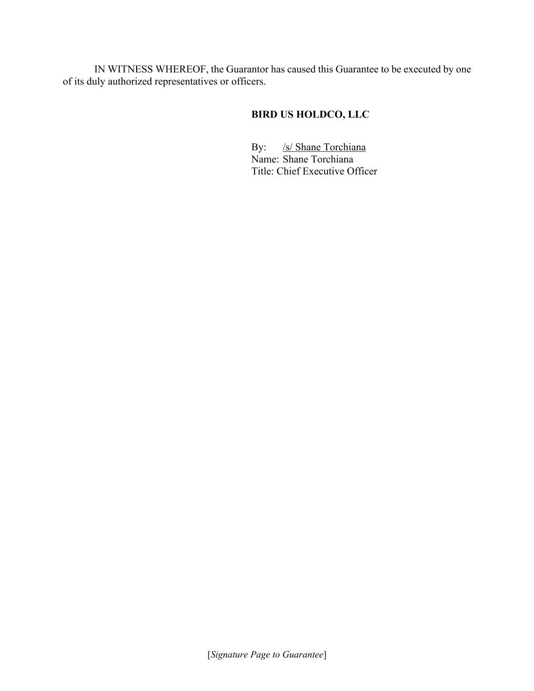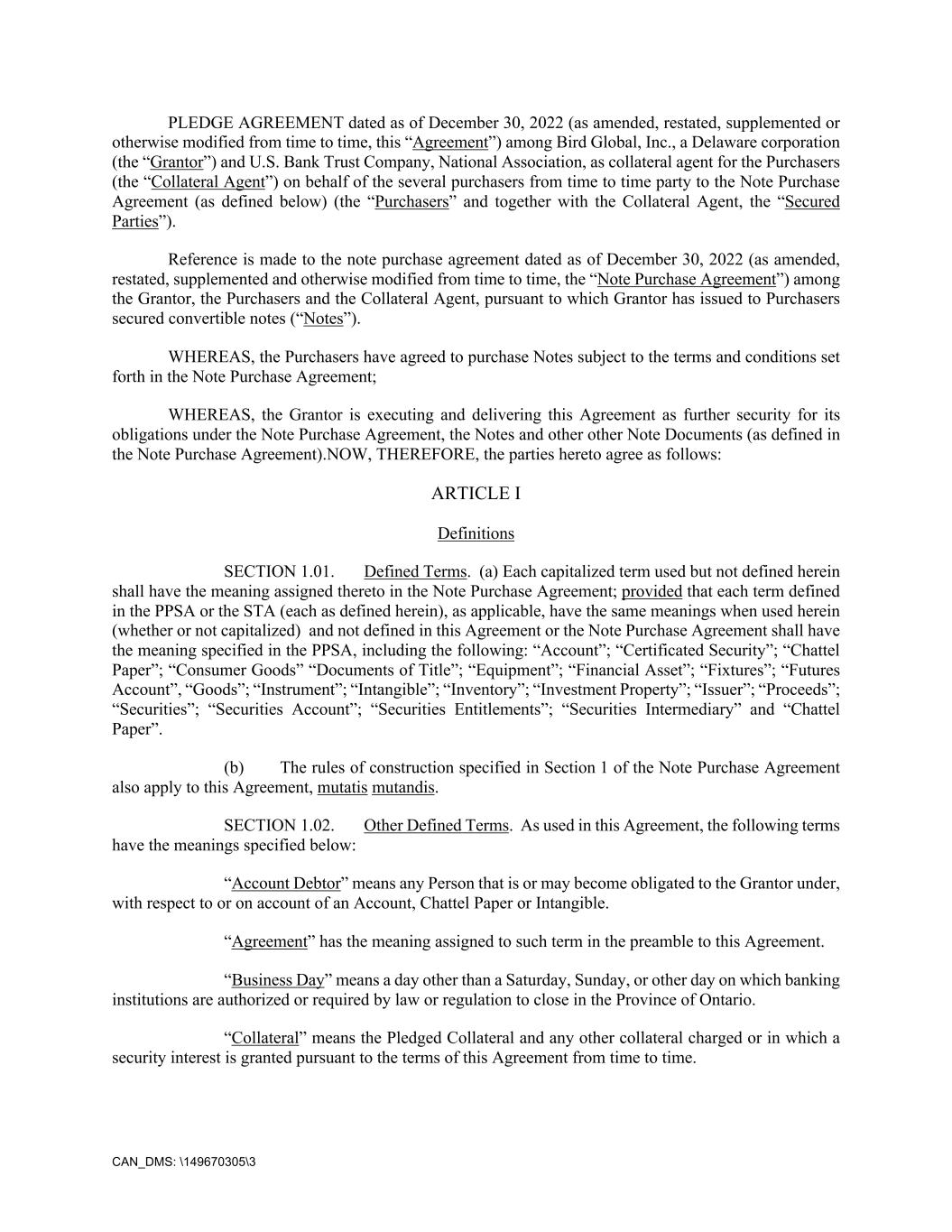 that certain guarantee, dated as of the Closing Date (the “Opco Guarantee”), by Bird Opco in favor of the Collateral Agent and the Note Purchasers, (ii) Bird US Holdco, LLC, an indirect subsidiary of the Company (“Bird Holdco”), pursuant to that certain guarantee, dated as of the Closing Date (the “Holdco Guarantee”), by Bird Holdco in favor of the Collateral Agent and the Note Purchasers, (iii) Bird Rides International Holding, Inc., an indirect subsidiary of the Company (“Bird Rides International”), pursuant to that certain guarantee, dated as of the Closing Date (the “Bird Rides International Guarantee”), by Bird Rides International in favor of the Collateral Agent and the Note Purchasers, and (iv) Bird Canada and the Purchaser, pursuant to that certain guarantee, dated as of the Closing Date (the “Bird Canada Guarantee”), by Bird Canada and the Purchaser in favor of the Collateral Agent and the Note Purchasers. The Notes are guaranteed on a senior unsecured basis by Bird Rides, Inc., a direct wholly owned subsidiary of the Company (“Bird Rides”), pursuant to that certain guarantee, dated as of the Closing Date (the “Bird Rides Guarantee”), by Bird Rides in favor of the Collateral Agent and the Note Purchasers. The obligations of the Notes are secured, pursuant to the Note Purchase Agreement, the Opco Guarantee, the Holdco Guarantee and the Bird Rides International Guarantee, as well as pursuant to (x) that certain pledge agreement, dated as of the Closing Date (the “Canadian Pledge Agreement”), among the Company and the Collateral Agent and (y) that certain pledge and collateral agreement, dated as of the Closing Date (the “Canadian Collateral Agreement”), among Bird Canada, the Purchaser and the Collateral Agent, (i) on a first-priority basis by all of the equity of Bird Rides, Bird Canada and the Purchaser, as well as substantially all assets of Bird Canada and the Purchaser and (ii) on a second-priority basis, subordinated to the secured obligations of the Amended Loan Agreement (as defined below), by all of the equity of Bird Opco, substantially all assets of Bird Holdco and Bird Opco and 65% of the equity of Bird Rides Europe B.V., an indirect subsidiary of the Company.