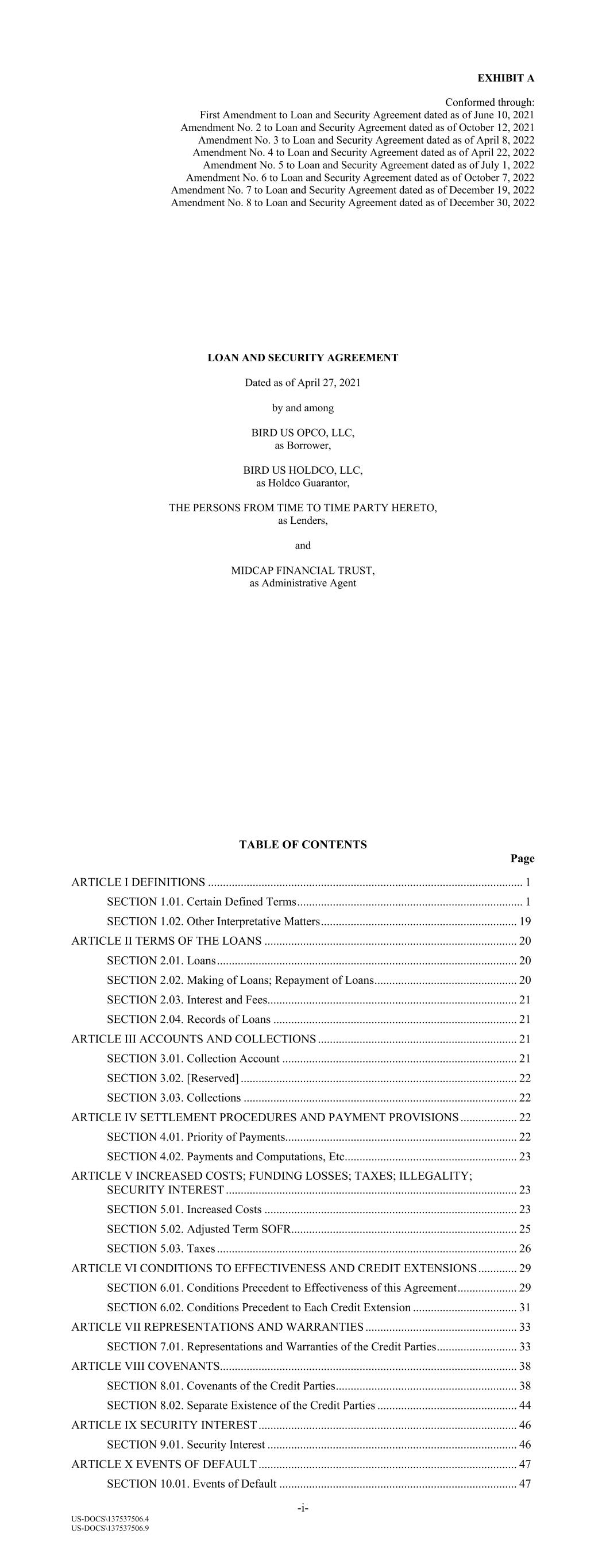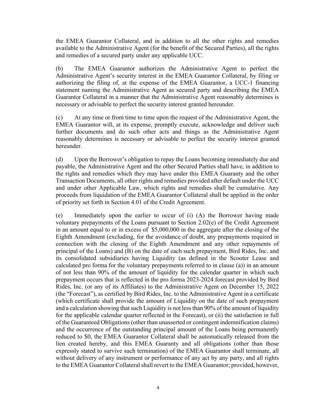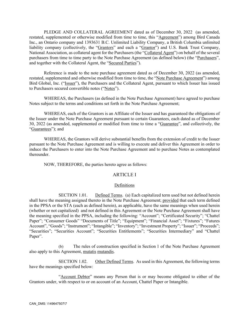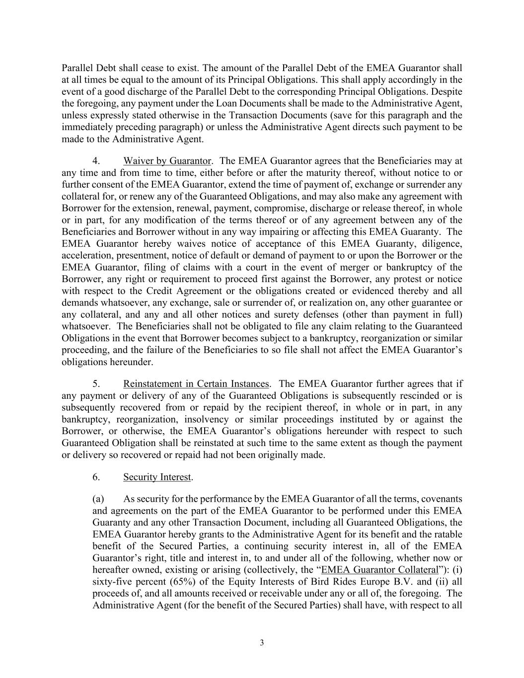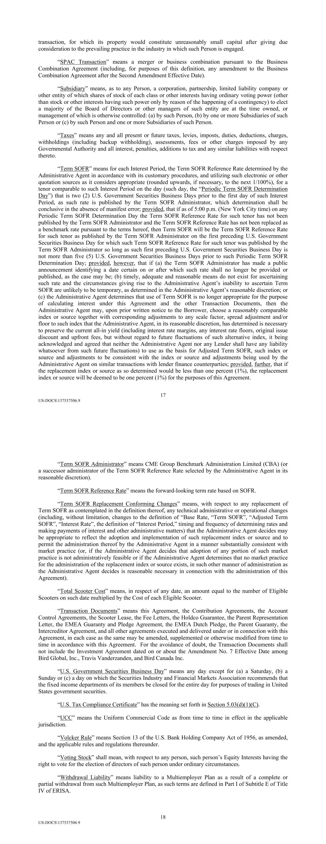 that certain guarantee, dated as of the Closing Date (the “Opco Guarantee”), by Bird Opco in favor of the Collateral Agent and the Note Purchasers, (ii) Bird US Holdco, LLC, an indirect subsidiary of the Company (“Bird Holdco”), pursuant to that certain guarantee, dated as of the Closing Date (the “Holdco Guarantee”), by Bird Holdco in favor of the Collateral Agent and the Note Purchasers, (iii) Bird Rides International Holding, Inc., an indirect subsidiary of the Company (“Bird Rides International”), pursuant to that certain guarantee, dated as of the Closing Date (the “Bird Rides International Guarantee”), by Bird Rides International in favor of the Collateral Agent and the Note Purchasers, and (iv) Bird Canada and the Purchaser, pursuant to that certain guarantee, dated as of the Closing Date (the “Bird Canada Guarantee”), by Bird Canada and the Purchaser in favor of the Collateral Agent and the Note Purchasers. The Notes are guaranteed on a senior unsecured basis by Bird Rides, Inc., a direct wholly owned subsidiary of the Company (“Bird Rides”), pursuant to that certain guarantee, dated as of the Closing Date (the “Bird Rides Guarantee”), by Bird Rides in favor of the Collateral Agent and the Note Purchasers. The obligations of the Notes are secured, pursuant to the Note Purchase Agreement, the Opco Guarantee, the Holdco Guarantee and the Bird Rides International Guarantee, as well as pursuant to (x) that certain pledge agreement, dated as of the Closing Date (the “Canadian Pledge Agreement”), among the Company and the Collateral Agent and (y) that certain pledge and collateral agreement, dated as of the Closing Date (the “Canadian Collateral Agreement”), among Bird Canada, the Purchaser and the Collateral Agent, (i) on a first-priority basis by all of the equity of Bird Rides, Bird Canada and the Purchaser, as well as substantially all assets of Bird Canada and the Purchaser and (ii) on a second-priority basis, subordinated to the secured obligations of the Amended Loan Agreement (as defined below), by all of the equity of Bird Opco, substantially all assets of Bird Holdco and Bird Opco and 65% of the equity of Bird Rides Europe B.V., an indirect subsidiary of the Company.