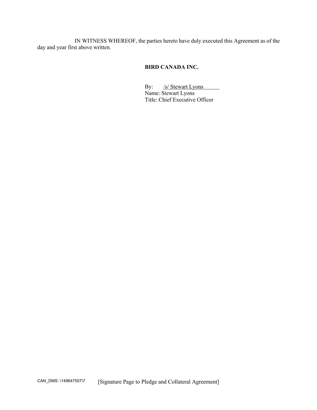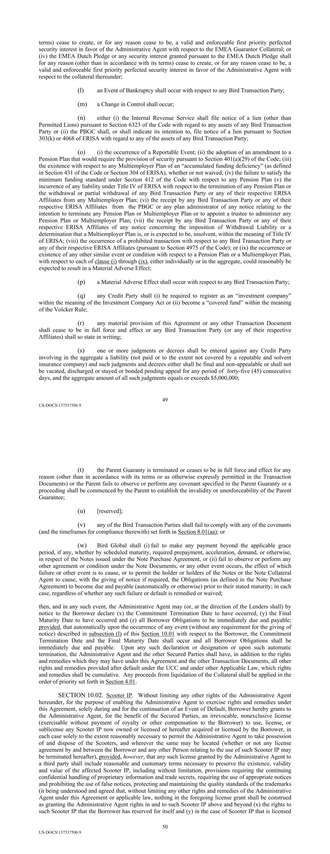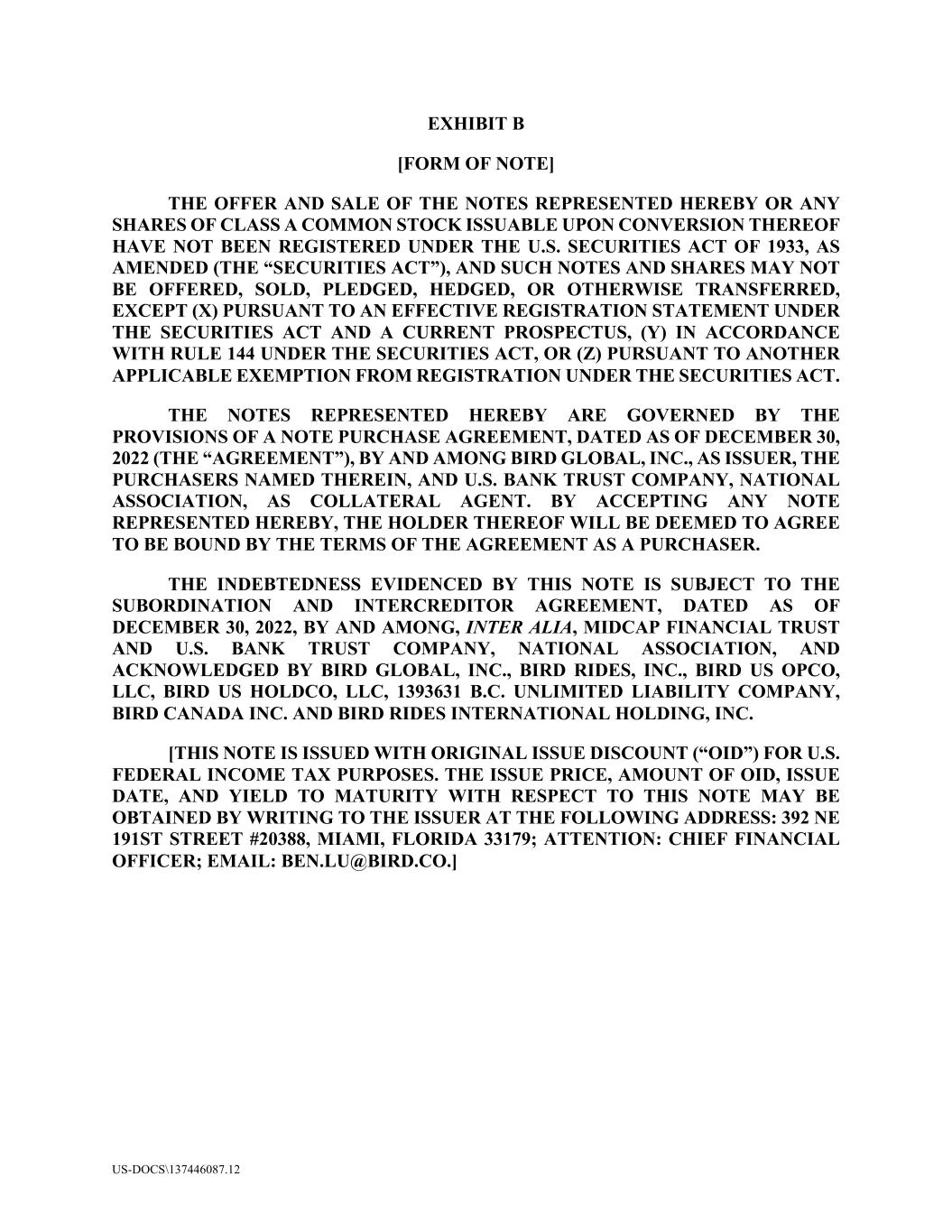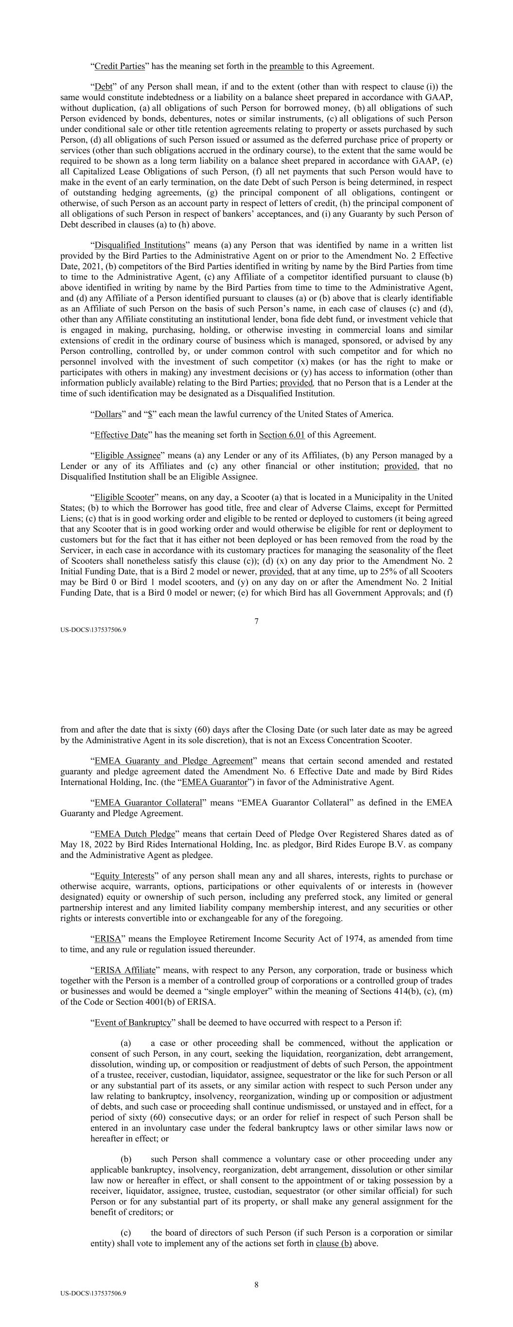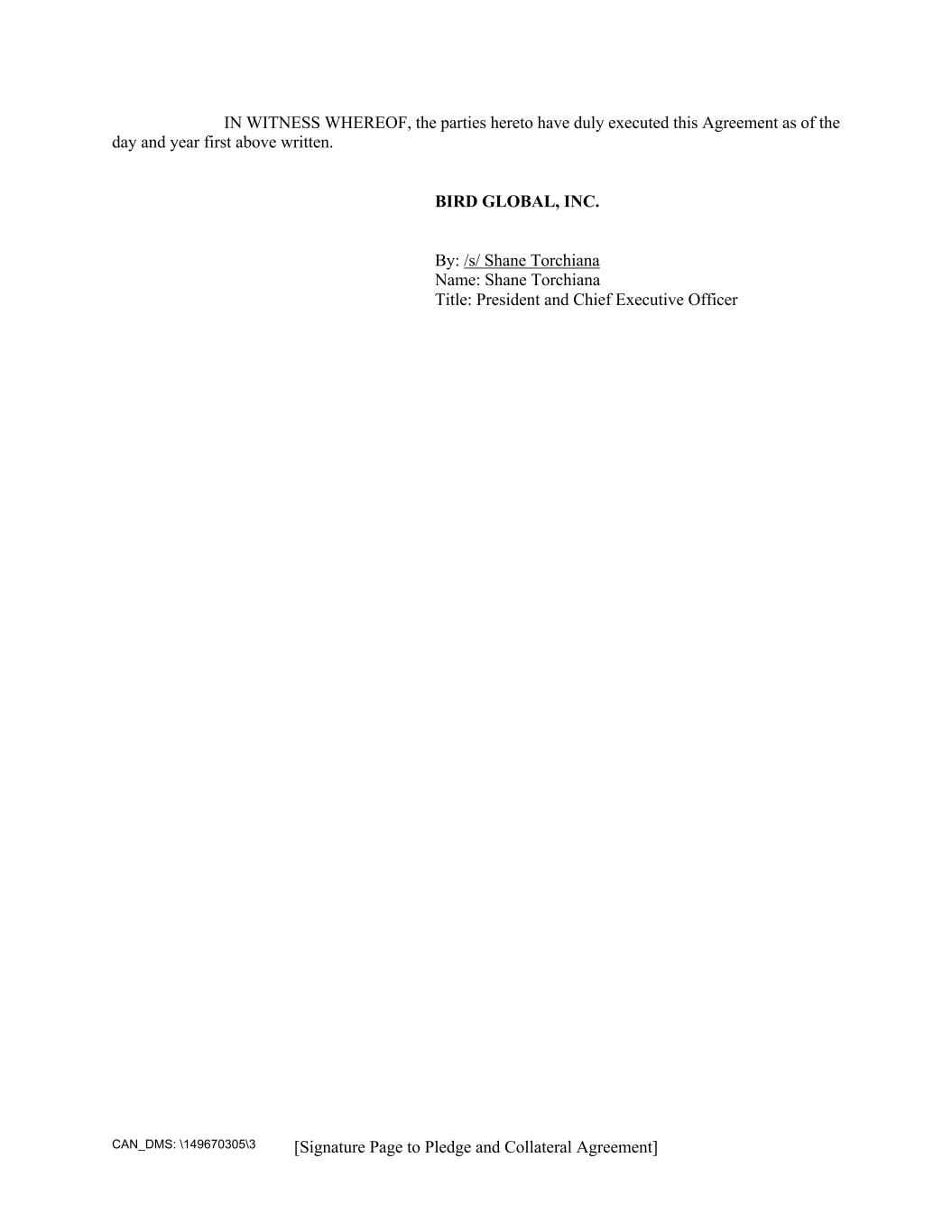 that certain guarantee, dated as of the Closing Date (the “Opco Guarantee”), by Bird Opco in favor of the Collateral Agent and the Note Purchasers, (ii) Bird US Holdco, LLC, an indirect subsidiary of the Company (“Bird Holdco”), pursuant to that certain guarantee, dated as of the Closing Date (the “Holdco Guarantee”), by Bird Holdco in favor of the Collateral Agent and the Note Purchasers, (iii) Bird Rides International Holding, Inc., an indirect subsidiary of the Company (“Bird Rides International”), pursuant to that certain guarantee, dated as of the Closing Date (the “Bird Rides International Guarantee”), by Bird Rides International in favor of the Collateral Agent and the Note Purchasers, and (iv) Bird Canada and the Purchaser, pursuant to that certain guarantee, dated as of the Closing Date (the “Bird Canada Guarantee”), by Bird Canada and the Purchaser in favor of the Collateral Agent and the Note Purchasers. The Notes are guaranteed on a senior unsecured basis by Bird Rides, Inc., a direct wholly owned subsidiary of the Company (“Bird Rides”), pursuant to that certain guarantee, dated as of the Closing Date (the “Bird Rides Guarantee”), by Bird Rides in favor of the Collateral Agent and the Note Purchasers. The obligations of the Notes are secured, pursuant to the Note Purchase Agreement, the Opco Guarantee, the Holdco Guarantee and the Bird Rides International Guarantee, as well as pursuant to (x) that certain pledge agreement, dated as of the Closing Date (the “Canadian Pledge Agreement”), among the Company and the Collateral Agent and (y) that certain pledge and collateral agreement, dated as of the Closing Date (the “Canadian Collateral Agreement”), among Bird Canada, the Purchaser and the Collateral Agent, (i) on a first-priority basis by all of the equity of Bird Rides, Bird Canada and the Purchaser, as well as substantially all assets of Bird Canada and the Purchaser and (ii) on a second-priority basis, subordinated to the secured obligations of the Amended Loan Agreement (as defined below), by all of the equity of Bird Opco, substantially all assets of Bird Holdco and Bird Opco and 65% of the equity of Bird Rides Europe B.V., an indirect subsidiary of the Company.