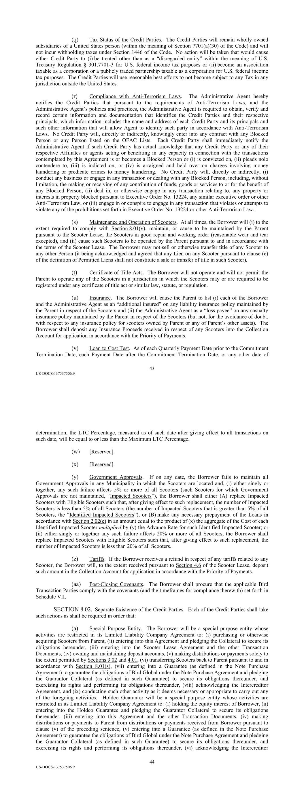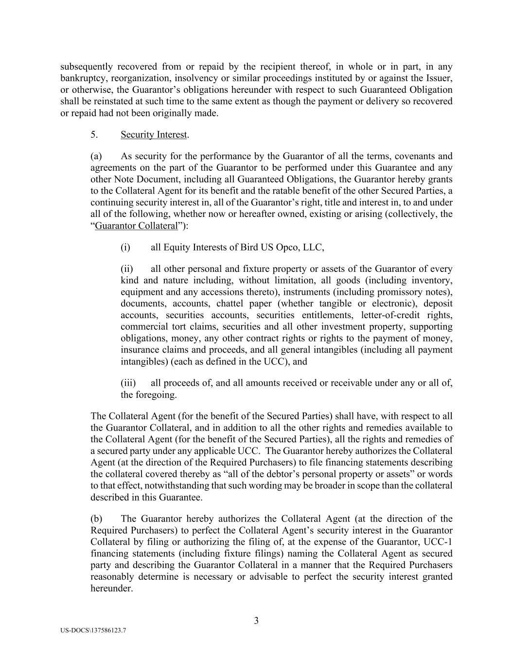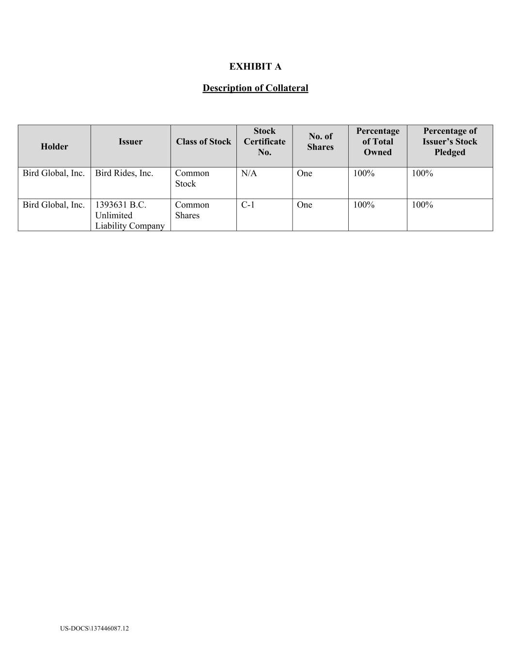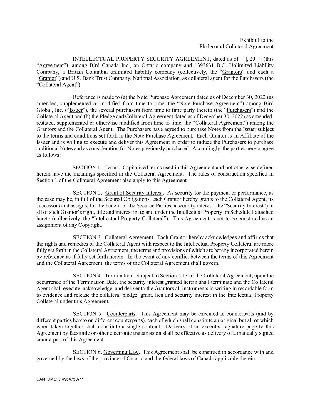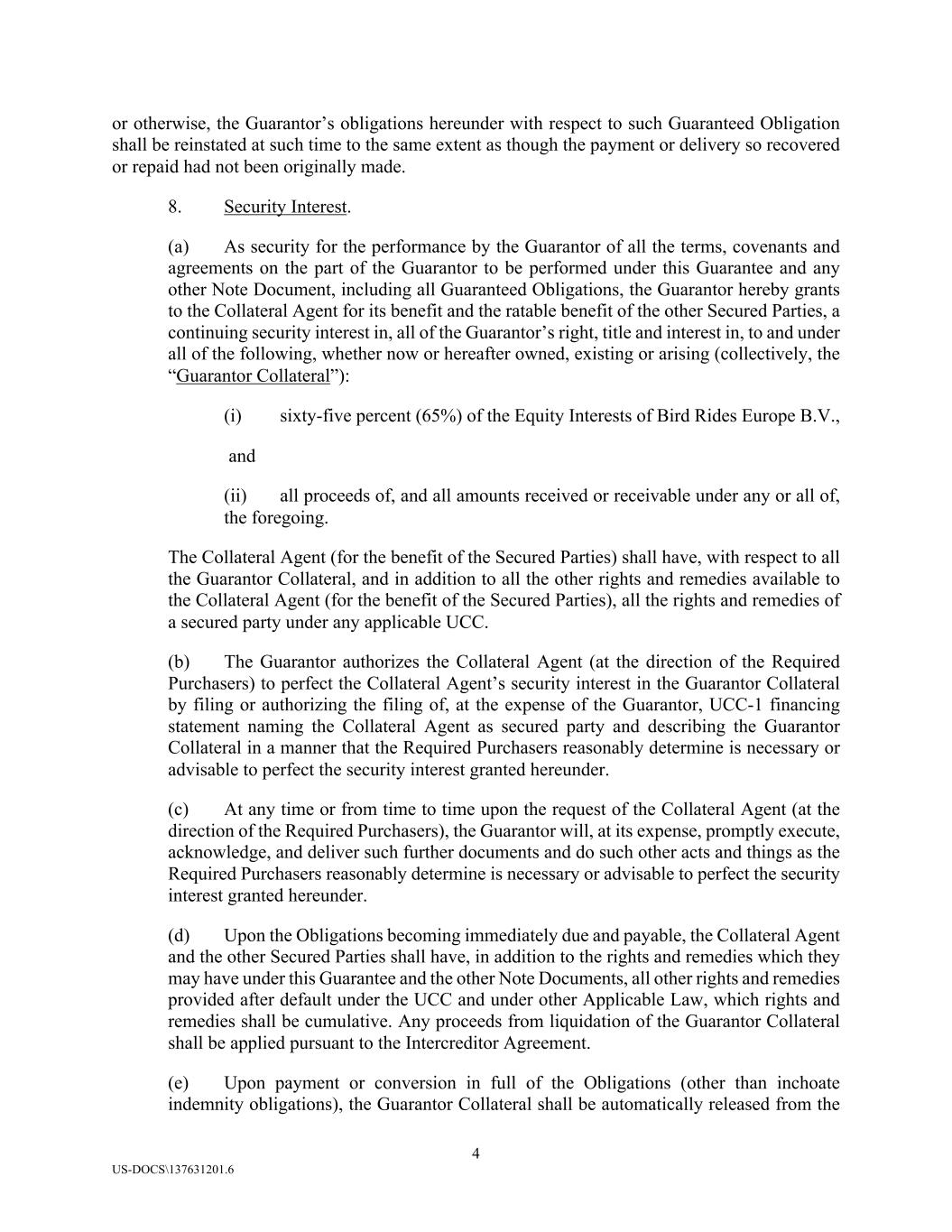 that certain guarantee, dated as of the Closing Date (the “Opco Guarantee”), by Bird Opco in favor of the Collateral Agent and the Note Purchasers, (ii) Bird US Holdco, LLC, an indirect subsidiary of the Company (“Bird Holdco”), pursuant to that certain guarantee, dated as of the Closing Date (the “Holdco Guarantee”), by Bird Holdco in favor of the Collateral Agent and the Note Purchasers, (iii) Bird Rides International Holding, Inc., an indirect subsidiary of the Company (“Bird Rides International”), pursuant to that certain guarantee, dated as of the Closing Date (the “Bird Rides International Guarantee”), by Bird Rides International in favor of the Collateral Agent and the Note Purchasers, and (iv) Bird Canada and the Purchaser, pursuant to that certain guarantee, dated as of the Closing Date (the “Bird Canada Guarantee”), by Bird Canada and the Purchaser in favor of the Collateral Agent and the Note Purchasers. The Notes are guaranteed on a senior unsecured basis by Bird Rides, Inc., a direct wholly owned subsidiary of the Company (“Bird Rides”), pursuant to that certain guarantee, dated as of the Closing Date (the “Bird Rides Guarantee”), by Bird Rides in favor of the Collateral Agent and the Note Purchasers. The obligations of the Notes are secured, pursuant to the Note Purchase Agreement, the Opco Guarantee, the Holdco Guarantee and the Bird Rides International Guarantee, as well as pursuant to (x) that certain pledge agreement, dated as of the Closing Date (the “Canadian Pledge Agreement”), among the Company and the Collateral Agent and (y) that certain pledge and collateral agreement, dated as of the Closing Date (the “Canadian Collateral Agreement”), among Bird Canada, the Purchaser and the Collateral Agent, (i) on a first-priority basis by all of the equity of Bird Rides, Bird Canada and the Purchaser, as well as substantially all assets of Bird Canada and the Purchaser and (ii) on a second-priority basis, subordinated to the secured obligations of the Amended Loan Agreement (as defined below), by all of the equity of Bird Opco, substantially all assets of Bird Holdco and Bird Opco and 65% of the equity of Bird Rides Europe B.V., an indirect subsidiary of the Company.