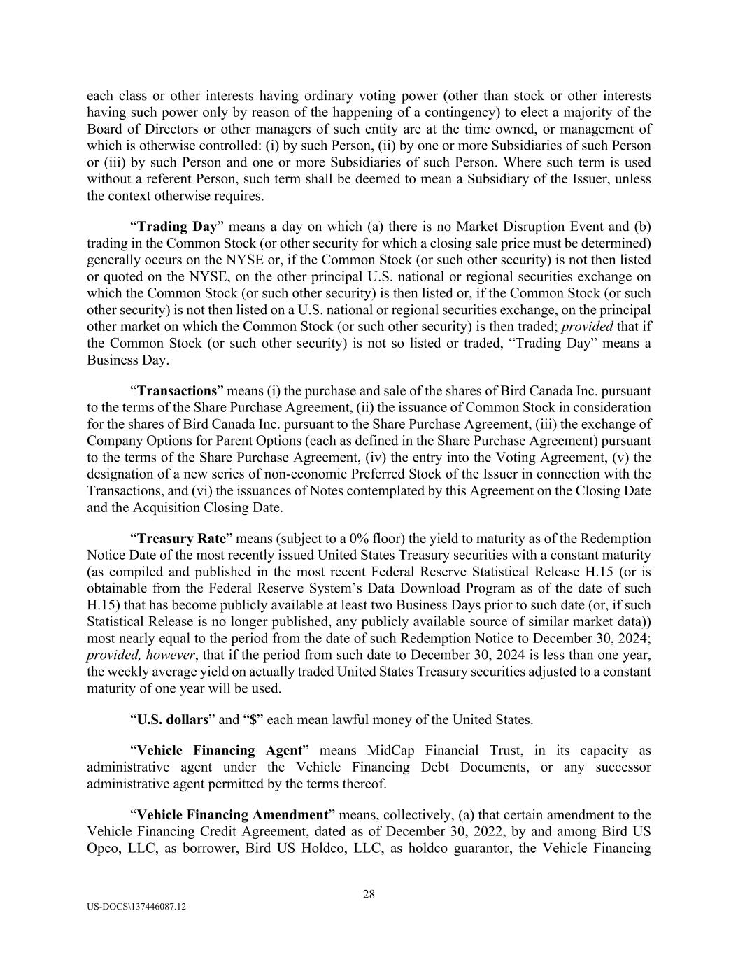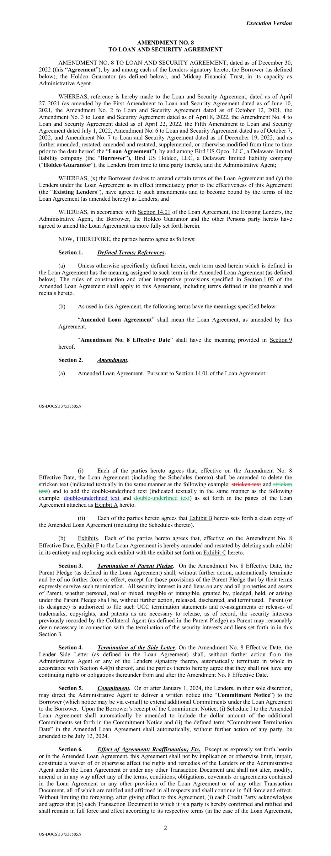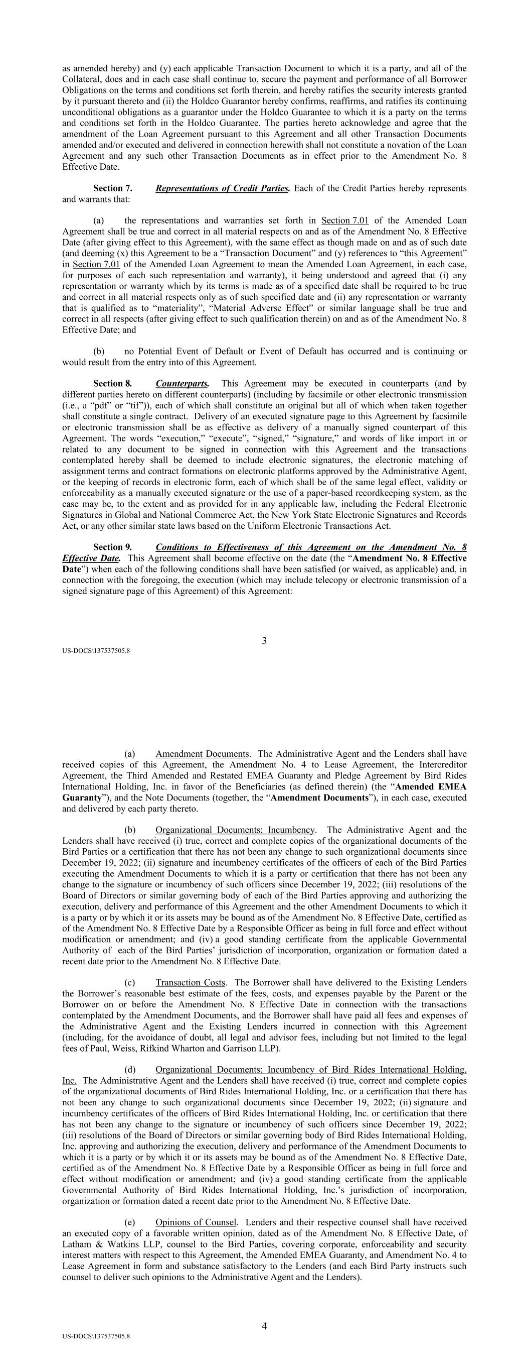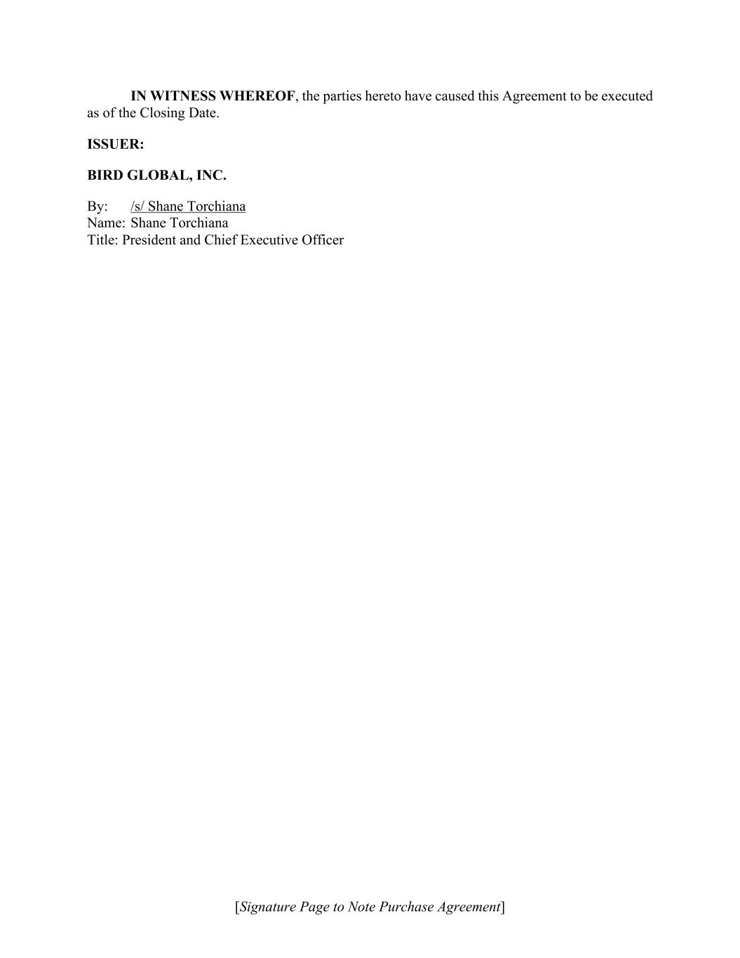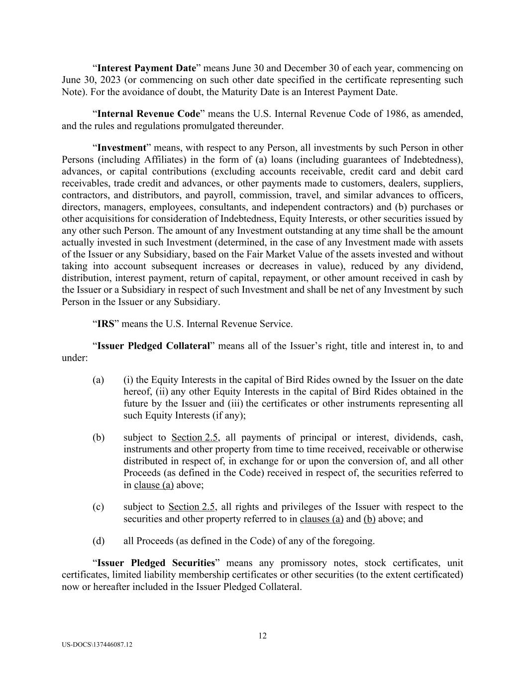 that certain guarantee, dated as of the Closing Date (the “Opco Guarantee”), by Bird Opco in favor of the Collateral Agent and the Note Purchasers, (ii) Bird US Holdco, LLC, an indirect subsidiary of the Company (“Bird Holdco”), pursuant to that certain guarantee, dated as of the Closing Date (the “Holdco Guarantee”), by Bird Holdco in favor of the Collateral Agent and the Note Purchasers, (iii) Bird Rides International Holding, Inc., an indirect subsidiary of the Company (“Bird Rides International”), pursuant to that certain guarantee, dated as of the Closing Date (the “Bird Rides International Guarantee”), by Bird Rides International in favor of the Collateral Agent and the Note Purchasers, and (iv) Bird Canada and the Purchaser, pursuant to that certain guarantee, dated as of the Closing Date (the “Bird Canada Guarantee”), by Bird Canada and the Purchaser in favor of the Collateral Agent and the Note Purchasers. The Notes are guaranteed on a senior unsecured basis by Bird Rides, Inc., a direct wholly owned subsidiary of the Company (“Bird Rides”), pursuant to that certain guarantee, dated as of the Closing Date (the “Bird Rides Guarantee”), by Bird Rides in favor of the Collateral Agent and the Note Purchasers. The obligations of the Notes are secured, pursuant to the Note Purchase Agreement, the Opco Guarantee, the Holdco Guarantee and the Bird Rides International Guarantee, as well as pursuant to (x) that certain pledge agreement, dated as of the Closing Date (the “Canadian Pledge Agreement”), among the Company and the Collateral Agent and (y) that certain pledge and collateral agreement, dated as of the Closing Date (the “Canadian Collateral Agreement”), among Bird Canada, the Purchaser and the Collateral Agent, (i) on a first-priority basis by all of the equity of Bird Rides, Bird Canada and the Purchaser, as well as substantially all assets of Bird Canada and the Purchaser and (ii) on a second-priority basis, subordinated to the secured obligations of the Amended Loan Agreement (as defined below), by all of the equity of Bird Opco, substantially all assets of Bird Holdco and Bird Opco and 65% of the equity of Bird Rides Europe B.V., an indirect subsidiary of the Company.