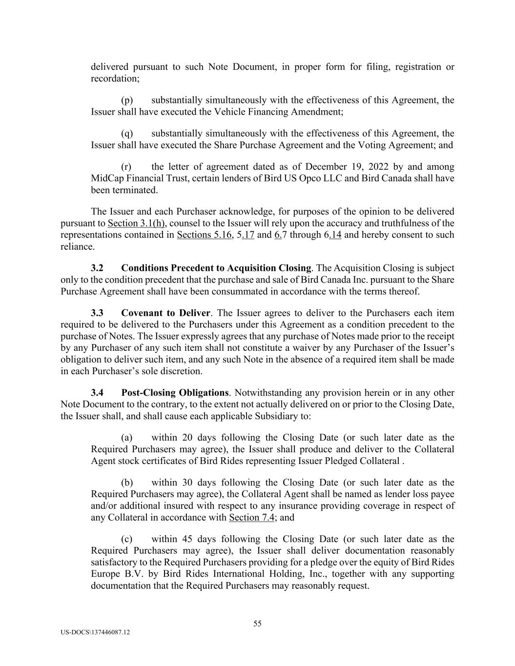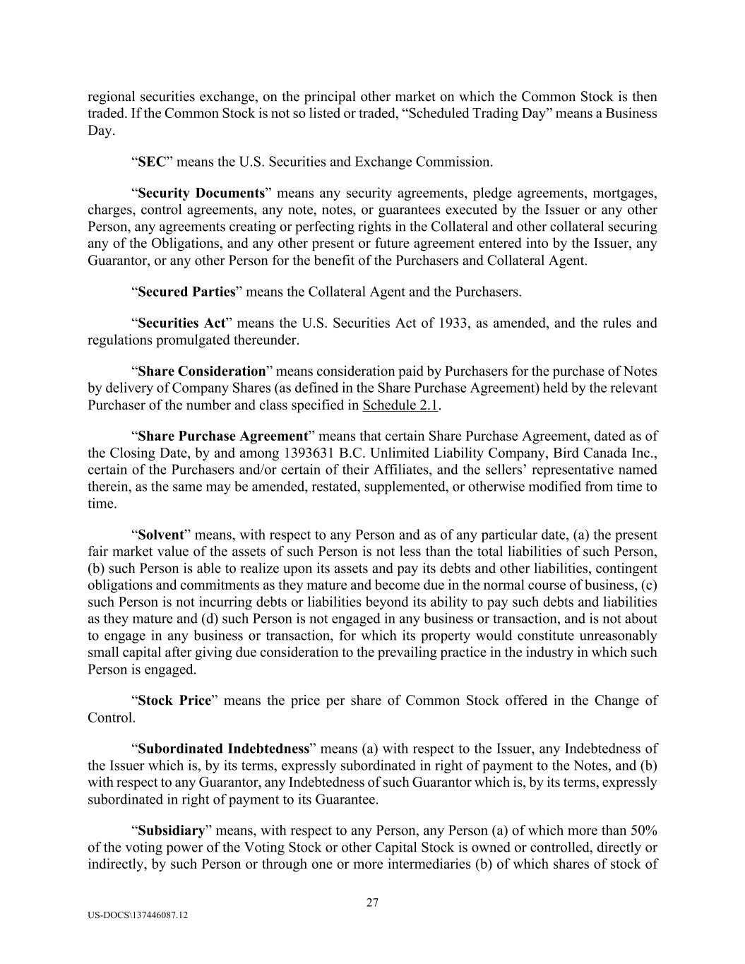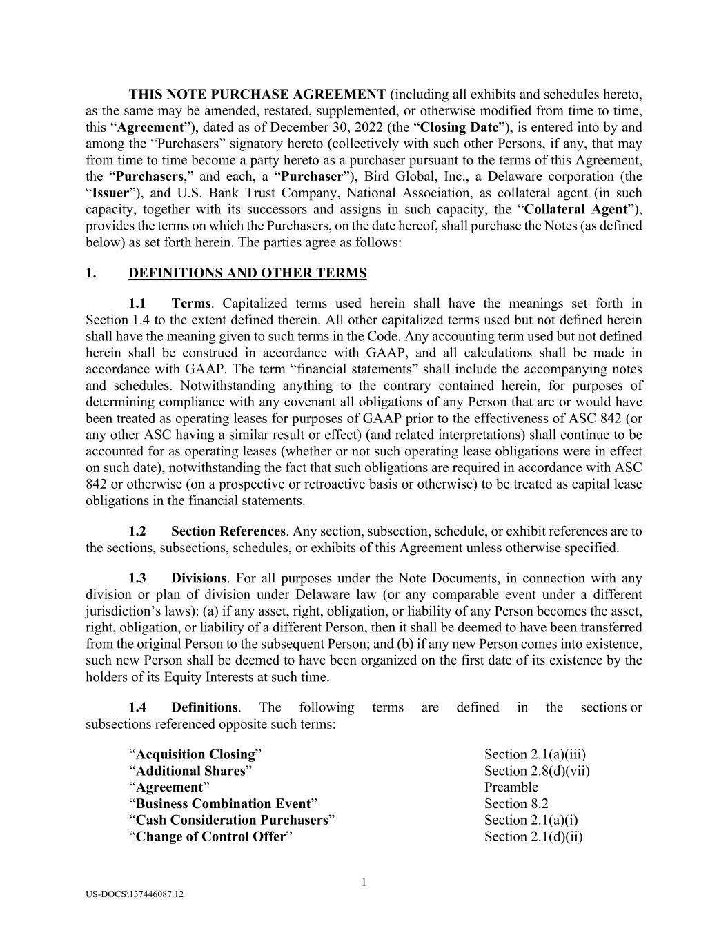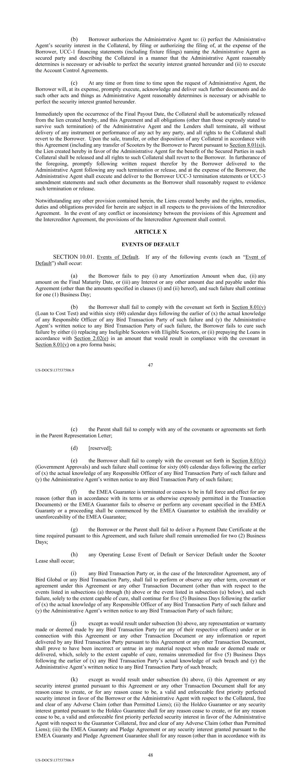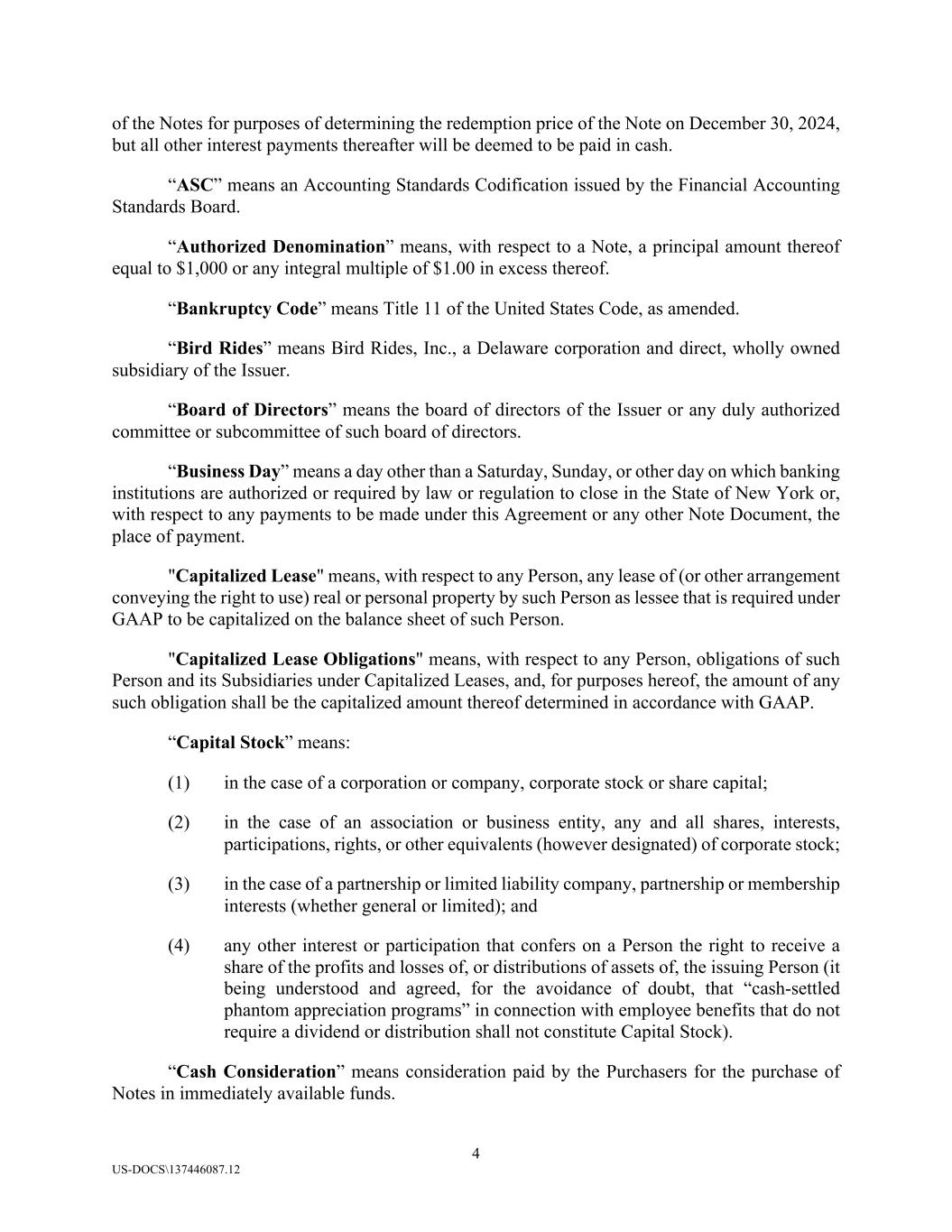 that certain guarantee, dated as of the Closing Date (the “Opco Guarantee”), by Bird Opco in favor of the Collateral Agent and the Note Purchasers, (ii) Bird US Holdco, LLC, an indirect subsidiary of the Company (“Bird Holdco”), pursuant to that certain guarantee, dated as of the Closing Date (the “Holdco Guarantee”), by Bird Holdco in favor of the Collateral Agent and the Note Purchasers, (iii) Bird Rides International Holding, Inc., an indirect subsidiary of the Company (“Bird Rides International”), pursuant to that certain guarantee, dated as of the Closing Date (the “Bird Rides International Guarantee”), by Bird Rides International in favor of the Collateral Agent and the Note Purchasers, and (iv) Bird Canada and the Purchaser, pursuant to that certain guarantee, dated as of the Closing Date (the “Bird Canada Guarantee”), by Bird Canada and the Purchaser in favor of the Collateral Agent and the Note Purchasers. The Notes are guaranteed on a senior unsecured basis by Bird Rides, Inc., a direct wholly owned subsidiary of the Company (“Bird Rides”), pursuant to that certain guarantee, dated as of the Closing Date (the “Bird Rides Guarantee”), by Bird Rides in favor of the Collateral Agent and the Note Purchasers. The obligations of the Notes are secured, pursuant to the Note Purchase Agreement, the Opco Guarantee, the Holdco Guarantee and the Bird Rides International Guarantee, as well as pursuant to (x) that certain pledge agreement, dated as of the Closing Date (the “Canadian Pledge Agreement”), among the Company and the Collateral Agent and (y) that certain pledge and collateral agreement, dated as of the Closing Date (the “Canadian Collateral Agreement”), among Bird Canada, the Purchaser and the Collateral Agent, (i) on a first-priority basis by all of the equity of Bird Rides, Bird Canada and the Purchaser, as well as substantially all assets of Bird Canada and the Purchaser and (ii) on a second-priority basis, subordinated to the secured obligations of the Amended Loan Agreement (as defined below), by all of the equity of Bird Opco, substantially all assets of Bird Holdco and Bird Opco and 65% of the equity of Bird Rides Europe B.V., an indirect subsidiary of the Company.
