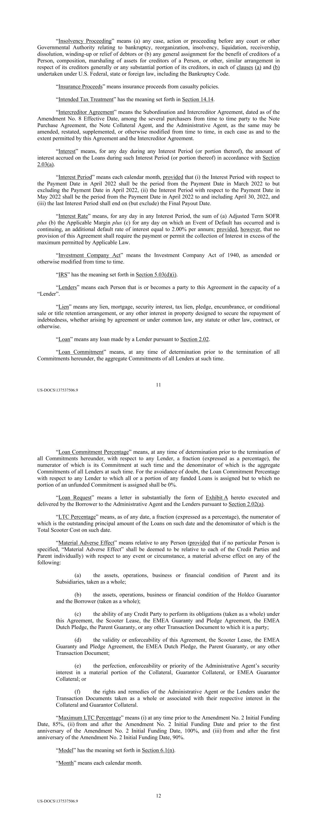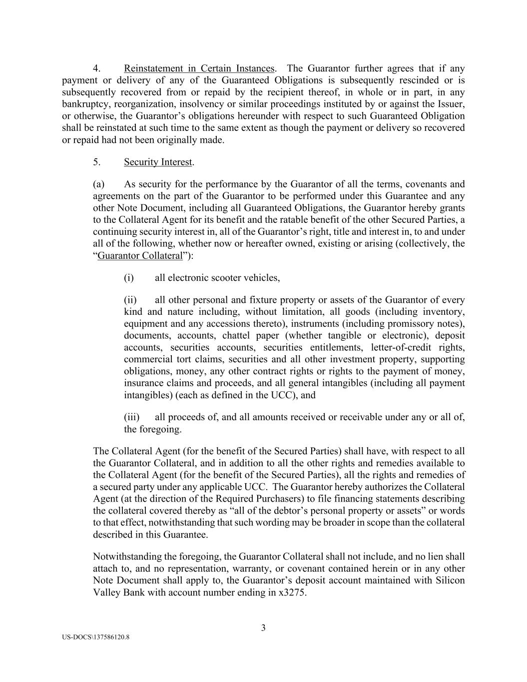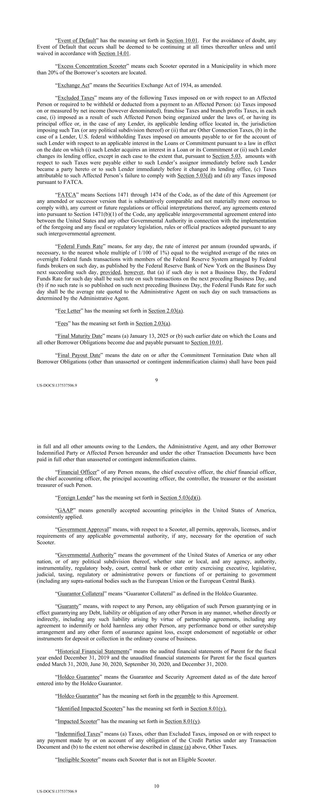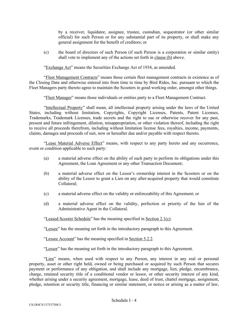that certain guarantee, dated as of the Closing Date (the “Opco Guarantee”), by Bird Opco in favor of the Collateral Agent and the Note Purchasers, (ii) Bird US Holdco, LLC, an indirect subsidiary of the Company (“Bird Holdco”), pursuant to that certain guarantee, dated as of the Closing Date (the “Holdco Guarantee”), by Bird Holdco in favor of the Collateral Agent and the Note Purchasers, (iii) Bird Rides International Holding, Inc., an indirect subsidiary of the Company (“Bird Rides International”), pursuant to that certain guarantee, dated as of the Closing Date (the “Bird Rides International Guarantee”), by Bird Rides International in favor of the Collateral Agent and the Note Purchasers, and (iv) Bird Canada and the Purchaser, pursuant to that certain guarantee, dated as of the Closing Date (the “Bird Canada Guarantee”), by Bird Canada and the Purchaser in favor of the Collateral Agent and the Note Purchasers. The Notes are guaranteed on a senior unsecured basis by Bird Rides, Inc., a direct wholly owned subsidiary of the Company (“Bird Rides”), pursuant to that certain guarantee, dated as of the Closing Date (the “Bird Rides Guarantee”), by Bird Rides in favor of the Collateral Agent and the Note Purchasers. The obligations of the Notes are secured, pursuant to the Note Purchase Agreement, the Opco Guarantee, the Holdco Guarantee and the Bird Rides International Guarantee, as well as pursuant to (x) that certain pledge agreement, dated as of the Closing Date (the “Canadian Pledge Agreement”), among the Company and the Collateral Agent and (y) that certain pledge and collateral agreement, dated as of the Closing Date (the “Canadian Collateral Agreement”), among Bird Canada, the Purchaser and the Collateral Agent, (i) on a first-priority basis by all of the equity of Bird Rides, Bird Canada and the Purchaser, as well as substantially all assets of Bird Canada and the Purchaser and (ii) on a second-priority basis, subordinated to the secured obligations of the Amended Loan Agreement (as defined below), by all of the equity of Bird Opco, substantially all assets of Bird Holdco and Bird Opco and 65% of the equity of Bird Rides Europe B.V., an indirect subsidiary of the Company.