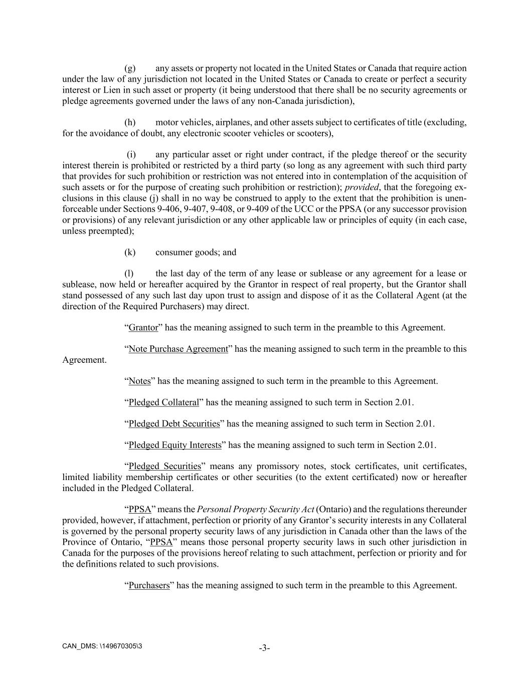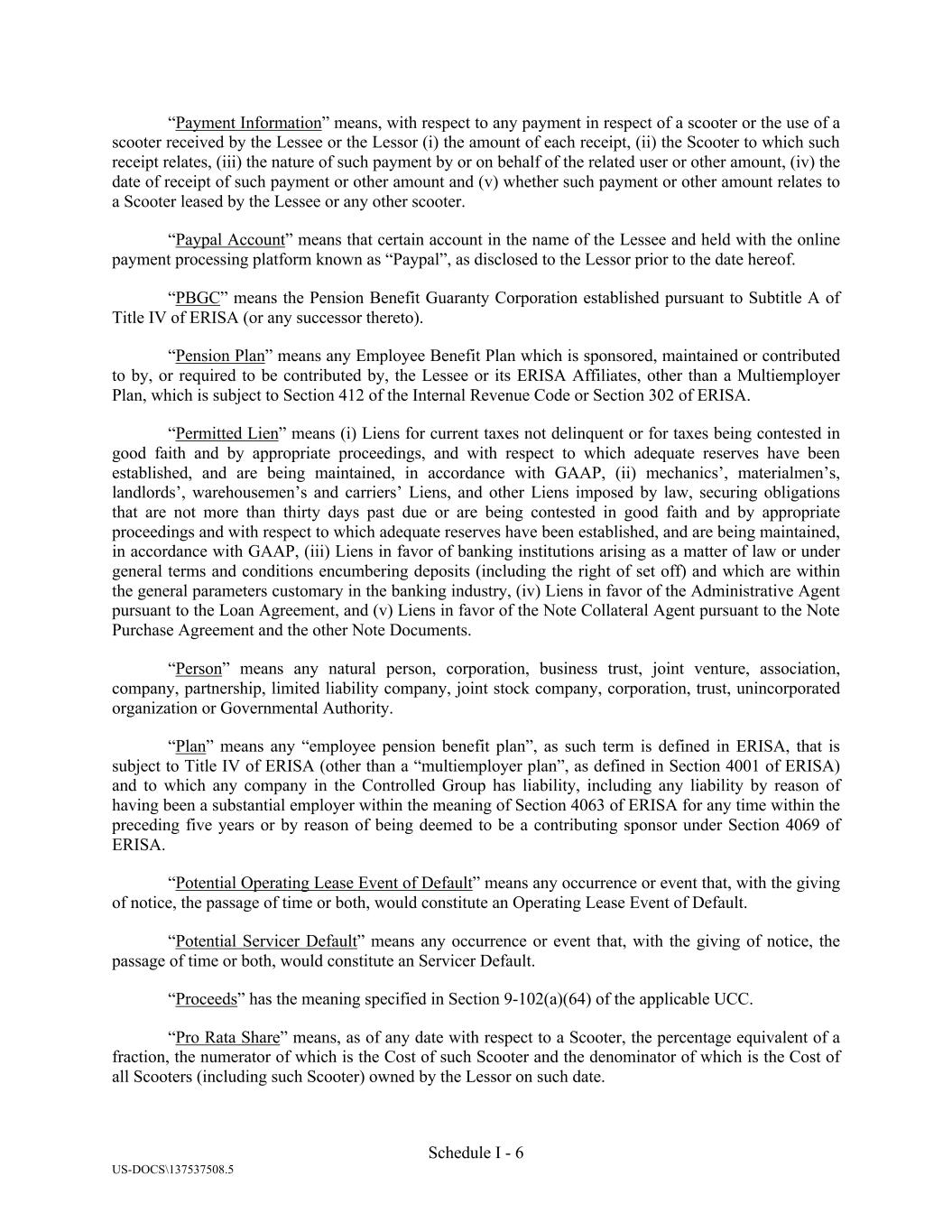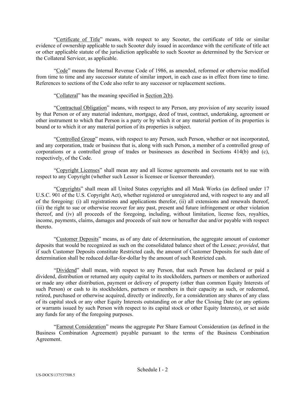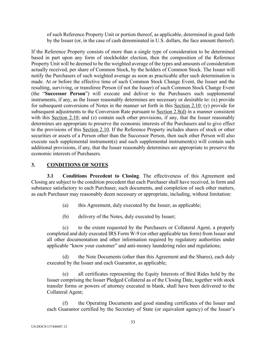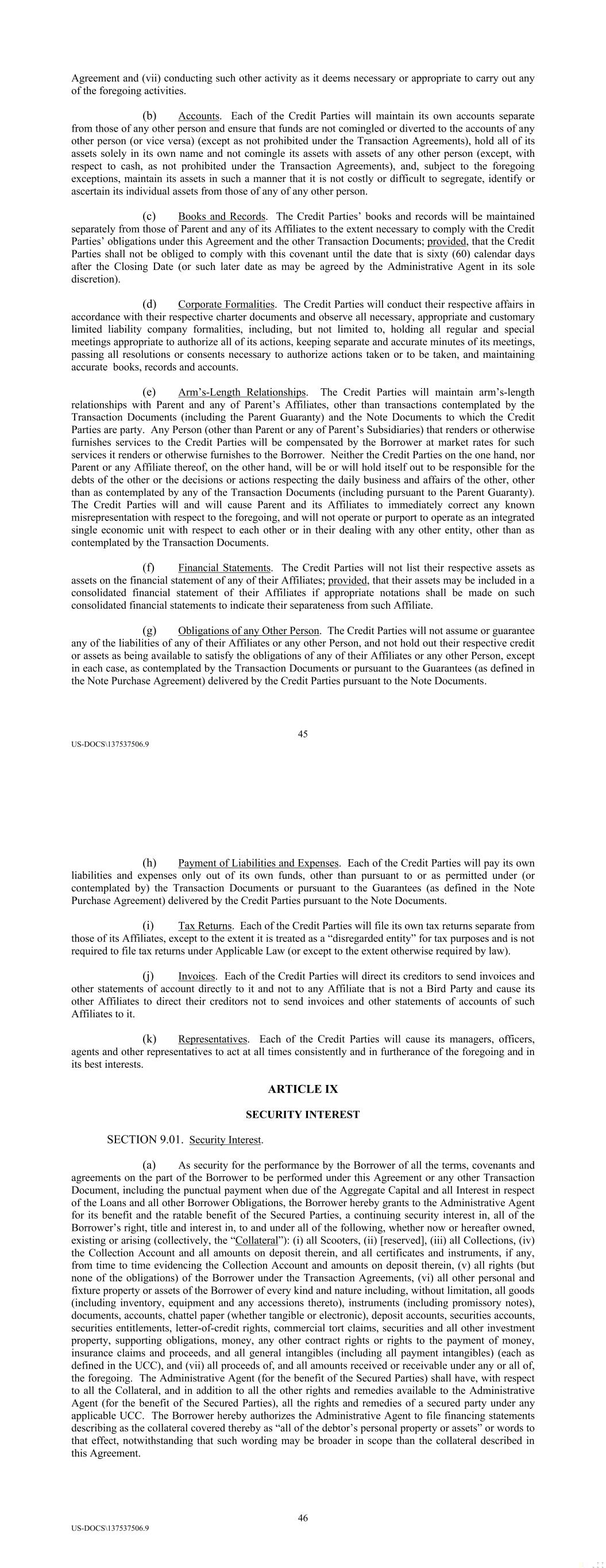 that certain guarantee, dated as of the Closing Date (the “Opco Guarantee”), by Bird Opco in favor of the Collateral Agent and the Note Purchasers, (ii) Bird US Holdco, LLC, an indirect subsidiary of the Company (“Bird Holdco”), pursuant to that certain guarantee, dated as of the Closing Date (the “Holdco Guarantee”), by Bird Holdco in favor of the Collateral Agent and the Note Purchasers, (iii) Bird Rides International Holding, Inc., an indirect subsidiary of the Company (“Bird Rides International”), pursuant to that certain guarantee, dated as of the Closing Date (the “Bird Rides International Guarantee”), by Bird Rides International in favor of the Collateral Agent and the Note Purchasers, and (iv) Bird Canada and the Purchaser, pursuant to that certain guarantee, dated as of the Closing Date (the “Bird Canada Guarantee”), by Bird Canada and the Purchaser in favor of the Collateral Agent and the Note Purchasers. The Notes are guaranteed on a senior unsecured basis by Bird Rides, Inc., a direct wholly owned subsidiary of the Company (“Bird Rides”), pursuant to that certain guarantee, dated as of the Closing Date (the “Bird Rides Guarantee”), by Bird Rides in favor of the Collateral Agent and the Note Purchasers. The obligations of the Notes are secured, pursuant to the Note Purchase Agreement, the Opco Guarantee, the Holdco Guarantee and the Bird Rides International Guarantee, as well as pursuant to (x) that certain pledge agreement, dated as of the Closing Date (the “Canadian Pledge Agreement”), among the Company and the Collateral Agent and (y) that certain pledge and collateral agreement, dated as of the Closing Date (the “Canadian Collateral Agreement”), among Bird Canada, the Purchaser and the Collateral Agent, (i) on a first-priority basis by all of the equity of Bird Rides, Bird Canada and the Purchaser, as well as substantially all assets of Bird Canada and the Purchaser and (ii) on a second-priority basis, subordinated to the secured obligations of the Amended Loan Agreement (as defined below), by all of the equity of Bird Opco, substantially all assets of Bird Holdco and Bird Opco and 65% of the equity of Bird Rides Europe B.V., an indirect subsidiary of the Company.