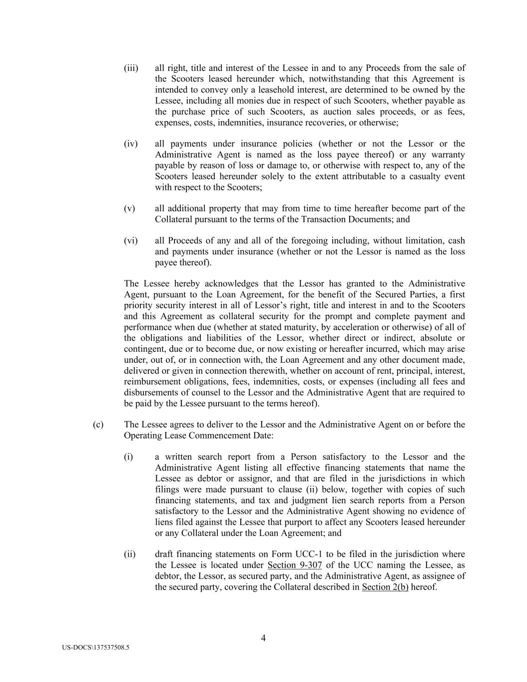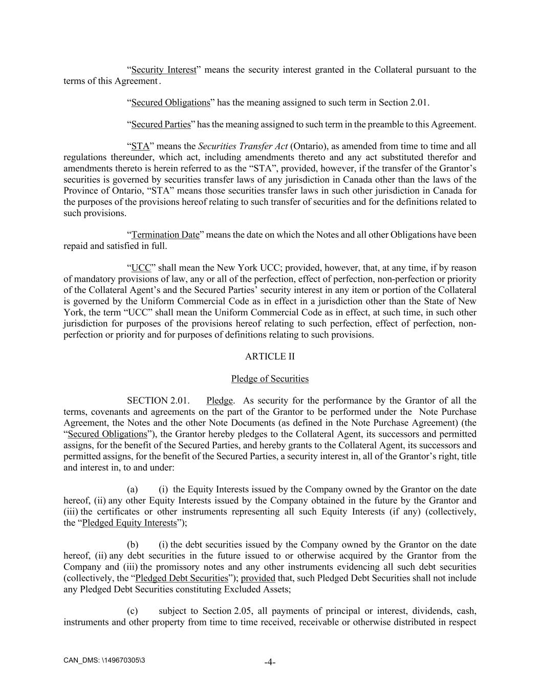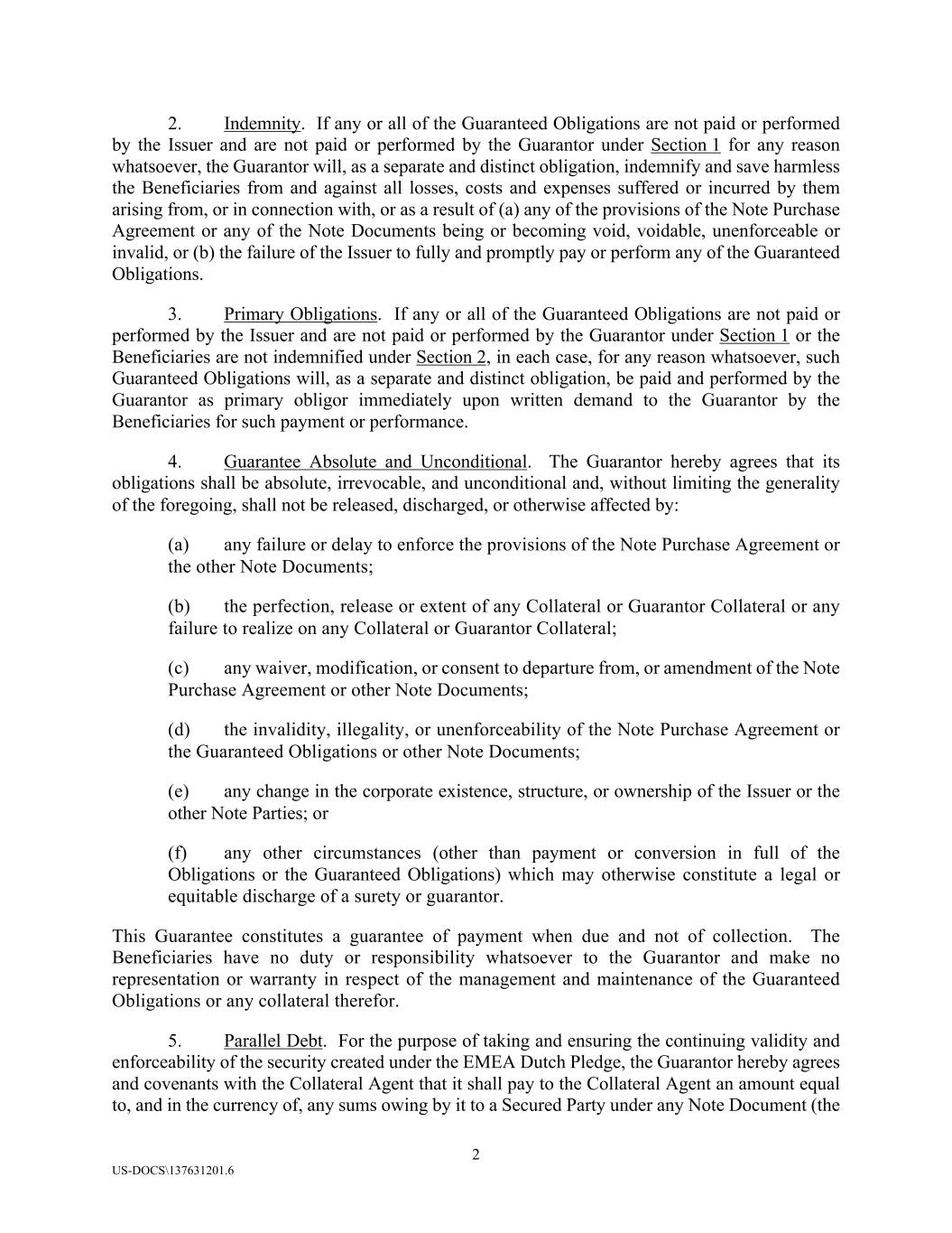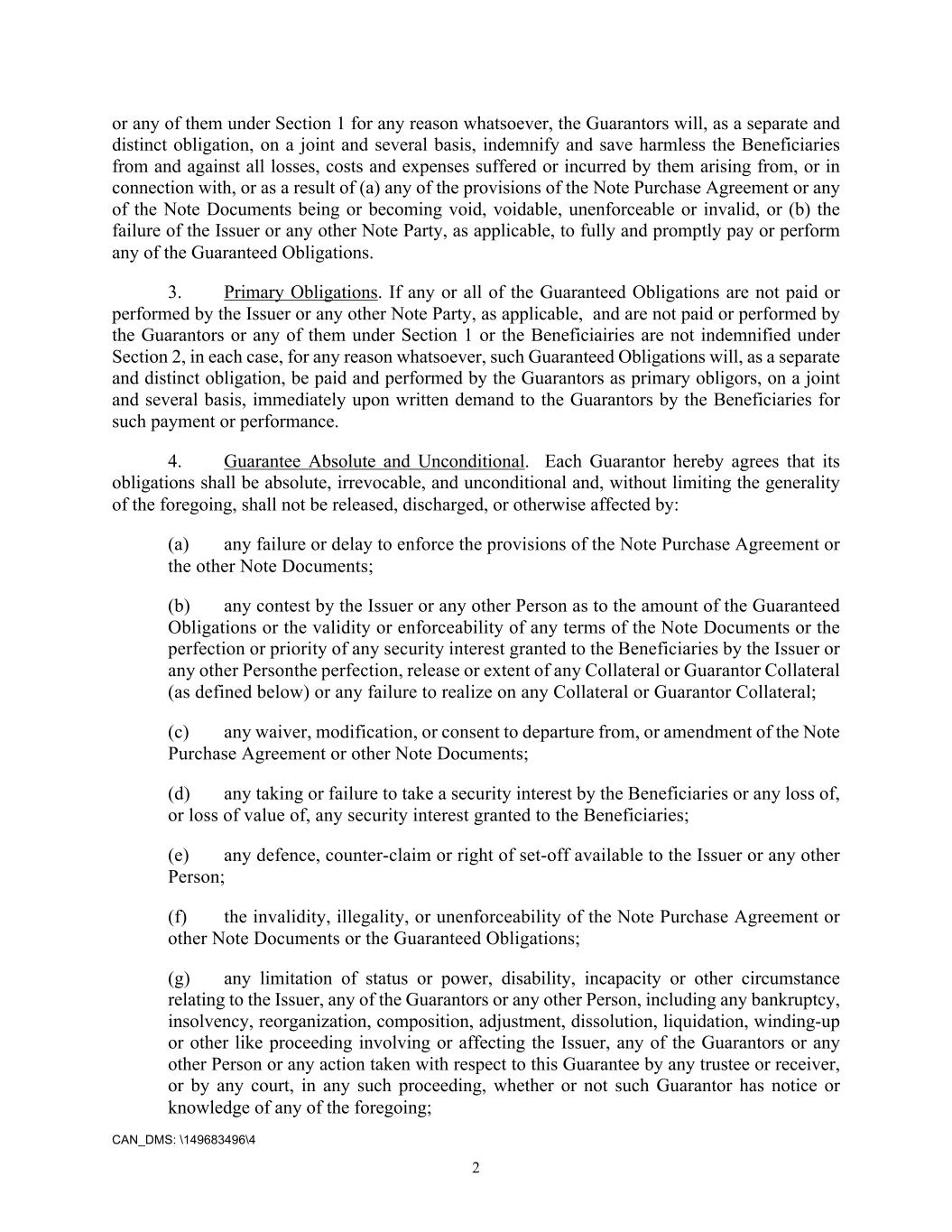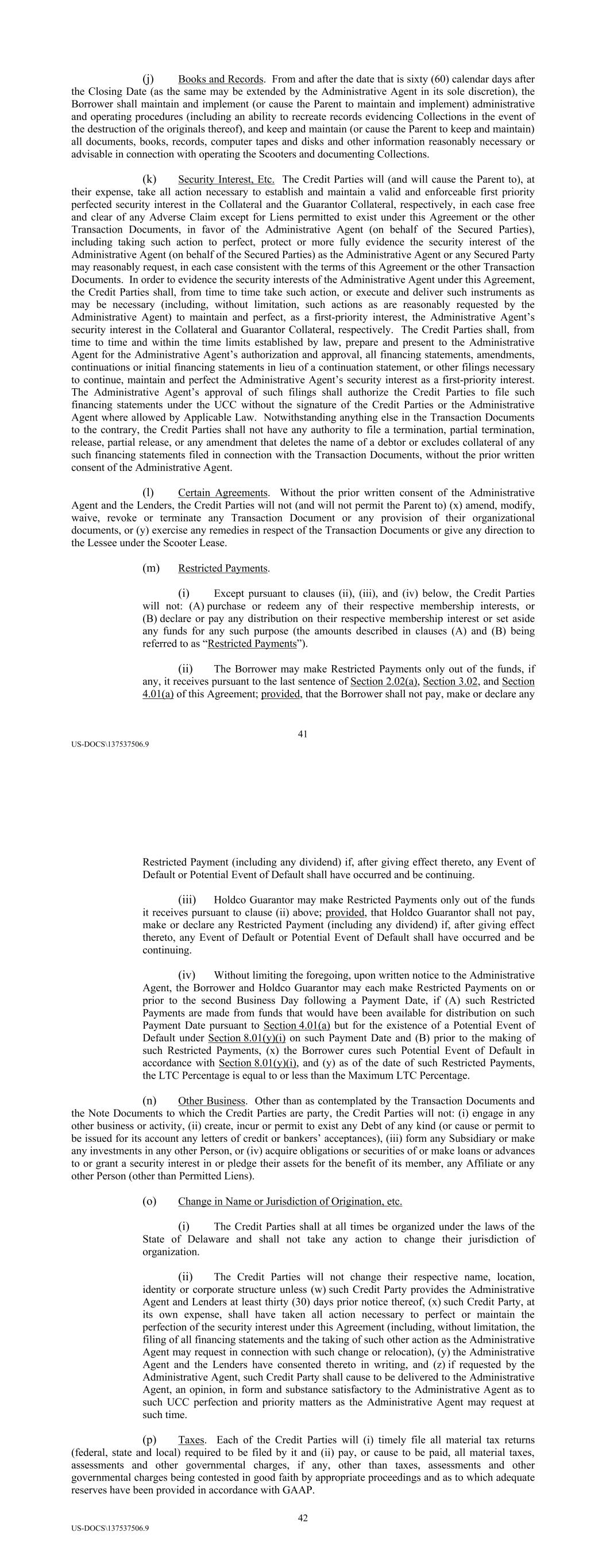 that certain guarantee, dated as of the Closing Date (the “Opco Guarantee”), by Bird Opco in favor of the Collateral Agent and the Note Purchasers, (ii) Bird US Holdco, LLC, an indirect subsidiary of the Company (“Bird Holdco”), pursuant to that certain guarantee, dated as of the Closing Date (the “Holdco Guarantee”), by Bird Holdco in favor of the Collateral Agent and the Note Purchasers, (iii) Bird Rides International Holding, Inc., an indirect subsidiary of the Company (“Bird Rides International”), pursuant to that certain guarantee, dated as of the Closing Date (the “Bird Rides International Guarantee”), by Bird Rides International in favor of the Collateral Agent and the Note Purchasers, and (iv) Bird Canada and the Purchaser, pursuant to that certain guarantee, dated as of the Closing Date (the “Bird Canada Guarantee”), by Bird Canada and the Purchaser in favor of the Collateral Agent and the Note Purchasers. The Notes are guaranteed on a senior unsecured basis by Bird Rides, Inc., a direct wholly owned subsidiary of the Company (“Bird Rides”), pursuant to that certain guarantee, dated as of the Closing Date (the “Bird Rides Guarantee”), by Bird Rides in favor of the Collateral Agent and the Note Purchasers. The obligations of the Notes are secured, pursuant to the Note Purchase Agreement, the Opco Guarantee, the Holdco Guarantee and the Bird Rides International Guarantee, as well as pursuant to (x) that certain pledge agreement, dated as of the Closing Date (the “Canadian Pledge Agreement”), among the Company and the Collateral Agent and (y) that certain pledge and collateral agreement, dated as of the Closing Date (the “Canadian Collateral Agreement”), among Bird Canada, the Purchaser and the Collateral Agent, (i) on a first-priority basis by all of the equity of Bird Rides, Bird Canada and the Purchaser, as well as substantially all assets of Bird Canada and the Purchaser and (ii) on a second-priority basis, subordinated to the secured obligations of the Amended Loan Agreement (as defined below), by all of the equity of Bird Opco, substantially all assets of Bird Holdco and Bird Opco and 65% of the equity of Bird Rides Europe B.V., an indirect subsidiary of the Company.