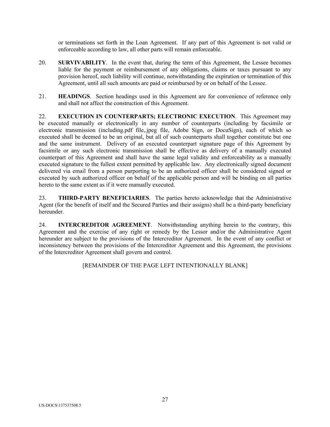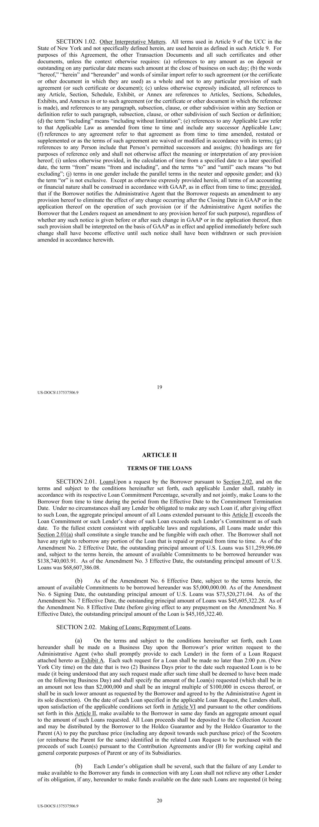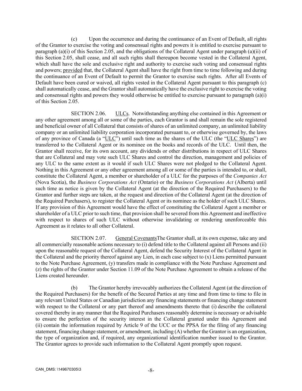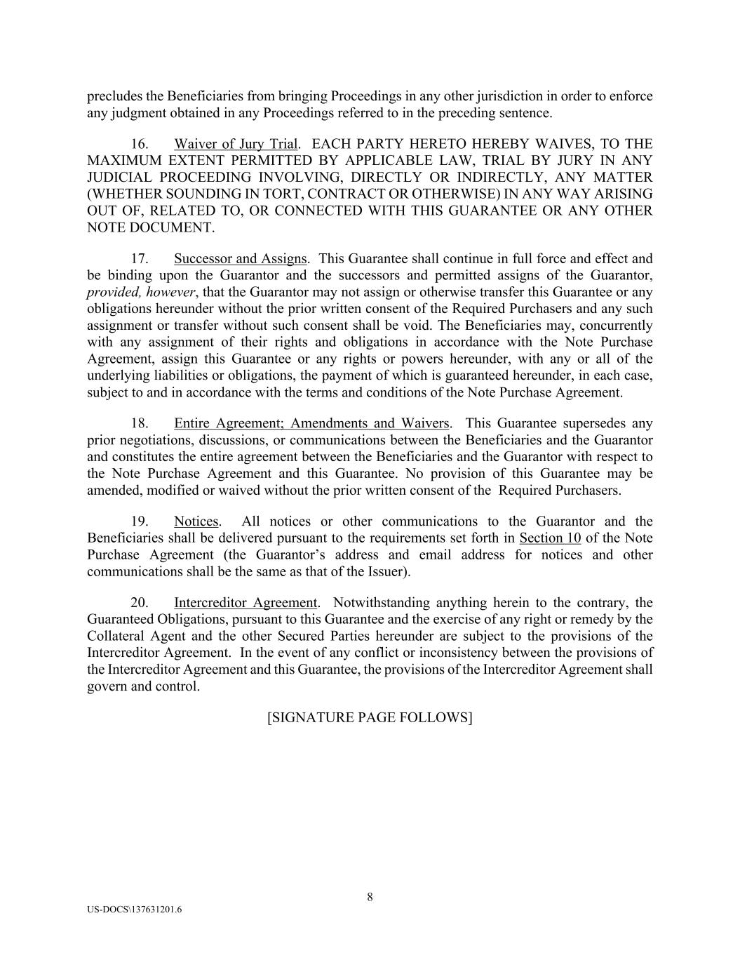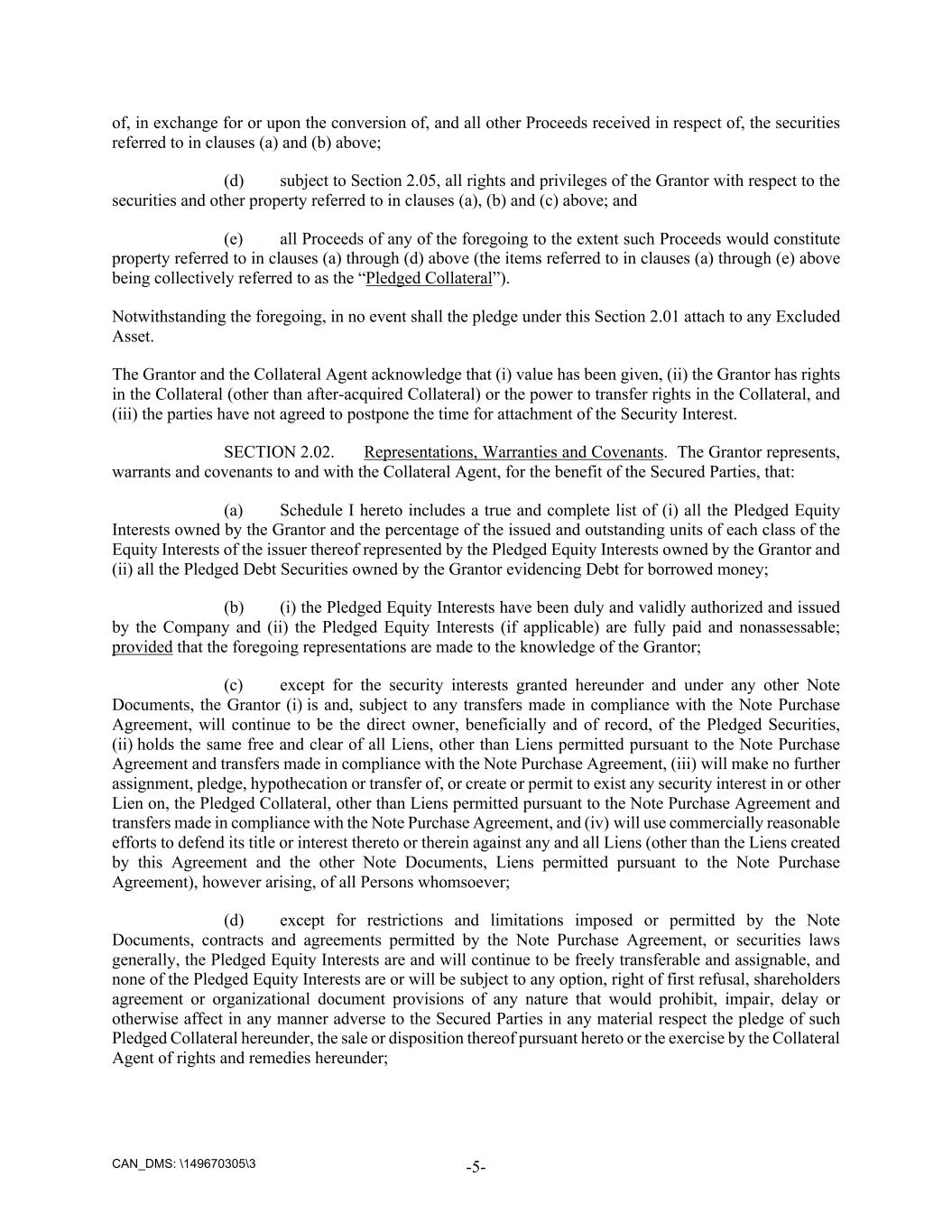 that certain guarantee, dated as of the Closing Date (the “Opco Guarantee”), by Bird Opco in favor of the Collateral Agent and the Note Purchasers, (ii) Bird US Holdco, LLC, an indirect subsidiary of the Company (“Bird Holdco”), pursuant to that certain guarantee, dated as of the Closing Date (the “Holdco Guarantee”), by Bird Holdco in favor of the Collateral Agent and the Note Purchasers, (iii) Bird Rides International Holding, Inc., an indirect subsidiary of the Company (“Bird Rides International”), pursuant to that certain guarantee, dated as of the Closing Date (the “Bird Rides International Guarantee”), by Bird Rides International in favor of the Collateral Agent and the Note Purchasers, and (iv) Bird Canada and the Purchaser, pursuant to that certain guarantee, dated as of the Closing Date (the “Bird Canada Guarantee”), by Bird Canada and the Purchaser in favor of the Collateral Agent and the Note Purchasers. The Notes are guaranteed on a senior unsecured basis by Bird Rides, Inc., a direct wholly owned subsidiary of the Company (“Bird Rides”), pursuant to that certain guarantee, dated as of the Closing Date (the “Bird Rides Guarantee”), by Bird Rides in favor of the Collateral Agent and the Note Purchasers. The obligations of the Notes are secured, pursuant to the Note Purchase Agreement, the Opco Guarantee, the Holdco Guarantee and the Bird Rides International Guarantee, as well as pursuant to (x) that certain pledge agreement, dated as of the Closing Date (the “Canadian Pledge Agreement”), among the Company and the Collateral Agent and (y) that certain pledge and collateral agreement, dated as of the Closing Date (the “Canadian Collateral Agreement”), among Bird Canada, the Purchaser and the Collateral Agent, (i) on a first-priority basis by all of the equity of Bird Rides, Bird Canada and the Purchaser, as well as substantially all assets of Bird Canada and the Purchaser and (ii) on a second-priority basis, subordinated to the secured obligations of the Amended Loan Agreement (as defined below), by all of the equity of Bird Opco, substantially all assets of Bird Holdco and Bird Opco and 65% of the equity of Bird Rides Europe B.V., an indirect subsidiary of the Company.